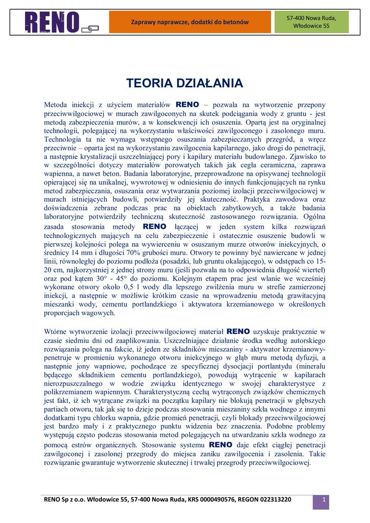 Zaprawy naprawcze, dodatki do betonów 57-400 Nowa Ruda, Włodowice 55 TEORIA DZIAŁANIA Metoda iniekcji z użyciem materiałów RENO – pozwala na wytworzenie przepony przeciwwilgociowej w murach zawilgoconych na skutek podciągania wody z gruntu - jest metodą zabezpieczenia murów, a w konsekwencji ich osuszenia. Opartą jest na oryginalnej technologii, polegającej na wykorzystaniu właściwości zawilgoconego i zasolonego muru. Technologia ta nie wymaga wstępnego osuszania zabezpieczanych przegród, a wręcz przeciwnie – oparta jest na wykorzystaniu zawilgocenia kapilarnego, jako drogi do penetracji, a następnie krystalizacji uszczelniającej pory i kapilary materiału budowlanego. Zjawisko to w szczególności dotyczy materiałów porowatych takich jak cegła ceramiczna, zaprawa wapienna, a nawet beton. Badania laboratoryjne, przeprowadzone na opisywanej technologii opierającej się na unikalnej, wywrotowej w odniesieniu do innych funkcjonujących na rynku metod zabezpieczania, osuszania oraz wytwarzania poziomej izolacji przeciwwilgociowej w murach istniejących budowli, potwierdziły jej skuteczność. Praktyka zawodowa oraz doświadczenia zebrane podczas prac na obiektach zabytkowych, a także badania laboratoryjne potwierdziły techniczną skuteczność zastosowanego rozwiązania. Ogólna zasada stosowania metody RENO łączącej w jeden system kilka rozwiązań technologicznych mających na celu zabezpieczenie i ostatecznie osuszenie budowli w pierwszej kolejności polega na wywierceniu w osuszanym murze otworów iniekcyjnych, o średnicy 14 mm i długości 70% grubości muru. Otwory te powinny być nawiercane w jednej linii, równoległej do poziomu podłoża (posadzki, lub gruntu okalającego), w odstępach co 1520 cm, najkorzystniej z jednej strony muru (jeśli pozwala na to odpowiednia długość wierteł) oraz pod kątem 30° - 45° do poziomu. Kolejnym etapem prac jest wlanie we wcześniej wykonane otwory około 0,5 l wody dla lepszego zwilżenia muru w strefie zamierzonej iniekcji, a następnie w możliwie krótkim czasie na wprowadzeniu metodą grawitacyjną mieszanki wody, cementu portlandzkiego i aktywatora krzemianowego w określonych proporcjach wagowych. Wtórne wytworzenie izolacji przeciwwilgociowej materiał RENO uzyskuje praktycznie w czasie siedmiu dni od zaaplikowania. Uszczelniające działanie środka według autorskiego rozwiązania polega na fakcie, iż jeden ze składników mieszaniny - aktywator krzemianowypenetruje w promieniu wykonanego otworu iniekcyjnego w głąb muru metodą dyfuzji, a następnie jony wapniowe, pochodzące ze specyficznej dysocjacji portlantydu (minerału będącego składnikiem cementu portlandzkiego), powodują wytrącenie w kapilarach nierozpuszczalnego w wodzie związku identycznego w swojej charakterystyce z polikrzemianem wapiennym. Charakterystyczną cechą wytrąconych związków chemicznych jest fakt, iż ich wytrącane związki na początku kapilary nie blokują penetracji w głębszych partiach otworu, tak jak się to dzieje podczas stosowania mieszaniny szkła wodnego z innymi dodatkami typu chlorku wapnia, gdzie promień penetracji, czyli blokady przeciwwilgociowej jest bardzo mały i z praktycznego punktu widzenia bez znaczenia. Podobne problemy występują często podczas stosowania metod polegających na utwardzaniu szkła wodnego za pomocą estrów organicznych. Stosowanie systemu RENO daje efekt ciągłej penetracji zawilgoconej i zasolonej przegrody do miejsca zaniku zawilgocenia i zasolenia. Takie rozwiązanie gwarantuje wytworzenie skutecznej i trwałej przegrody przeciwwilgociowej. RENO Sp z o.o. Włodowice 55, 57-400 Nowa Ruda, KRS 0000490576, REGON 022313220 1 Zaprawy naprawcze, dodatki do betonów 57-400 Nowa Ruda, Włodowice 55 Jak wykazały badania laboratoryjne oraz praktyka na obiektach budowlanych, podczas iniekcji przeciwwilgociowej metodą RENO, produkty krystalizacji układają się wokół otworu iniekcyjnego w postaci pierścieni odległych od siebie w początkowej fazie o kilka milimetrów, a następnie odległości te systematycznie wzrastają do około 1 cm na odcinku 7-9 cm od środka otworu iniekcyjnego w porowato - kapilarnym materiale budowlanym. Charakter tego mechanizmu nawiązuje do zjawiska tworzenia się pierścieni Liesganga w roztworach koloidalnych. Teoria tego rozwiązania nawiązuje do reakcji z użyciem środka według autorskiego rozwiązania, która przebiega w sposób charakterystyczny dla zjawiska polegającego najpierw na krystalizacji z utworzeniem bardzo drobnych kryształów w całym obszarze, w którym penetracja odbywa się na drodze dyfuzji na skutek występującej różnicy stężeń, a następnie na samorzutnym procesie tak zwanego nieliniowego starzenia kryształów. Naukowa literatura opisuje to zjawisko, jako proces określany mianem "periodic precipitation processes" lub "againg sol" oraz "self organization". Zjawisko to zachodzi w czasie około sześciu do ośmiu dni i po tym czasie obserwuje się skuteczność przepony przeciwwilgociowej wtórnie wykonanej w zawilgoconych murach. Na podstawie opisanych powyżej badań oraz wyników praktyki na obiektach budowlanych utworzono model krystalizacji środków RENO stosowanych do iniekcji według autorskiej metody w rzucie na płaszczyznę. Obraz ten stanowi szereg okręgów o wspólnym środku i zwiększających się promieniach, przy czym charakterystyka opisywanych okręgów będzie miała coraz większą różnicę w miarę oddalania się od środka iniekcji. Rozwiązanie to znajduje teoretyczne potwierdzenie w pracach P.J. Ortovela, w których można spotkać symulacyjne obrazy komputerowe układania się prawdopodobieństwa rozkładu produktów reakcji ogólnie znanych pod nazwą dyssypatywnych. Praktyka oraz badania laboratoryjne wskazują, iż od technologii RENO można oczekiwać bezterminowej trwałości, jako izolacji poziomej i pionowej wytworzonej w zawilgoconych murach obiektów budowlanych. Cech