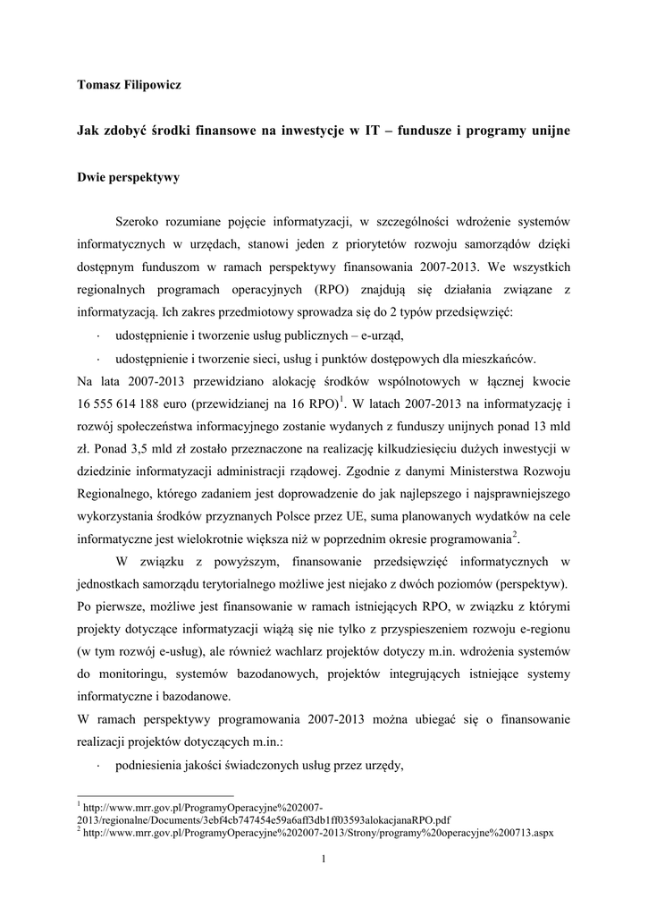 Tomasz Filipowicz Jak zdobyć środki finansowe na inwestycje w IT – fundusze i programy unijne Dwie perspektywy Szeroko rozumiane pojęcie informatyzacji, w szczególności wdrożenie systemów informatycznych w urzędach, stanowi jeden z priorytetów rozwoju samorządów dzięki dostępnym funduszom w ramach perspektywy finansowania 2007-2013. We wszystkich regionalnych programach operacyjnych (RPO) znajdują się działania związane z informatyzacją. Ich zakres przedmiotowy sprowadza się do 2 typów przedsięwzięć: ⋅ udostępnienie i tworzenie usług publicznych – e-urząd, ⋅ udostępnienie i tworzenie sieci, usług i punktów dostępowych dla mieszkańców. Na lata 2007-2013 przewidziano alokację środków wspólnotowych w łącznej kwocie 16 555 614 188 euro (przewidzianej na 16 RPO) 1. W latach 2007-2013 na informatyzację i rozwój społeczeństwa informacyjnego zostanie wydanych z funduszy unijnych ponad 13 mld zł. Ponad 3,5 mld zł zostało przeznaczone na realizację kilkudziesięciu dużych inwestycji w dziedzinie informatyzacji administracji rządowej. Zgodnie z danymi Ministerstwa Rozwoju Regionalnego, którego zadaniem jest doprowadzenie do jak najlepszego i najsprawniejszego wykorzystania środków przyznanych Polsce przez UE, suma planowanych wydatków na cele informatyczne jest wielokrotnie większa niż w poprzednim okresie programowania 2. W związku z powyższym, finansowanie przedsięwzięć informatycznych w jednostkach samorządu terytorialnego możliwe jest niejako z dwóch poziomów (perspektyw). Po pierwsze, możliwe jest finansowanie w ramach istniejących RPO, w związku z którymi projekty dotyczące informatyzacji wiążą się nie tylko z przyspieszeniem rozwoju e-regionu (w tym rozwój e-usług), ale również wachlarz projektów dotyczy m.in. wdrożenia systemów do monitoringu, systemów bazodanowych, projektów integrujących istniejące systemy informatyczne i bazodanowe. W ramach perspektywy programowania 2007-2013 można ubiegać się o finansowanie realizacji projektów dotyczących m.in.: ⋅ podniesienia jakości świadczonych usług przez urzędy, 1 http://www.mrr.gov.pl/ProgramyOperacyjne%2020072013/regionalne/Documents/3ebf4cb747454e59a6aff3db1ff03593alokacjanaRPO.pdf 2 http://www.mrr.gov.pl/ProgramyOperacyjne%202007-2013/Strony/programy%20operacyjne%200713.aspx 1 ⋅ wzrostu dostępności i zakresu e-usług, ⋅ wykorzystania nowoczesnych systemów informatycznych w zakresie obiegu dokumentów, monitorowania postępu spraw obywateli, kontroli i weryfikacji postępowań administracyjnych, ⋅ monitoringu środowiskowego, ⋅ powszechnego dostępu do sieci Internet, ⋅ tworzenia społeczeństwa informacyjnego. Po drugie, w ramach programów centralnych np. Program Operacyjny Innowacyjna Gospodarka (POIG), Program Operacyjny Infrastruktura i Środowisko (POIiŚ) realizowane są duże, ogólnopolskie projekty informatyczne skierowane do administracji państwowej. Również w przypadku Programu Operacyjnego Kapitał Ludzki (POKL) istnieje możliwość realizowania pewnych, specyficznych elementów informatycznych, stanowiących swego rodzaju uzupełnienie (suplement) do podstawowych celów projektu. Jest to możliwe dzięki zastosowaniu mechanizmu cross-financing’u, który polega na tzw. elastycznym finansowaniu mającym na celu ułatwienie wdrażania jednofunduszowych programów operacyjnych. W związku z wykorzystaniem funduszy dystrybuowanych w ramach programów centralnych, ograniczeniem dla samorządów jest to, że w ramach finansowania przedsięwzięć lokalnych nie mogą być realizowane żadne kompleksowe rozwiązania informatyczne. Jednakże wydaje się, że realizacja przedsięwzięć w samorządach, które w znaczeniu koncepcyjnym znajdują się na styku administracji centralnej i lokalnej, może znaleźć źródła finansowania na szczeblu centralnym. Zapewnienie współfinansowania i właściwe przygotowanie projektu Większość działań zawartych w ramach poszczególnych Osi priorytetowych nastawionych jest na realizację zadań publicznych, a co za tym idzie, głównymi beneficjentami są jednostki samorządu terytorialnego (na każdym szczeblu), organy administracji państwowej oraz jednostki realizujące zadania publiczne. Podmioty prywatne występują w tym obszarze raczej jako wykonawcy niż bezpośredni beneficjenci. Można wyróżnić dwa kluczowe czynniki wspierające uzyskanie i skuteczne wykorzystanie funduszy wspólnotowych dla finansowania przedsięwzięć w obszarze IT, w ramach projektów realizowanych w jednostkach samorządu terytorialnego. W pierwszej kolejności należy starać się o zapewnienie współfinansowania inwestycji. Wkład własny 2 beneficjenta może pochodzić ze źródeł innych niż budżet samorządu. Potencjalnie, przy wykorzystaniu odpowiednich narzędzi finansowych (leżących m.in. w gestii ministerstw, ale także urzędów i instytucji państwowych) można wdrażać projekt, w którym montaż finansowy zakłada pozyskanie w 100% pomocy bezzwrotnej. Ma to szczególne znaczenie w przypadku gmin, które z uwagi na małe budżety często nie są w stanie wyodrębnić kwot stanowiących udział własny (ok. 15% wartości projektu) 3. Drugim równie istotnym czynnikiem wspierającym skuteczne wykorzystanie funduszy wspólnotowych jest właściwe przygotowanie projektu. Zdarza się, że jednostki samorządu terytorialnego w praktyce nie dysponują odpowiednią kadrą ekspercką dla przygotowania i zrealizowania inwestycji w obszarze IT. Wynika to z faktu, że o wysoko wyspecjalizowanych ekspertów w tym zakresie silnie zabiegają podmioty sektora prywatnego. Ponadto samorządy często nie mają dostępu do doświadczeń i rozwiązań modelowych, które można by wprost zaimplementować. Wciąż nie marginalną cechą administracji publicznej, niezależnie od szczebla, jest niechęć dla pomysłów jej zinformatyzowania. Informatyzacja jest często wymuszana przez prawo a nie przez 