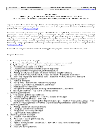 Per Scientiam Ad Salutem Katedra i Zakład Epidemiologii Ul. Medyków 18, 40-752 Katowice – Wydział Lekarski w Katowicach Śląski Uniwersytet Medyczny – Tel./Fax: (32) 2523734 E-mail: [email protected] REGULAMIN OBOWIĄZUJĄCY STUDENTÓW IV ROKU WYDZIAŁU LEKARSKIEGO W KATOWICACH PODCZAS ZAJĘĆ Z PRZEDMIOTU ‘HIGIENA I EPIDEMIOLOGIA’ Zajęcia są prowadzone przez Katedrę i Zakład Epidemiologii (jednostka nauczająca). Osobą odpowiedzialną za realizację nauczania przedmiotu jest prof. dr hab. med. Jan E. Zejda, kierownik Katedry i Zakładu Epidemiologii (tel.2523734, e-mail:[email protected]). Nauczanie przedmiotu jest realizowane poprzez udział Studentów w wykładach, seminariach i ćwiczeniach oraz przyswojenie treści obowiązkowych pozycji literaturowych. Program kształcenia (przedstawiony poniżej) koresponduje z treścią tzw. minimum programowego dla przedmiotu ‘higiena i epidemiologia’. Ćwiczenia odbywają się w dwóch blokach tygodniowych (‘wtorek-piątek’), zgodnie z podaną poniżej tematyką ćwiczeń i harmonogramem. Tematy ćwiczeń reprezentują zagadnienia obejmujące epidemiologię oraz higienę pracy i komunalną. Osobą odpowiedzialną za realizację ćwiczeń (kierownik ćwiczeń) jest: dr n. med. Grzegorz Brożek ([email protected]) Kierownik ćwiczeń jest adresatem wszelkich próśb i pytań związanych z udziałem Studentów w zajęciach. Program Kształcenia 1. Podstawy epidemiologii i biostatystyki a. a. Definicja epidemiologii i jej podział, uwarunkowania stanu zdrowia populacji b. Epidemiologia a zdrowie publiczne, epidemiologia a nauki medyczne c. Badania epidemiologiczne i ich podział d. Kwestionariusz jako narzędzie badania epidemiologicznego a. e. Koncepcja standardów diagnostycznych i terapeutycznych f. Definicja biostatystyki, koncepcja zmienności wewnątrz- i międzyosobniczej g. Błąd przypadkowy i systematyczny. Koncepcja zmiennych i statystycznej znamienności h. Proste testy statystycznej znamienności różnic i zależności. Podstawy analizy wielu zmiennych 2. Epidemiologia opisowa a. Podstawy demografii b. Metody oceny i monitorowania stanu zdrowia populacji c. Zapadalność, chorobowość, umieralność, śmiertelność d. Standaryzacja współczynników e. Międzynarodowa Statystyczna Klasyfikacja Chorób i Problemów Zdrowotnych f. Systemy informatyczne i bazy danych w ochronie zdrowia 3. Epidemiologia analityczna a. Cele i zadania epidemiologii analitycznej b. Badanie ekologiczne, przekrojowe, kohortowe, kliniczno-referencyjne c. Protokół badawczy. Definicja i dobór prób d. Wiarygodność wyników badań epidemiologicznych (koncepcja i przykłady błędu systematycznego i błędu przypadkowego; poprawność wewnętrzna i poprawność zewnętrzna badania epidemiologicznego) 4. Epidemiologia kliniczna a. Definicja i zadanie epidemiologii klinicznej b. Koncepcja i ustalanie wartości należnej c. Wiarygodność testów diagnostycznych d. Eksperymentalne badanie kliniczne 5. Epidemiologia chorób zakaźnych a. Epidemie, proces epidemiczny b. Dochodzenie i nadzór epidemiologiczny c. Kalendarz szczepień d. Wybrane choroby zakaźne – zakażenia HIV, HBV i HCV wśród personelu medycznego e. Zakażenia szpitalne f. Państwowa Inspekcja Sanitarna 6. Epidemiologia środowiskowa a. Definicja epidemiologii środowiskowej. b. Klasyfikacja szkodliwych czynników środowiskowych. c. Metody pomiaru narażenia na czynniki środowiskowe. d. Koncepcja narażenia skumulowanego. e. Monitoring biologiczny i monitoring środowiskowy f. Klasyfikacja czynników rakotwórczych wg Międzynarodowej Agencji Badań nad Rakiem 7. Interpretacja wyników badań epidemiologicznych a. Koncepcje bezwarunkowej i warunkowej zależności przyczynowo-skutkowej w opisie etiopatogenezy chorób b. Kryteria Hill’a w ocenie związków przyczynowo-skutkowych w epidemiologii c. Definicja i przykłady ustrojowych (osobniczych) i środowiskowych czynników ryzyka d. Definicja i przykłady czynników zakłócających e. Koncepcja ryzyka i jego miary (ryzyko bezwzględne, ryzyko względne i ryzyko przypisane narażeniu) f. Doniesienie naukowe. 8. Uwarunkowania stanu zdrowia a. Czynniki chemiczne, fizyczne i biologiczne w środowisku b. Zaburzenia stanu zdrowia związane z niewłaściwą jakością środowiska komunalnego – wybrane zagadnienia c. Koncepcja ryzyka zdrowotnego, podstawy medycyny środowiskowej d. Zaburzenia stanu zdrowia zależne od stylu życia i czynników społeczno-ekonomicznych 9. Higiena środowiska komunalnego oraz higiena żywności i żywienia a. Normatywy higieniczne b. Monitoring środowiska c. Higiena w instytucjach ochrony zdrowia d. Mikroklimat e. Uwarunkowania psychospołeczne stanu zdrowia związane z narkomanią, alkoholizmem, nikotynizmem oraz stresem f. Normy żywieniowe, wartości odżywcze pożywienia, jakościowa i ilościowa ocena żywienia, zatrucia i zakażenia pokarmowe 10. Higiena i medycyna pracy a. Zadania higieny i medycyny pracy, profilaktyka lekarska chorób zawodowych b. Patologie zawodowe c. Orzecznictwo w zakresie chorób zawodowych Literatura obowiązkowa: 1. Beaglehole R., Bonita R., Kjellstrom T.: Podstawy epidemiologii. Wydawnictwo Instytutu Medycyny Pracy. Łódź 2002 2. Kolarzyk E. (red.): Wybrane problemy higieny i ekologii człowieka. Wydawnictwo Uniwersytetu Jagiellońskiego. Kraków 2008 3. Ustawa z dnia 5 grudnia 2008 r. o zapobieganiu oraz zwalczaniu zakażeń i chorób zakaźnych u ludzi (Dz. U. z dnia 30 grudnia 2008 r.) 4. Materiały dydaktyczne zamieszczone na stronie internetowej Katedry (www.epidemiologia.sum.edu.pl) Nieobecność na zajęciach Studenci nieobecni podczas zajęć ćwiczeniowych lub seminaryjnych w terminie wyznaczonym dla właściwej grupy studenckiej, są zobowiązani do odrobienia zajęć. Studenci mają prawo, tylko w uzasadnionych przypadkach, do uzyskania zwolnienia z konieczności odrabiania zajęć. O możliwości zastosowania proponowanego rozwiązania decyd