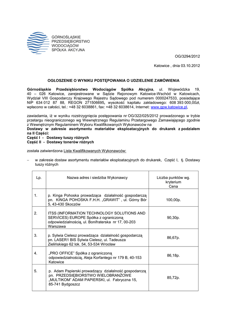 OG/3294/2012 Katowice , dnia 03.10.2012 OGŁOSZENIE O WYNIKU POSTĘPOWANIA O UDZIELENIE ZAMÓWIENIA Górnośląskie Przedsiębiorstwo Wodociągów Spółka Akcyjna, ul. Wojewódzka 19, 40 – 026 Katowice, zarejestrowane w Sądzie Rejonowym Katowice-Wschód w Katowicach, Wydział VIII Gospodarczy Krajowego Rejestru Sądowego pod numerem 0000247533, posiadające NIP 634 012 87 88, REGON 271506695, wysokość kapitału zakładowego: 608 393 000,00zł, wpłacono w całości, tel.: +48 32 6038861, fax: +48 32 6038614, Internet: www.gpw.katowice.pl, zawiadamia, iŜ w wyniku rozstrzygnięcia postępowania nr OG/322/025/2012 prowadzonego w trybie przetargu nieograniczonego wg Wewnętrznego Regulaminu Przetargowego Zamawiającego zgodnie z Wewnętrznym Regulaminem Wyboru Kwalifikowanych Wykonawców na Dostawy w zakresie asortymentu materiałów eksploatacyjnych do drukarek z podziałem na II Części: Część I - Dostawy tuszy róŜnych Część II - Dostawy tonerów róŜnych została zatwierdzona Lista Kwalifikowanych Wykonawców: − w zakresie dostaw asortymentu materiałów eksploatacyjnych do drukarek, Część I, tj. Dostawy tuszy róŜnych Lp. 1. 2. Nazwa adres i siedziba Wykonawcy p. Kinga Pohoska prowadząca działalność gospodarczą pn. KINGA POHOSKA F.H.H. „GRAWIT” , ul. Górny Bór 5, 43-430 Skoczów ITSS (INFORMATION TECHNOLOGY SOLUTIONS AND SERVICES) EUROPE Spółka z ograniczoną odpowiedzialnością, ul. Bonifraterska nr 17, 00-203 Warszawa 3. p. Sylwia Cielesz prowadząca działalność gospodarczą pn. LASER1 BIS Sylwia Cielesz, ul. Tadeusza Zielińskiego 62 lok. 54, 53-534 Wrocław 4. „PRO OFFICE” Spółka z ograniczoną odpowiedzialnością, Aleja Korfantego nr 179 B, 40-153 Katowice 5. p. Adam Papierski prowadzący działalność gospodarczą pn. PRZEDSIĘBIORSTWO WIELOBRANśOWE „MULTIKOM” ADAM PAPIERSKI, ul. Fabryczna 15, 85-741 Bydgoszcz Liczba punktów wg. kryterium Cena 100,00p. 90,30p. 86,67p. 86,18p. 85,72p. 6. „PARTNER W BIURZE” Spółka z ograniczoną odpowiedzialnością, ul. Ogrodowa nr 5, 41-803 Zabrze 84,35p. 7. PRZEDSIĘBIORSTWO HANDLOWO-USŁUGOWE „VECTOR” Spółka z ograniczoną odpowiedzialnością, ul. Bielska nr 29, 40-749 Katowice 8. COMA – SYSTEMY CYFROWE JANINA ŁAKOMY, ANDRZEJ ŁAKOMY SPÓŁKA JAWNA, ul. Leopolda Staffa nr 32, 40-576 Katowice 9. p. Jerzy RoŜen prowadzący działalność gospodarczą pn. BIURO PLUS JERZY ROśEN, ul. Kolejowa 19, 40-601 Katowice 10. p. Izabela Brzezina prowadząca działalność gospodarczą pn. REPRINT IZABELA BRZEZINA , ul. Jana Pawła II A, 44-230 Czerwionka - Leszczyny 11. „PARTNER XXI” Spółka z ograniczona odpowiedzialnością, ul. Pawliczka nr 25, 41-800 Zabrze 72,15p. 12. WYDAWNICTWA AKCYDENSOWE Spółka Akcyjna, Oddział w Krakowie, ul. Łagiewnicka 39, 30-417 Kraków 70,55p. 13. OFFICE DEPOT POLAND Spółka z ograniczoną odpowiedzialnością , ul. Szturmowa nr 2, 02-678 Warszawa 14. p. Jarosław śebrowski, Maciej Ryciak prowadzący działalność gospodarczą pn. JM DATA Jarosław śebrowski, Maciej Ryciak , ul. Trakt Lubelski 233, 04-667 Warszawa 83,34p. 83,21p. 81,91p. 77,99p. 68,34p. 59,77p. Uzasadnienie: Wymagania Zamawiającego określone w specyfikacji istotnych warunków zamówienia spełnia 14 ofert, które zgodnie z kryterium oceny ofert otrzymały punktację jak wyŜej. − w zakresie dostaw asortymentu materiałów eksploatacyjnych do drukarek, Część II, tj. Dostawy tonerów róŜnych Lp. Nazwa adres i siedziba Wykonawcy 1. p. Kinga Pohoska prowadząca działalność gospodarczą pn. KINGA POHOSKA F.H.H. „GRAWIT”, ul. Górny Bór 5, 43-430 Skoczów 2. p. Adam Papierski prowadzący działalność gospodarczą pn. PRZEDSIĘBIORSTWO WIELOBRANśOWE „MULTIKOM” ADAM PAPIERSKI, ul. Fabryczna 15, 85-741 Bydgoszcz 3. p. Sylwia Cielesz prowadząca działalność gospodarczą pn. LASER1 BIS Sylwia Cielesz, ul. Tadeusza Zielińskiego 62 lok. 54, 53-534 Wrocław Liczba punktów wg. kryterium Cena 100,00p. 93,53p. 92,18p. 4. „PARTNER W BIURZE” Spółka z ograniczoną odpowiedzialnością, ul. Ogrodowa nr 5, 41-803 Zabrze 5. COMA – SYSTEMY CYFROWE JANINA ŁAKOMY, ANDRZEJ ŁAKOMY SPÓŁKA JAWNA, ul. Leopolda Staffa nr 32, 40-576 Katowice 6. p. Izabela Brzezina prowadząca działalność gospodarczą pn. REPRINT IZABELA BRZEZINA , ul. Jana Pawła II A, 44-230 Czerwionka - Leszczyny 7. ITSS (INFORMATION TECHNOLOGY SOLUTIONS AND SERVICES) EUROPE Spółka z ograniczoną odpowiedzialnością, ul. Bonifraterska nr 17, 00-203 Warszawa 91,12p. 90,83p. 90,22p. 89,29p. 8. „PRO OFFICE” Spółka z ograniczoną odpowiedzialnością, Aleja Korfantego nr 179 B, 40-153 Katowice 9. p. Jerzy RoŜen prowadzący działalność gospodarczą pn. BIURO PLUS JERZY ROśEN, ul. Kolejowa 19, 40-601 Katowice 10. PRZEDSIĘBIORSTWO HANDLOWO-USŁUGOWE „VECTOR” Spółka z ograniczoną odpowiedzialnością, ul. Bielska nr 29, 40-749 Katowice 11. WYDAWNICTWA AKCYDENSOWE Spółka Akcyjna, Oddział w Krakowie, ul. Łagiewnicka 39, 30-417 Kraków 76,56p. 12. PARTNER XXI” Spółka z ograniczoną odpowiedzialnością, ul. Pawliczka nr 25, 41 -800 Zabrze 74,84p. 13. p. Jarosław śebrowski, Maciej Ryciak prowadzący działalność gospodarczą pn. JM DATA Jarosław śebrowski, Maciej Ryciak , ul. Trakt Lubelski 233, 04-667 Warszawa 14. OFFICE DEPOT POLAND Spółka z ograniczoną odpowiedzialnością , ul. Szturmowa nr 2, 02-678 Warszawa 88,73p. 86,56p. 85,73p. 73,14p. 67,54p. Uzasadnienie: Wymagania Zamawiającego określone w specyfikacji istotnych warunków zamówienia spełnia 14 ofert, które zgodnie z kryterium oceny ofert otrzymały punktację jak wyŜej.