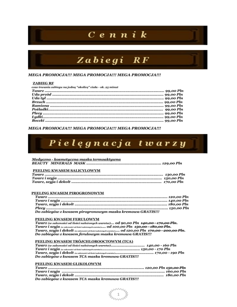 MEGA PROMOCJA!!! MEGA PROMOCJA!!! MEGA PROMOCJA!!! ZABIEG RF czas trwania zabiegu na jedną "okolicę" ciała - ok. 25 minut Twarz ...................................................................................................... 99,00 Pln Uda przód ............................................................................................... 99,00 Pln Uda tył .................................................................................................... 99,00 Pln Brzuch .................................................................................................... 99,00 Pln Ramiona ................................................................................................. 99,00 Pln Pośladki.................................................................................................. 99,00 Pln Plecy ....................................................................................................... 99,00 Pln Łydki....................................................................................................... 99,00 Pln Boczki ..................................................................................................... 99,00 Pln MEGA PROMOCJA!!! MEGA PROMOCJA!!! MEGA PROMOCJA!!! Medyczno - kosmetyczna maska termoaktywna BEAUTY MINERALS MASK ................................................................ 129,00 Pln PEELING KWASEM SALICYLOWYM Twarz ..................................................................................................... 130,00 Pln Twarz i szyja ......................................................................................... 150,00 Pln Twarz, szyja i dekolt ............................................................................. 170,00 Pln PEELING KWASEM PIROGRONOWYM Twarz ...................................................................................................... 120,00 Pln Twarz i szyja ........................................................................................... 140,00 Pln Twarz, szyja i dekolt ............................................................................... 180,00 Pln Plecy ........................................................................................................ 150,00 Pln Do zabiegów z kwasem pirogronowym maska kremowa GRATIS!!! PEELING KWASEM FERULOWYM Twarz (w zalezności od ilości nałożonych warstw)... od 90,00 Pln 140,00 - 170,00 Pln. Twarz i szyja (w zalezności od ilości nałożonych warstw).... od 100,00 Pln 150,00 - 180,00 Pln. Twarz, szyja i dekolt (w zalezności od ilości nałożonych warstw).... od 120,00 Pln 170,00 - 200,00 Pln. Do zabiegów z kwasem ferulowym maska kremowa GRATIS!!! PEELING KWASEM TRÓJCHLOROOCTOWYM (TCA) Twarz (w zalezności od ilości nałożonych warstw)............................. 140,00 - 160 Pln Twarz i szyja (w zalezności od ilości nałożonych warstw)................................. 150,00 - 170 Pln Twarz, szyja i dekolt (w zalezności od ilości nałożonych warstw)................................. 170,00 - 190 Pln Do zabiegów z kwasem TCA maska kremowa GRATIS!!! PEELING KWASEM GLIKOLOWYM Twarz .................................................................................. 120,00 Pln 150,00 Pln Twarz i szyja ........................................................................................ 160,00 Pln Twarz, szyja i dekolt ............................................................................ 180,00 Pln Do zabiegów z kwasem TCA maska kremowa GRATIS!!! 1 PEELING KWASEM MIGDAŁOWYM Twarz ..................................................................................................... 140,00 Pln Twarz i szyja .......................................................................................... 160,00 Pln Twarz, szyja i dekolt .............................................................................. 199,00 Pln Plecy ....................................................................................................... 170,00 Pln Do zabiegów z kwasem migdałowym maska kremowa GRATIS!!! ZABIEGI EKSFOLIACJI KWASAMI MLEKOWYMI Kuracja odmładzająca......................................................................... 140,00 Pln Kuracja regulująca................................................................................. 150,00 Pln Kuracja usuwania plam, przebarwień i blizn................. od 120,00 Pln od 160,00 Pln ZABIEGI OCZYSZCZAJĄCE Manualne oczyszczanie twarzy ............................................................. 110,00 Pln Manualne oczyszczanie twarzy, szyi i dekoltu ..................................... 130,00 Pln Manualne oczyszczanie pleców .................................................... 120 - 150,00 Pln PEELING KAWITACYJNY + SONOFOREZA Peeling kawitacyjny ................................................................................ 40,00 Pln Peeling kawitacyjny + sonoforeza + ampułka ........................................ 85,00 Pln Peeling kawitacyjny + sonoforeza + ampułka +maska kremowa ........ 100,00 Pln Peeling kawitacyjny + sonoforeza +ampułka + maska algowa .......... 120,00 Pln Peeling kawitacyjny + sonoforeza + ampułka + płat kolagenowy....... 140,00 Pln MIKRODERMABRAZJA DIAMENTOWA Twarz ..................................................................................................... 120,00 Pln Twarz i szyja .......................................................................................... 119,00 Pln Twarz, szyja i dekolt .............................................................................. 149,00 Pln Plecy ....................................................................................................... 149,00 Pln Dłonie ....................................................................................................... 60,00 Pln Przedramiona ......................................................................................... 99,00 Pln Do zabiegów mikrodermabrazji maska kremowa GRAT