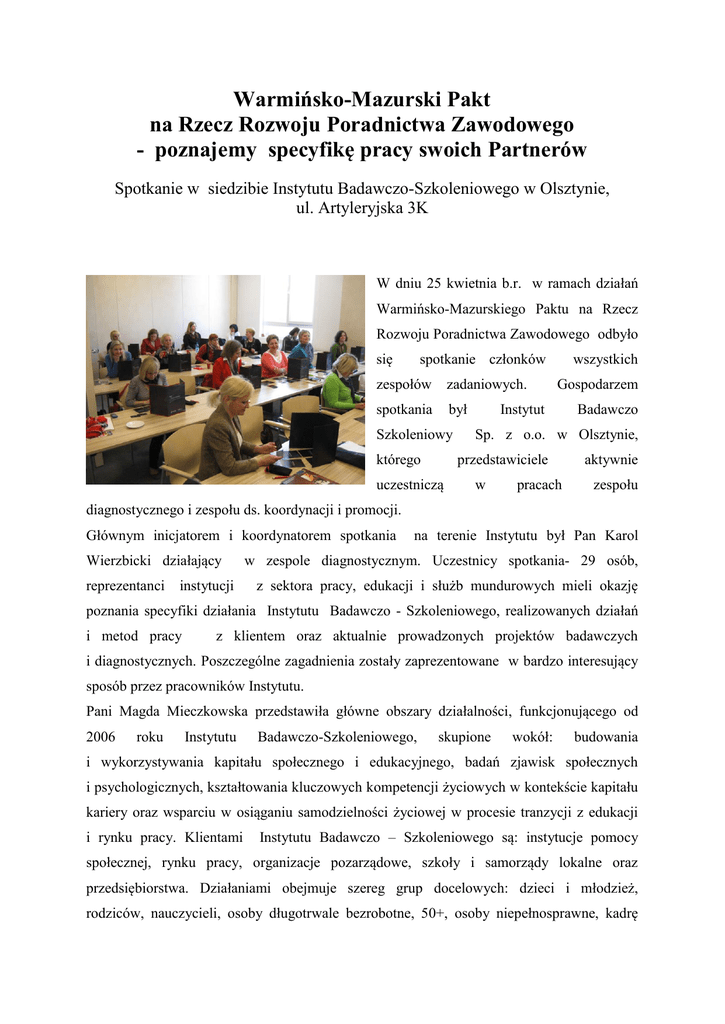 Warmińsko-Mazurski Pakt na Rzecz Rozwoju Poradnictwa Zawodowego - poznajemy specyfikę pracy swoich Partnerów Spotkanie w siedzibie Instytutu Badawczo-Szkoleniowego w Olsztynie, ul. Artyleryjska 3K W dniu 25 kwietnia b.r. w ramach działań Warmińsko-Mazurskiego Paktu na Rzecz Rozwoju Poradnictwa Zawodowego odbyło się spotkanie członków zespołów zadaniowych. spotkania był Szkoleniowy którego wszystkich Gospodarzem Instytut Sp. z o.o. w Olsztynie, przedstawiciele uczestniczą Badawczo w pracach aktywnie zespołu diagnostycznego i zespołu ds. koordynacji i promocji. Głównym inicjatorem i koordynatorem spotkania Wierzbicki działający reprezentanci instytucji na terenie Instytutu był Pan Karol w zespole diagnostycznym. Uczestnicy spotkania- 29 osób, z sektora pracy, edukacji i służb mundurowych mieli okazję poznania specyfiki działania Instytutu Badawczo - Szkoleniowego, realizowanych działań i metod pracy z klientem oraz aktualnie prowadzonych projektów badawczych i diagnostycznych. Poszczególne zagadnienia zostały zaprezentowane w bardzo interesujący sposób przez pracowników Instytutu. Pani Magda Mieczkowska przedstawiła główne obszary działalności, funkcjonującego od 2006 roku Instytutu Badawczo-Szkoleniowego, skupione wokół: budowania i wykorzystywania kapitału społecznego i edukacyjnego, badań zjawisk społecznych i psychologicznych, kształtowania kluczowych kompetencji życiowych w kontekście kapitału kariery oraz wsparciu w osiąganiu samodzielności życiowej w procesie tranzycji z edukacji i rynku pracy. Klientami Instytutu Badawczo – Szkoleniowego są: instytucje pomocy społecznej, rynku pracy, organizacje pozarządowe, szkoły i samorządy lokalne oraz przedsiębiorstwa. Działaniami obejmuje szereg grup docelowych: dzieci i młodzież, rodziców, nauczycieli, osoby długotrwale bezrobotne, 50+, osoby niepełnosprawne, kadrę instytucji pomocy społecznej i rynku pracy oraz członków organizacji pozarządowych. Instytut działa prężnie, prowadząc badania społeczne, i diagnostykę psychologiczną jak również treningi, warsztaty i doradczą szkolenia kursy zawodowe. W kręgu zainteresowań znajduje się również aktywizacja osób bezrobotnych zagrożonych wykluczeniem społecznym oraz diagnoza modernizacyjna przedsiębiorstw. W swoim dorobku Instytut ma zarówno autorskie projekty badawcze, którymi objęto 4.000 tys. osób, jak również autorskie projekty innowacyjne i szkoleniowe, w tym również o zasięgu krajowym. Kolejnym punktem programu spotkania była prezentacja projektu innowacyjnego „Pomosty. budowanie kapitału społecznego młodzieży ze środowisk wiejskich Warmii i Mazur” współfinansowanego ze środków Unii Europejskiej w ramach Europejskiego Funduszu Społecznego (Priorytet VII. Promocja integracji społecznej). Pan Karol Wierzbicki przedstawił założenia i wyniki badań na temat młodzieży wiejskiej oraz pracowników Ośrodków Pomocy Społecznej OPS/PCPR z terenów w kontekście budowania Warmii i Mazur kapitału społecznego. Projekt „Pomosty” w odpowiedzi na dostrzeżony problem społecznego niskiego wskaźnika kapitału młodzieży z terenów wiejskich Warmii i Mazur proponuje innowacyjne metody interwencji socjalnej i przeciwdziałania wykluczeniu społecznemu młodych. Pojęciem kluczowym, wokół którego koncentrują się działania projektowe, jest zatem kapitał społeczny, kształtowany głownie poprzez edukację pozaszkolną, wyrażający się w więzi zaufania społecznego, determinujący samodzielność życiową i stanowiący potencjał dla kompetencji ogólnożyciowych. Budowa kapitału społecznego jest szczególnie istotna dla młodzieży wchodzącej na rynek pracy, której życie codzienne związane jest z normami występującymi w lokalnych, wiejskich społecznościach. Badania przeprowadzone wśród grup młodzieży z terenów wiejskich oraz pracowników socjalnych wykazały szereg niekorzystnych zjawisk, wpływających na jakość wzajemnych relacji, które dalekie były od pożądanych. Co ciekawe, zarówno świat młodzieży jak i świat pracowników socjalnych przepełniony był negatywnymi emocjami. Obie grupy w istocie cechował brak wiedzy o sobie nawzajem oraz małe różnice pod względem kompetencji kulturowych przy podstawowej odmienności usytuowania w miejscowej strukturze społecznej. Badania wykazały, iż życie młodych skupia się codzienności, na przetrwaniu, w sposobie rozwiązywania problemów uwidacznia się u nich sztywność i zachowawczość. Ponadto młodzi ludzie sygnalizują brak wsparcia w wejściu na rynek pracy oraz deficyt satysfakcjonujących kontaktów z rówieśnikami. U pracowników socjalnych przedmiotowe uwidoczniło się: traktowanie młodzieży, przeszacowywanie braku kompetencji młodzieży, duże nacechowanie emocjonalne języka (przemoc symboliczna), swoista sprzeczność interesów (urzędnik vs. „pomagający”). Pracownicy socjalni zobligowani są do respektowania przepisów prawnych („zza biurka”) i często ich działanie kojarzone jest z czymś zagrażającym i nie sprzyja postawie otwartości ze strony podopiecznych. Rzeczywistą rolą powinno być docieranie do potrzebujących z pomocą adekwatną do zdiagnozowanych potrzeb, ale wymaga to szczerości we wzajemnym kontakcie. Dostrzeżono konieczność zmiany wizerunku OPS/PCPR dla budowania relacji w społecznościach lokalnych. Rekomendacje praktyczne sprzyjające zmianie niekorzystnej „rozmawianie, polepszenie sytuacji kładą nacisk słuchanie, przyglądanie wzajemnej na się”: komunikacji, poszukiwanie znaczących postaci w środowisku lokalnym, działania kreatywne w środowisku, realizację zespołowo projektów, stwarzanie możliwości wyrażania siebie, rozwój więzi społecznych młodych. Istotne jest, aby podejmowane działania bazujące na diagnozie potrzeb lokalnych społeczności jednocześnie dawały młodzieży możliwość zbierania doświadczeń poz