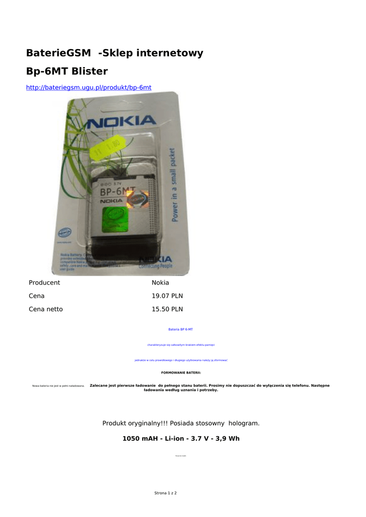 BaterieGSM -Sklep internetowy Bp-6MT Blister http://bateriegsm.ugu.pl/produkt/bp-6mt Producent Nokia Cena 19.07 PLN Cena netto 15.50 PLN Bateria BP 6-MT charakteryzuje się całkowitym brakiem efektu pamięci jednakże w celu prawidłowego i długiego użytkowania należy ją sformować FORMOWANIE BATERII: Nowa bateria nie jest w pełni naładowana. Zalecane jest pierwsze ładowanie do pełnego stanu baterii. Prosimy nie dopuszczać do wyłączenia się telefonu. Następne ładowania według uznania i potrzeby. Produkt oryginalny!!! Posiada stosowny hologram. 1050 mAH - Li-ion - 3.7 V - 3,9 Wh Pasuje do modeli: Strona 1 z 2 NOKIA 5610, NOKIA 5700, NOKIA 7390 , NOKIA 6110 NAVIGATOR, NOKIA 6500 SLIDE NOKIA E51, NOKIA N81, NOKIA N81 8GB, NOKIA N81 oraz inne... Szukasz oryginalnej baterii? Trafiłeś na właściwą aukcję. 100% zadowolenia . Strona 2 z 2