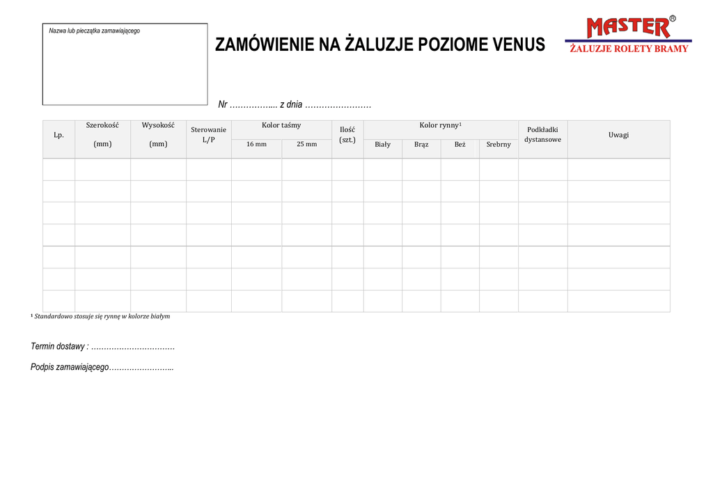 Nazwa lub pieczątka zamawiającego ZAMÓWIENIE NA ŻALUZJE POZIOME VENUS Nr ……………... z dnia …………………… Lp. 1 Szerokość (mm) Wysokość (mm) Standardowo stosuje się rynnę w kolorze białym Termin dostawy : …………………………… Podpis zamawiającego…………………….. Sterowanie L/P Kolor taśmy 16 mm 25 mm Ilość (szt.) Biały Kolor rynny1 Brąz Beż Srebrny Podkładki dystansowe Uwagi