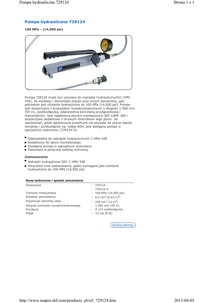 Pompa hydrauliczna 729124 Strona 1 z 1 Pompa hydrauliczna 729124 100 MPa - (14,500 psi) Pompa 729124 może być używana do nakrętek hydraulicznych( HMV 54E), do montażu i demontażu łożysk oraz innych elementów, gdy potrzebne jest ciśnienie hydrauliczne do 100 MPa (14,500 psi). Pompa jest dostarczana z przewodem wysokociśnieniowym o długości 1 500 mm (59 in), szybkozłączką, odpowiednią końcówką przyłączeniową i manometrem. Jest napełniona płynem montażowym SKF LHMF 300 i dostarczana dodatkowo z litrowym zbiornikiem tego płynu. Do zastosowań, gdzie ograniczona przestrzeń nie pozwala na użycie złączki wkrętnej i szybkozłączki np. tuleje AOH, jest dostępna pompa w specjalnym wykonaniu (729124 A). Odpowiednia do nakrętek hydraulicznych HMV 54E Dodatkowy litr płynu montażowego Dostępna pompa w specjalnym wykonaniu Pakowane w poręczną walizkę ochronną Zastosowania Nakrętki hydrauliczne SKF HMV 54E Wszystkie inne zastosowania, gdzie wymagane jest ciśnienie hydrauliczne do 100 MPa (14,500 psi) Dane techniczne i sposób zamawiania Oznaczenie : 729124 Ciśnienie maksymalne Wydatek jednostkowy Pojemność zbiornika oleju : 729124 A : 100 MPa (14,500 psi) : 0,5 cm3 (0.03 in3) : 250 cm3 (15 in3) Długość przewodu wysokociśnieniowego Przyłącze Waga : 1.500 mm (59 in) : G 1/4 szybkozłączka : 3,5 kg (8 lb) http://www.mapro.skf.com/products_pl/oil_729124.htm 2013-04-05
