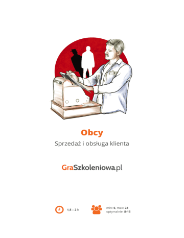 Obcy Sprzedaż i obsługa klienta 1,5 – 2 h min: 6, max: 24 optymalnie: 8-16 Obcy © 2016 GrowinGame Sp. z o.o. Wszystkie prawa zastrzeżone. Gra symulacyjna 'Obcy' rozpowszechniana jest przez GrowinGame wraz z licencją. Każdy nabywca gry zobowiązał się w chwili zakupu do przestrzegania jej warunków. Opracowanie ani żadna jego część nie mogą być przedrukowywane, reprodukowane, ani odczytywane w środkach masowego przekazu bez indywidualnej i pisemnej zgody GrowinGame. Prawa użytkownika gry do kopiowania jej lub jej części określone są w licencji udzielonej prawowitemu właścicielowi niniejszego opracowania. Rozpowszechniane zabronione. jakąkolwiek metodą poligraficzną lub elektroniczną jest Pełna treść licencji jest dostępna na stronie nr 19. Autorzy: Wiktor Wołoszko Krzysztof Szewczak Dziękujemy za wybór naszych gier! W razie pytań lub wątpliwości zadzwoń do nas lub napisz. Podziel się także swoimi pomysłami na rozwój lub ulepszenie naszych produktów. Jak dobrze przygotować się do prowadzenia gry? Na tej stronie znajdziesz ważne i aktualizowane informacje, które pomogą Ci efektywnie przeprowadzić tę i inne nasze gry. Zapoznaj się z nimi koniecznie, szczególnie jeśli prowadzisz naszą grę po raz pierwszy. Edycja 1 © GrowinGame Sp. z o.o. & GraSzkoleniowa.pl 2 Obcy SPIS TREŚCI O grze ..................................................................................................................................... 4 Materiały do gry .................................................................................................................... 5 Przebieg gry ........................................................................................................................... 6 Wnioski i opinie uczestników po grze ................................................................................. 9 Wydruki ................................................................................................................................ 10 Instrukcja – Sprzedawca .................................................................................................................. 11 Instrukcja – Podróżujący .................................................................................................................. 13 .............................................................................................................................................. 15 Plan gry Model kompetencji – sprzedaż i obsługa klienta .......................................................................... 16 Notatki ................................................................................................................................. 18 Warunki licencji ................................................................................................................... 19 © GrowinGame Sp. z o.o. & GraSzkoleniowa.pl 3 Obcy O grze Naturalnym jest, że to sprzedawcy na różne sposoby dbają o satysfakcję klientów. Jakże ciekawym byłoby odwrócenie tej sytuacji i sprawienie, by to klienci zabiegali o względy drugiej strony! Tak właśnie jest w tej grze... Uczestnicy przenoszą się gdzieś na odległą prowincję i wcielają – jedni w role sprzedawców ze stacji paliw, pozostali w podróżujących, którzy planują zakupy. Obcy nie są w tej okolicy zbyt mile widziani, a podejrzliwe spojrzenia i zdawkowe odpowiedzi to chyba szczyt zaangażowania tamtejszych handlowców. To nie lada wyzwanie dla wędrowców, którzy odwiedzą to miejsce. Od ich indywidualnych starań i strategii zależy wynik zakupowy, który zdecyduje o wygranej. Gra daje możliwość doświadczenia i zaobserwowania wielu zachowań sprzedażowych – szczególnie tych składających się na pierwsze wrażenie, badanie potrzeb i prezentację, aż po zamknięcie transakcji. Ze względu na swoiste odwrócenie ról (to kupujący zabiegają o uwagę sprzedawców) gra zyskuje element zaskoczenia. Dzięki temu późniejsze omówienie przynosi wiele nowych i wartościowych wniosków dotyczących procesu sprzedaży i obsługi klienta. Z perspektywy trenera gra jest prosta w prowadzeniu i daje wiele satysfakcji. Humor, kreatywność i inicjatywa to potencjały, które mają okazję ujawnić się w trakcie rozgrywki, stąd jest to dobre narzędzie na początek szkolenia lub jako energizer. Rozwijane kompetencje: Obsługa klienta i sprzedaż, w tym: • • • • • • • nawiązanie relacji / wywieranie pierwszego wrażenia, wykorzystanie mowy ciała (komunikacja niewerbalna), badanie potrzeb, prezentacja oferty, radzenie sobie z obiekcjami, zamykanie transakcji, zachowanie zasad etyki biznesowej. Model kompetencji, na którym bazuje gra jest dostępny na stronie 16. © GrowinGame Sp. z o.o. & GraSzkoleniowa.pl 4 Obcy Warunki licencji na użytkowanie gry symulacyjnej „Obcy” Podstawowe definicje Licencjodawca GrowinGame Sp. z o.o., 10-602 Olsztyn, ul. Wincentego Pstrowskiego 14B/4, NIP 739-388-69-25, REGON 364942639, KRS 0000628262, zwana dalej w niniejszej Licencji GrowinGame. Licencjobiorca Prawowity nabywca gry symulacyjnej „Obcy” zakupionej za pośrednictwem serwisu internetowego www.graszkoleniowa.pl, wymieniony w stopce niniejszego opracowania, zwany dalej w niniejszej Licencji Użytkownikiem. Licencja Niniejszy dokument i jego postanowienia. Dokumentacja Wszelkie materiały składające się na grę szkoleniową, w szczególności instrukcja i objaśnienia dotyczące jej użytkowania oraz instrukcje i treści przeznaczone do wydruku dla uczestników rozgrywki. §1 Przedmiot Licencji 1. Przedmiotem Licencji, zwanym dalej Produktem, jest gra symulacyjna "Obcy" wraz z jej Dokumentacją. 2. Przedmiot Licencji korzysta z ochrony przewidzianej przepisami prawa autorskiego i oddany w używanie nie oznacza przeniesienia ich i wynikających z nich praw majątkowych na Użytkownika. 3. GrowinGame jest właścicielem majątkowych praw autorskich do Produktu.