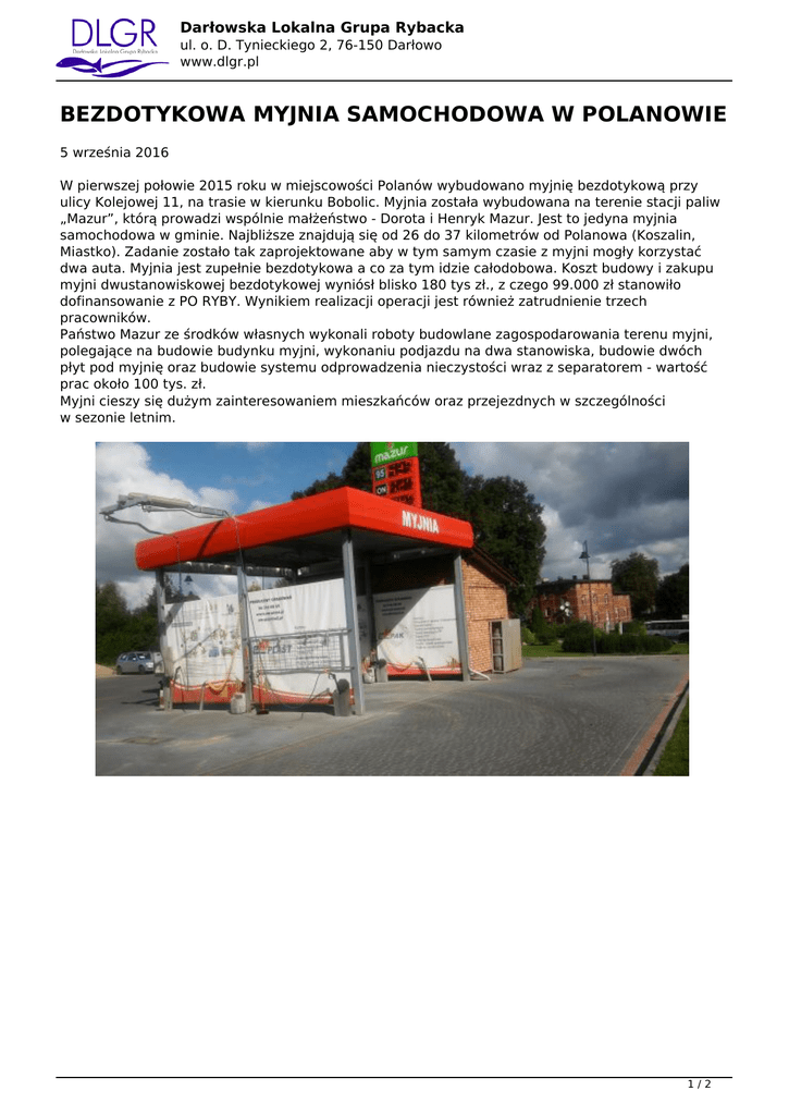 Darłowska Lokalna Grupa Rybacka ul. o. D. Tynieckiego 2, 76-150 Darłowo www.dlgr.pl BEZDOTYKOWA MYJNIA SAMOCHODOWA W POLANOWIE 5 września 2016 W pierwszej połowie 2015 roku w miejscowości Polanów wybudowano myjnię bezdotykową przy ulicy Kolejowej 11, na trasie w kierunku Bobolic. Myjnia została wybudowana na terenie stacji paliw „Mazur”, którą prowadzi wspólnie małżeństwo - Dorota i Henryk Mazur. Jest to jedyna myjnia samochodowa w gminie. Najbliższe znajdują się od 26 do 37 kilometrów od Polanowa (Koszalin, Miastko). Zadanie zostało tak zaprojektowane aby w tym samym czasie z myjni mogły korzystać dwa auta. Myjnia jest zupełnie bezdotykowa a co za tym idzie całodobowa. Koszt budowy i zakupu myjni dwustanowiskowej bezdotykowej wyniósł blisko 180 tys zł., z czego 99.000 zł stanowiło dofinansowanie z PO RYBY. Wynikiem realizacji operacji jest również zatrudnienie trzech pracowników. Państwo Mazur ze środków własnych wykonali roboty budowlane zagospodarowania terenu myjni, polegające na budowie budynku myjni, wykonaniu podjazdu na dwa stanowiska, budowie dwóch płyt pod myjnię oraz budowie systemu odprowadzenia nieczystości wraz z separatorem - wartość prac około 100 tys. zł. Myjni cieszy się dużym zainteresowaniem mieszkańców oraz przejezdnych w szczególności w sezonie letnim. 1/2 Darłowska Lokalna Grupa Rybacka ul. o. D. Tynieckiego 2, 76-150 Darłowo www.dlgr.pl Zobacz on-line: 2/2 Powered by TCPDF (www.tcpdf.org)