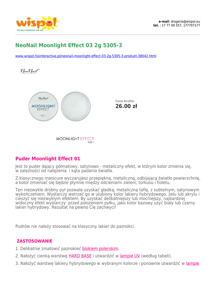 e-mail: [email protected] tel. : 17 77 00 557, 177707177 NeoNail Moonlight Effect 03 2g 5305-3 www.wispol.tiointeractive.pl/neonail-moonlight-effect-03-2g-5305-3-produkt-38042.html Cena brutto: 26.00 zł Puder Moonlight Effect 01 Jest to puder dający półmatowy, satynowo - metaliczny efekt, w którym kolor zmienia się, w zależności od natężenia i kąta padania światła. Z klasycznego manicure wyczarujesz przepiękną, metaliczną, odbijającą światło powierzchnię, a kolor zmieniać się będzie płynnie między odcieniami zieleni, turkusu i fioletu. Ten niezwykle drobny pył pozwala uzyskać gładką, metaliczną taflę, z subtelnym, satynowym wykończeniem. Wystarczy wetrzeć go w ulubiony kolor lakieru hybrydowego, żelu lub akrylu i cieszyć się niezwykłym efektem. By uzyskać delikatniejszy lub mocniejszy, najbardziej widoczny efekt wystarczy przed położeniem pyłku, jako kolor bazowy użyć biały lub czarny lakier hybrydowy. Rezultat na pewno Cię zachwyci! Pudrów nie należy stosować na klasyczny lakier do paznokci. ZASTOSOWANIE 1. Delikatnie zmatowić paznokieć blokiem polerskim. 2. Nałożyć cienką warstwę HARD BASE i utwardzić w lampie UV (według tabeli). 3. Nałożyć warstwę lakieru hybrydowego w wybranym kolorze i ponownie utwardzić w lampie UV 36 W ok. 2 min. lub LED 48W 1 min. (im ciemniejszy kolor, tym dłuższy czas utwardzania). Dla uzyskania głębi koloru czynność należy powtórzyć. 4. Następnie nałożyć drugą, równie cienką warstwę tego samego lakieru, po czym utwardzić lakier w lampie. 5. Nałożyć cienką warstwę Dry Top dla nadania niesamowitego połysku. Utwardzić w lampie UV 36 W - 100 sekund lub LED 48 W- 20 sek. W przypadku aplikacji pyłku na czarny kolor hybrydy, nie ma koniecznosci użycia Dry Top. Wystarczy tylko utwardzić kolor w lampie LED 48W 60 sekund, a w lampie UV 36W 2-3 minuty. 6. Wetrzeć Moonlight Effect w utwardzony top opuszkiem palca lub aplikatorem - gąbeczką. Nadmiar pudru usunąć przy pomocy miękkiego pędzelka. 7. Pokryć paznokcie warstwą Top Sunbloker i utwardzić w lampie. 8. Ponownie pokryć paznokcie - tym razem - Hard Top lub Dry Top i utwardzić w lampie. Odcień pyłku: niebieskawy (turkusowy). Waga: 2 g. Poniższe zdjęcie przedstawia efekt użycia pudru Moonlight Effect 01 na lakierze hybrydowym Pure Black 2996. *Ceny obowiązują wyłącznie przy składaniu zamówień przez sklep internetowy. Ceny w sklepach mogą nieznacznie różnić się od cen prezentowanych na stronach sklepu internetowego. Przedstawiona oferta w sklepie internetowym nie stanowi oferty w rozumieniu Kodeksu Cywilnego, i jest jedynie zaproszeniem do rozpoczęcia rokowań (zgodnie z art. 71 k.c.). Zastrzegamy sobie prawo do niezrealizowania zamówień z ważnych przyczyn ekonomicznych.