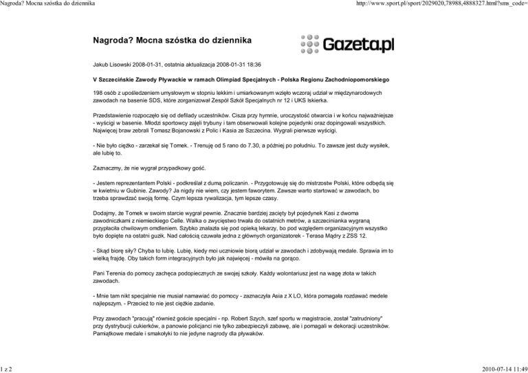 Nagroda? Mocna szóstka do dziennika http://www.sport.pl/sport/2029020,78988,4888327.html?sms_code= Nagroda? Mocna szóstka do dziennika Jakub Lisowski 2008-01-31, ostatnia aktualizacja 2008-01-31 18:36 V Szczecińskie Zawody Pływackie w ramach Olimpiad Specjalnych - Polska Regionu Zachodniopomorskiego 198 osób z upośledzeniem umysłowym w stopniu lekkim i umiarkowanym wzięło wczoraj udział w międzynarodowych zawodach na basenie SDS, które zorganizował Zespół Szkół Specjalnych nr 12 i UKS Iskierka. Przedstawienie rozpoczęło się od defilady uczestników. Cisza przy hymnie, uroczystość otwarcia i w końcu najważniejsze - wyścigi w basenie. Młodzi sportowcy zajęli trybuny i tam obserwowali kolejne pojedynki oraz dopingowali wszystkich. Najwięcej braw zebrali Tomasz Bojanowski z Polic i Kasia ze Szczecina. Wygrali pierwsze wyścigi. - Nie było ciężko - zarzekał się Tomek. - Trenuję od 5 rano do 7.30, a później po południu. To zawsze jest duży wysiłek, ale lubię to. Zaznaczmy, że nie wygrał przypadkowy gość. - Jestem reprezentantem Polski - podkreślał z dumą policzanin. - Przygotowuję się do mistrzostw Polski, które odbędą się w kwietniu w Gubinie. Zawody? Ja nigdy nie wiem, czy jestem faworytem. Zawsze warto startować w zawodach, bo trzeba sprawdzać swoją formę. Czym lepsza rywalizacja, tym lepsze czasy. Dodajmy, że Tomek w swoim starcie wygrał pewnie. Znacznie bardziej zacięty był pojedynek Kasi z dwoma zawodniczkami z niemieckiego Celle. Walka o zwycięstwo trwała do ostatnich metrów, a szczecinianka wygraną przypłaciła chwilowym omdleniem. Szybko znalazła się pod opieką lekarzy, bo pod względem organizacyjnym wszystko było dopięte na ostatni guzik. Nad całością czuwała jedna z głównych organizatorek - Terasa Mądry z ZSS 12. - Skąd biorę siły? Chyba to lubię. Lubię, kiedy moi uczniowie biorą udział w zawodach i zdobywają medale. Sprawia im to wielką frajdę. Oby takich form integracyjnych było jak najwięcej - mówiła na gorąco. Pani Terenia do pomocy zachęca podopiecznych ze swojej szkoły. Każdy wolontariusz jest na wagę złota w takich zawodach. - Mnie tam nikt specjalnie nie musiał namawiać do pomocy - zaznaczyła Asia z X LO, która pomagała rozdawać medele najlepszym. - Przecież to nie jest ciężkie zadanie. Przy zawodach "pracują" również goście specjalni - np. Robert Szych, szef sportu w magistracie, został "zatrudniony" przy dystrybucji cukierków, a panowie policjanci nie tylko zabezpieczyli zabawę, ale i pomagali w dekoracji uczestników. Pamiątkowe medale i smakołyki to nie jedyne nagrody dla pływaków. 1z2 2010-07-14 11:49 Nagroda? Mocna szóstka do dziennika http://www.sport.pl/sport/2029020,78988,4888327.html?sms_code= - Na pewno postawię same szóstki za udział w zawodach - zapewniała pani Joanna z Zespołu Szkół Specjalnych w Gryfinie. - Ich nie trzeba nawet specjalnie namawiać do udziału. Bardzo lubią takie wyjazdy. A mnie bardzo cieszy, że zawsze z takich zawodów wracamy do domów z medalami w różnych kolorów. Pani Joanna stwierdziła, że czym spokojniejszy zawodnik, tym wynik lepszy. Nerwy jednak były, ale to normalne. Przez nie dochodziło czasami do śmiesznych sytuacji. W jednym z wyścigów miał być styl grzbietowy, a część rozpoczęłą kraulem. - Widać, że każdy przeżywa starty na swój sposób. Wszyscy mocno się starają - stwierdził sędzia-starter Maciej Balcerkiewicz. - Zawody bardzo ciekawe i stojąca na dość wysokim poziomie. Dla sędziów to też doświadczenie na przyszłość. Po paru godzinach rywalizacji sportowcy rozjechali się do domów. Przed odjazdem umawiali się na kolejne zawody. Znając upór pani Teresy Mądrej i jej sztabu organizacyjnego - następne imprezy już wkrótce. - Ja zawsze mówię, że to jest moja ostatnia impreza i ciągle idę dalej - śmieje się pani Teresa. - Mogłabym nic nie robić i tylko jeździć do innych. Ale wtedy tych zawodów byłoby... mało. A chcę, by moi uczniowie mieli szansę na prawidłowy rozwój fizyczny i intelektualny. Tekst pochodzi z portalu Gazeta.pl - www.gazeta.pl © Agora SA 2z2 2010-07-14 11:49