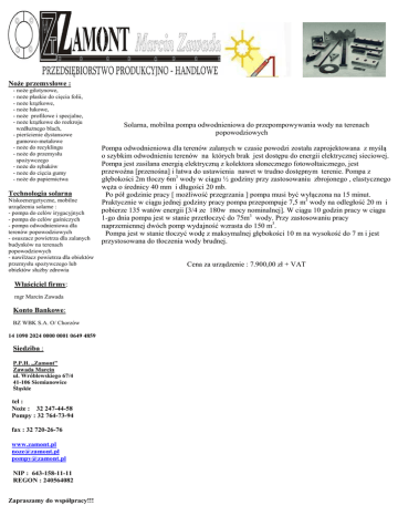 Noże przemysłowe : - noże gilotynowe, - noże płaskie do cięcia folii, - noże krążkowe, - noże łukowe, - noże profilowe i specjalne, - noże krążkowe do rozkroju wzdłużnego blach, - pierścienie dystansowe gumowo-metalowe - noże do recyklingu - noże do przemysłu spożywczego - noże do rębaków - noże do cięcia gumy - noże do papiernictwa Technologia solarna Niskoenergetyczne, mobilne urządzenia solarne : - pompa do celów irygacyjnych - pompa do celów gaśniczych - pompa odwodnieniowa dla terenów popowodziowych - osuszacz powietrza dla zalanych budynków na terenach popowodziowych - nawilżacz powietrza dla obiektów przemysłu spożywczego lub obiektów służby zdrowia Właściciel firmy: mgr Marcin Zawada Konto Bankowe: BZ WBK S.A. O/ Chorzów 14 1090 2024 0000 0001 0649 4859 Siedziba : P.P.H. „Zamont” Zawada Marcin ul. Wróblewskiego 67/4 41-106 Siemianowice Śląskie tel : Noże : 32 247-44-58 Pompy : 32 764-73-94 fax : 32 720-26-76 www.zamont.pl [email protected] [email protected] NIP : 643-158-11-11 REGON : 240564082 Zapraszamy do współpracy!!! Solarna, mobilna pompa odwodnieniowa do przepompowywania wody na terenach popowodziowych Pompa odwodnieniowa dla terenów zalanych w czasie powodzi została zaprojektowana z myślą o szybkim odwodnieniu terenów na których brak jest dostępu do energii elektrycznej sieciowej. Pompa jest zasilana energią elektryczną z kolektora słonecznego fotowoltaicznego, jest przewoźna [przenośna] i łatwa do ustawienia nawet w trudno dostępnym terenie. Pompa z głębokości 2m tłoczy 6m3 wody w ciągu ½ godziny przy zastosowaniu zbrojonego , elastycznego węża o średnicy 40 mm i długości 20 mb. Po pół godzinie pracy [ możliwość przegrzania ] pompa musi być wyłączona na 15 minut. Praktycznie w ciągu jednej godziny pracy pompa przepompuje 7,5 m3 wody na odległość 20 m i pobierze 135 watów energii [3/4 ze 180w mocy nominalnej]. W ciągu 10 godzin pracy w ciągu 1-go dnia pompa jest w stanie przetłoczyć do 75m3 wody. Przy zastosowaniu pracy naprzemiennej dwóch pomp wydajność wzrasta do 150 m3. Pompa jest w stanie tłoczyć wodę z maksymalnej głębokości 10 m na wysokość do 7 m i jest przystosowana do tłoczenia wody brudnej. Cena za urządzenie : 7.900,00 zł + VAT