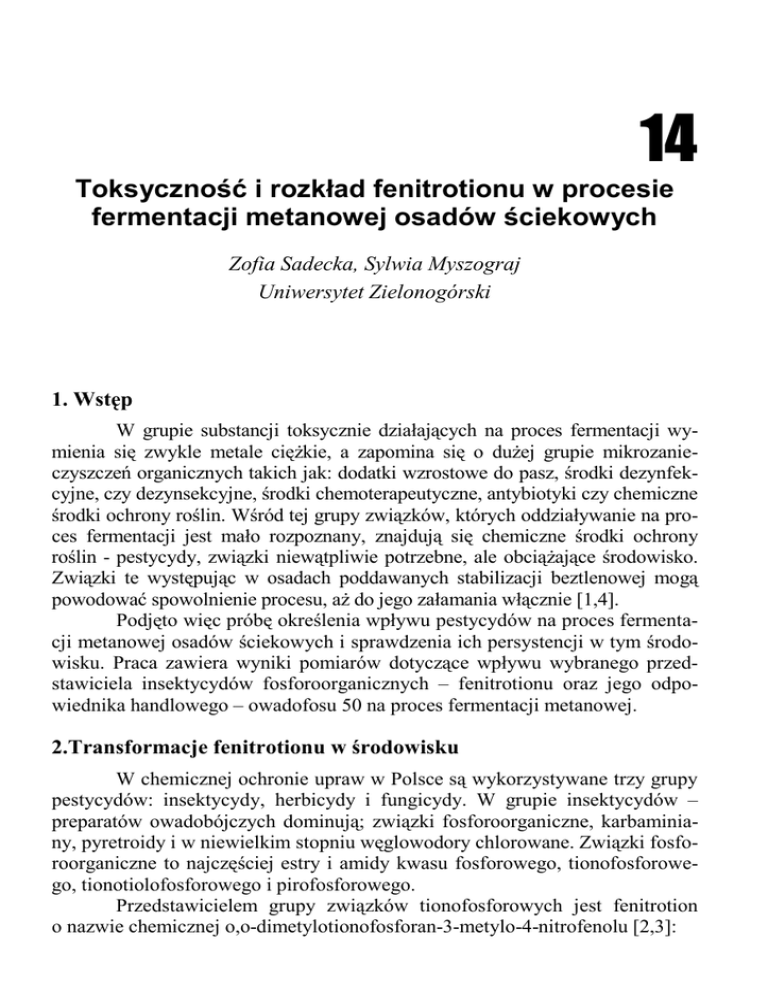 14 Toksyczność i rozkład fenitrotionu w procesie fermentacji metanowej osadów ściekowych Zofia Sadecka, Sylwia Myszograj Uniwersytet Zielonogórski 1. Wstęp W grupie substancji toksycznie działających na proces fermentacji wymienia się zwykle metale cięŜkie, a zapomina się o duŜej grupie mikrozanieczyszczeń organicznych takich jak: dodatki wzrostowe do pasz, środki dezynfekcyjne, czy dezynsekcyjne, środki chemoterapeutyczne, antybiotyki czy chemiczne środki ochrony roślin. Wśród tej grupy związków, których oddziaływanie na proces fermentacji jest mało rozpoznany, znajdują się chemiczne środki ochrony roślin - pestycydy, związki niewątpliwie potrzebne, ale obciąŜające środowisko. Związki te występując w osadach poddawanych stabilizacji beztlenowej mogą powodować spowolnienie procesu, aŜ do jego załamania włącznie [1,4]. Podjęto więc próbę określenia wpływu pestycydów na proces fermentacji metanowej osadów ściekowych i sprawdzenia ich persystencji w tym środowisku. Praca zawiera wyniki pomiarów dotyczące wpływu wybranego przedstawiciela insektycydów fosforoorganicznych – fenitrotionu oraz jego odpowiednika handlowego – owadofosu 50 na proces fermentacji metanowej. 2.Transformacje fenitrotionu w środowisku W chemicznej ochronie upraw w Polsce są wykorzystywane trzy grupy pestycydów: insektycydy, herbicydy i fungicydy. W grupie insektycydów – preparatów owadobójczych dominują; związki fosforoorganiczne, karbaminiany, pyretroidy i w niewielkim stopniu węglowodory chlorowane. Związki fosforoorganiczne to najczęściej estry i amidy kwasu fosforowego, tionofosforowego, tionotiolofosforowego i pirofosforowego. Przedstawicielem grupy związków tionofosforowych jest fenitrotion o nazwie chemicznej o,o-dimetylotionofosforan-3-metylo-4-nitrofenolu [2,3]: Zofia Sadecka, Sylwia Myszograj S CH3O CH3 P CH3O O NO2 Związek ten zaliczany jest do III klasy toksyczności [2,3,5]. Z danych literaturowych [2,3,5] wynika, Ŝe w transformacji fenitrotionu w środowisku dominują procesy polegające na: utleniającej reakcji desulfuracji do analogów tlenowych, o-dealkilowaniu, przerwaniu wiązania łączącego pierścień aromatyczny z resztą tiofosforanową oraz redukcji grupy nitrowej [2,3,5]. W przypadku tego związku, zauwaŜa się wysoką reaktywność podstawników przyłączonych do pierścienia fenylowego, które łatwo ulegają transformacji w układach biochemicznych o duŜej aktywności utleniająco-redukcyjnej. Przemiany, w których uczestniczy grupa metylowa, mogą polegać na jej utlenianiu, a nitrowa – na jej zredukowaniu. DuŜe znaczenie mają więc enzymy katalizujące reakcje utleniania i redukcji. Na uwagę zasługuje utleniająca desulfuracja polegająca na zastąpieniu atomu siarki podwójnie związanej z fosforem na atom tlenu. Produkt tej reakcji nazywany jest analogiem tlenowym (rysunek 1), i wykazuje wyŜszą toksyczność w porównaniu z fenitrotionem [3]. S CH3O P CH3 O NO2 CH3O CH3O CH3 O P O NO2 CH3O Rys. 1. Utleniająca reakcja desulfuracji w cząsteczce fenitrotionu [3] Fig. 1. Oxidizing and desulfuration reaction in the fenitrothion molecule [3] Estry metylowe w cząsteczce fenitrotionu, są podatne przede wszystkim na transformację S-alkilową (rysunek 2). CH3O S P CH3O CH3 O OH NO2 S P CH3 O NO2 CH3O Rys. 2. Transformacja S-alkilowa fenitrotionu [2,3] Fig. 2. Transformation s-alkylation in the fenitrothion molecule [2,3] 172 Środkowo-Pomorskie Towarzystwo Naukowe Ochrony Środowiska Toksyczność i rozkład fenitrotionu w procesie fermentacji metanowej ... Powstałe metabolity przemian są dobrze rozpuszczalne w wodzie lub tworzą w organizmach połączenia sprzęŜone (koniugaty). W przemianach tego związku istotna jest redukcja grupy nitrowej do nitrozowej i aminowej. Reakcje mogą zachodzić tylko w warunkach beztlenowych, a uczestniczą w niej grupy przyłączone do pierścienia aromatycznego. W wyniku tych reakcji powstaje aminofenitrotion (rysunek 3) oraz jego demetylowa pochodna. Jak podaje Grennhalg [3], są to główne produkty degradacji tego związku w procesach mikrobiologicznych zachodzących w beztlenowych strefach zbiorników wodnych. CH3O S P CH3O CH3 O CH3 NO2 S P CH3 O NH2 CH3O Rys. 3. Redukcja grupy nitrowej do aminowej w cząsteczce fenitrotionu [3] Fig. 3. Reduction of nitryl group to amine group in the fenitrothion molecule [3] Wszystkie metabolity zawierające grupę fenolową, powstają w następstwie przerwania wiązania O-P. Na rysunku 4 zamieszczono wzory wielu produktów przemian fenitrotionu [2,3]. Produktami przerwania wiązania O-P, są związki oznaczone na rysunku 4 następującymi cyframi rzymskimi: III, IX, X, XI, XIII, XV. Produktami utleniania grupy metylowej w pierścieniu aromatycznym są połączenia zawierające grupę hydroksylową (XIII-XVII) bądź karboksylową (VII i X). W wyniku utleniającej desulfuracji powstaje analog II, który dalej moŜe ulegać transformacjom polegającym na reakcjach związanych z przemianami podstawników przy pierścieniu aromatycznym (VII, XVI, XIX), czy teŜ reakcjom zachodzącym w reszcie tiofosforanowej (VI). Z doniesień literaturowych wynika, Ŝe do najwaŜniejszych metabolitów przemian fenitrotionu w zbiornikach wodnych naleŜy zaliczyć: analog aminowy (IV) i jego demetylową pochodną (V), takŜe analog tlenowy (II), kwas karboksylowy (VII) oraz 4- nitro-m.-krezol (III). Ten ostatni związek naleŜy równieŜ do najwaŜniejszych produktów degradacji fenitrotionu w glebie [3]. Środkowo-Pomorskie Towarzystwo Naukowe Ochrony Środowiska 173 Zofia Sadecka, Sylwia Myszograj CH3O CH3 S NO2 O CH3O m, s, ryby P CH3O CH3 S m, s ryby P m, p, i, s, uv NH2 O CH3O HO CH3 S P NH2 O CH3O (IV) (V Fenitrotion [LD50=740] ryby ptaki, uv m, p, i, t, uv uv, CH3O H S N C H CH3 O (IVa) O N C H CH3 (Va) O CH3 S NO2 O CH3S CH3 O P (I) NO2 O CH3O s, uv O CH3 HO m, p, uv P NO2 O CH3O S P CH3O P CH3O CH3O HO O P CH3O HO ryby (XII) CH3 CH3 S 
