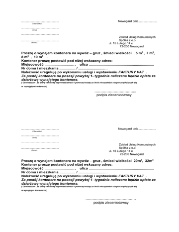 ............................................. Nowogard dnia...................... ( Nazwisko) ............................................. (Imię) ............................................. ............................................. (Adres) Zakład Usług Komunalnych Spółka z o.o. ul. 15 Lutego 14 c 72-200 Nowogard Proszę o wynajem kontenera na wywóz – gruz , śmieci wielkości 5 m3 , 7 m3, 8 m3 , 10 m3 . Kontener proszę postawić pod niżej wskazany adres: Miejscowość ............................. , ulica ................................................................. Nr domu i mieszkania ................ / ........................... . Należność ureguluję po wykonaniu usługi i wystawieniu FAKTURY VAT . Za postój kontenera na posesji powyżej 1- tygodnia naliczana będzie opłata za dzierżawę wynajętego kontenera. ( Oświadczam , że biorę całkowitą odpowiedzialność i ponoszę koszty za ilość nieczystości stałych znajdujących się w wynajętym kontenerze) …………………………….. podpis zleceniodawcy ............................................. Nowogard dnia..................... ( Nazwisko) ............................................. (Imię) ............................................. ............................................. (Adres) Zakład Usług Komunalnych Spółka z o.o. ul. 15 Lutego 14 c 72-200 Nowogard Proszę o wynajem kontenera na wywóz – gruz , śmieci wielkości 20m3, 32m3 Kontener proszę postawić pod niżej wskazany adres: Miejscowość ............................. , ulica ................................................................. Nr domu i mieszkania ................ / ........................... . Należność ureguluję po wykonaniu usługi i wystawieniu FAKTURY VAT . Za postój kontenera na posesji powyżej 1- tygodnia naliczana będzie opłata za dzierżawę wynajętego kontenera. ( Oświadczam , że biorę całkowitą odpowiedzialność i ponoszę koszty za ilość nieczystości stałych znajdujących się w wynajętym kontenerze ) …………………………………… podpis zleceniodawcy