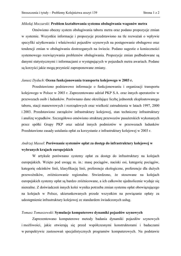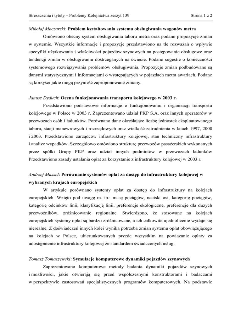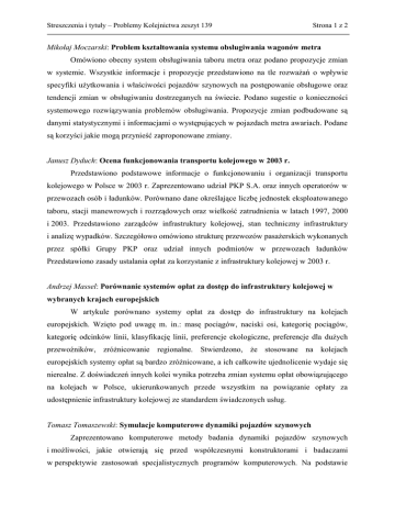 Streszczenia i tytuły – Problemy Kolejnictwa zeszyt 139 Strona 1 z 2 Mikołaj Moczarski: Problem kształtowania systemu obsługiwania wagonów metra Omówiono obecny system obsługiwania taboru metra oraz podano propozycje zmian w systemie. Wszystkie informacje i propozycje przedstawiono na tle rozważań o wpływie specyfiki użytkowania i właściwości pojazdów szynowych na postępowanie obsługowe oraz tendencji zmian w obsługiwaniu dostrzeganych na świecie. Podano sugestie o konieczności systemowego rozwiązywania problemów obsługiwania. Propozycje zmian podbudowane są danymi statystycznymi i informacjami o występujących w pojazdach metra awariach. Podane są korzyści jakie mogą przynieść zaproponowane zmiany. Janusz Dyduch: Ocena funkcjonowania transportu kolejowego w 2003 r. Przedstawiono podstawowe informacje o funkcjonowaniu i organizacji transportu kolejowego w Polsce w 2003 r. Zaprezentowano udział PKP S.A. oraz innych operatorów w przewozach osób i ładunków. Porównano dane określające liczbę jednostek eksploatowanego taboru, stacji manewrowych i rozrządowych oraz wielkość zatrudnienia w latach 1997, 2000 i 2003. Przedstawiono zarządców infrastruktury kolejowej, stan techniczny infrastruktury i analizę wypadków. Szczegółowo omówiono strukturę przewozów pasażerskich wykonanych przez spółki Grupy PKP oraz udział innych podmiotów w przewozach ładunków Przedstawiono zasady ustalania opłat za korzystanie z infrastruktury kolejowej w 2003 r. Andrzej Massel: Porównanie systemów opłat za dostęp do infrastruktury kolejowej w wybranych krajach europejskich W artykule porównano systemy opłat za dostęp do infrastruktury na kolejach europejskich. Wzięto pod uwagę m. in.: masę pociągów, naciski osi, kategorię pociągów, kategorię odcinków linii, klasyfikację linii, preferencje ekologiczne, preferencje dla dużych przewoźników, zróżnicowanie regionalne. Stwierdzono, że stosowane na kolejach europejskich systemy opłat są bardzo zróżnicowane, a ich całkowite ujednolicenie wydaje się nierealne. Z doświadczeń innych kolei wynika potrzeba zmian systemu opłat obowiązującego na kolejach w Polsce, ukierunkowanych przede wszystkim na powiązanie opłaty za udostępnienie infrastruktury kolejowej ze standardem świadczonych usług. Tomasz Tomaszewski: Symulacje komputerowe dynamiki pojazdów szynowych Zaprezentowano komputerowe metody badania dynamiki pojazdów szynowych i możliwości, jakie otwierają się przed współczesnymi konstruktorami i badaczami w perspektywie zastosowań specjalistycznych programów komputerowych. Na podstawie Streszczenia i tytuły – Problemy Kolejnictwa zeszyt 139 Strona 2 z 2 trzech prac symulacyjnych, badań wagonu osobowego, towarowego i autobusu szynowego, pokazano możliwości wykorzystania programów do automatycznej analizy dynamicznej w codziennej pracy konstruktora pracującego nad optymalizacją zachowań dynamicznych taboru szynowego. Kazimierz Towpik: Kolej magnetyczna Omówiono istniejące systemy kolei magnetycznej - zasady działania, warunki projektowania trasy, konstrukcję toru oraz eksploatowany tabor. Omówiono również obecny stan rozwoju i zastosowań praktycznych, jak również prognozy dalszego rozwoju kolei magnetycznej. Halina Sekita: Rola WKD w transporcie aglomeracji warszawskiej W artykule przedstawiono historię Warszawskiej Kolei Dojazdowej, scharakteryzowano wykorzystywany i perspektywiczny tabor przewozowy, system taryfowy, a także infrastrukturę liniową i punktową. Omówiono również ofertę przewozową oraz kierunki jej poprawy i rozszerzenia. Janusz Poliński: Wykorzystanie do przewozów pasażerskich linii bocznicowej Huty Lucchini Omówiono elementy koncepcji (pomysły, sugestie, rozwiązania systemowe) dotyczącej utworzenia nowych pasażerskich relacji przewozowych na terenie aglomeracji warszawskiej, związanych z wykorzystaniem linii bocznicowej, od Huty Lucchini do stacji Warszawa Jelonki. Przedstawiono warianty relacji przewozowych. Zaproponowano tabor przewozowy i miejsca lokalizacji przystanków. Piotr Peszek: Integracja transportu miejskiego i kolejowego na przykładzie Ozorkowa Przedstawiono koncepcję wydłużenia linii tramwaju podmiejskiego w Ozorkowie, od obecnej pętli tramwajowej do dworca kolejowego, po dawnym torowisku kolejki dojazdowej. Zaproponowano utworzenie obok tego dworca węzła integracyjnego skupiającego bezpośrednio linię tramwajową, linię Krośniewickiej Kolei Dojazdowej (szerokość toru 750 mm) oraz linię kolejową o szerokości toru 1435 mm. Działania takie umożliwiłoby zwiększenie dostępności mieszkańców Ozorkowa do dworca kolejowego i dawałoby szansę na odtworzenie połączenia komunikacyjnego z wykorzystaniem Krośniewickiej Kolei Dojazdowej.
