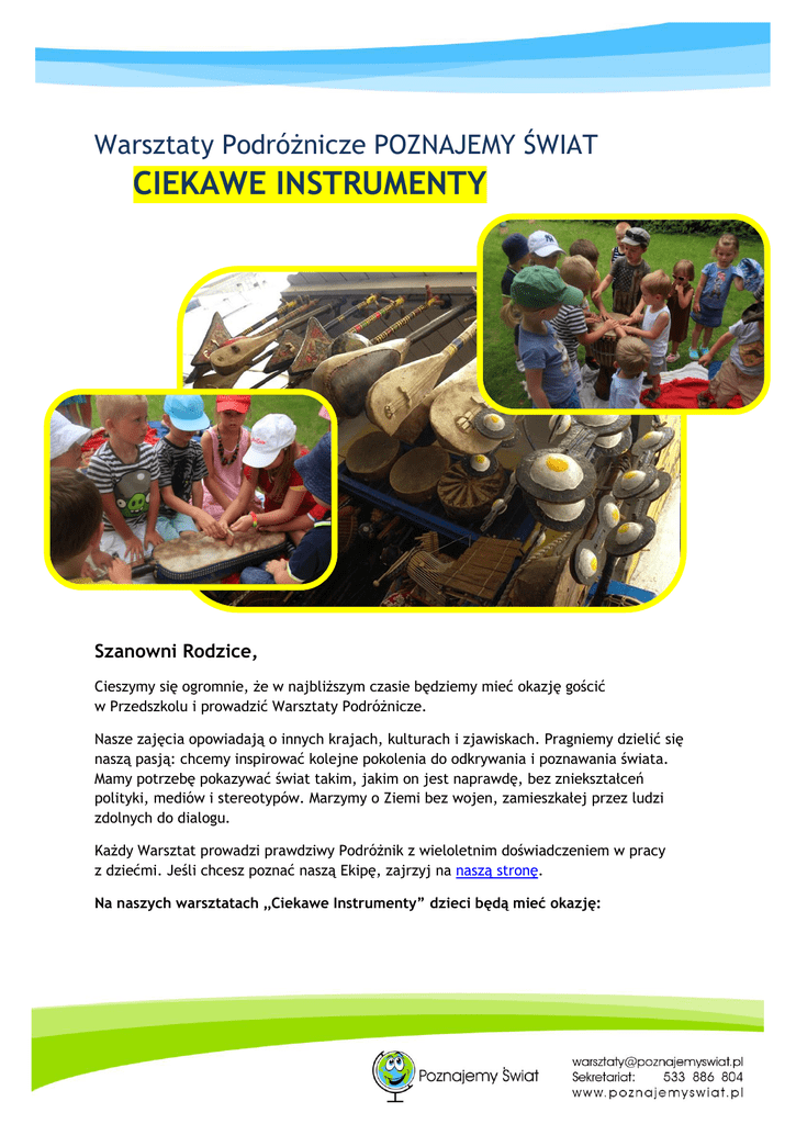 Warsztaty Podróżnicze POZNAJEMY ŚWIAT CIEKAWE INSTRUMENTY Szanowni Rodzice, Cieszymy się ogromnie, że w najbliższym czasie będziemy mieć okazję gościć w Przedszkolu i prowadzić Warsztaty Podróżnicze. Nasze zajęcia opowiadają o innych krajach, kulturach i zjawiskach. Pragniemy dzielić się naszą pasją: chcemy inspirować kolejne pokolenia do odkrywania i poznawania świata. Mamy potrzebę pokazywać świat takim, jakim on jest naprawdę, bez zniekształceń polityki, mediów i stereotypów. Marzymy o Ziemi bez wojen, zamieszkałej przez ludzi zdolnych do dialogu. Każdy Warsztat prowadzi prawdziwy Podróżnik z wieloletnim doświadczeniem w pracy z dziećmi. Jeśli chcesz poznać naszą Ekipę, zajrzyj na naszą stronę. Na naszych warsztatach „Ciekawe Instrumenty” dzieci będą mieć okazję: Zagrać na instrumentach z całego świata i doświadczyć ich brzmienia (na przykład australijskie didgeridoo, tybetańska śpiewająca misa, gong tybetański, peruwiańska lluvia seca, nikaraguańskie marakasy, estońska okaryna, marokańska gnaoua). Przypatrzeć się, jak zrobione są instrumenty i poznać historię niektórych z nich. Odkryć, że dźwięk można nie tylko usłyszeć, lecz również poczuć i zobaczyć. W sposób praktyczny sprawdzić, z czego składa się muzyka. Zrobić własne grzechotki i zabrać sobie na pamiątką. Aby inspirować i ułatwiać pracę w obszarze edukacji międzykulturowej stworzyliśmy „Kufer Pomysłów” dla Rodziców i Wychowawców. W Kufrze są kolorowanki, muzyka, przepisy kulinarne, „zrób to sam” i przykłady zabaw z różnych krańców świata. Zachęcamy do wspólnej zabawy! Organizujemy również Podróżnicze Urodziny w Warszawie, Krakowie oraz Mielcu. Zadzwoń i zamów przyjęcie dla Twojego Dziecka: Marta: +48 533 886 804, [email protected] Przygotowaliśmy dla Ciebie specjalny rabat o wartości 50 zł. Masz pytanie? Napisz [email protected]. Zapraszamy - polub nas na Facebooku, by na bieżąco mieć informacje o nowych warsztatach i promocjach. Z podróżniczym pozdrowieniem, Magda i Marcin Musiałowie i cały zespół POZNAJEMY ŚWIAT www.poznajemyswiat.pl