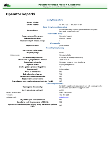 Powiatowy Urząd Pracy w Kluczborku http://pupkluczbork.pl/oferta/6344/operator-koparki Operator koparki Identyfikacja oferty Numer oferty: Oferta ważna: od 2017-02-17 do 2017-03-17 Dane firmy/przedsiębiorstwa Przedsiębiorstwo Produkcyjno Handlowo Usługowe Dromena Irena Sztolcman Nazwa firmy: Stanowisko pracy Nazwa stanowiska pracy: Operator koparki Zakres obowiązków: obsługa koparki Liczba wolnych miejsc pracy: 1 Wymagania Wykształcenie: podstawowe Warunki płacy i pracy Data rozpoczęcia pracy: Miejsce pracy: Polska Miejscowość: Wręczyca Mała System wynagrodzenia: Czasowy ze stawką miesięczną Minimalne wynagrodzenie brutto: Rodzaj zatrudnienia: 2500.00 PLN Umowa o pracę na czas określony Wymiar etatu: w pełnym wymiarze Liczba godzin pracy w tygodniu: 40 Zmianowość: jedna zmiana Praca w wolne dni: NIE Zatrudnienie od zaraz: TAK Zapewnienie zakwaterowania: NIE Zapewnienie wyżywienia: NIE Pracodawca pokrywa koszty przejazdu do Polski: NIE Sposób Aplikowania Wymagane dokumenty: Język składania aplikacji: kontakt bezpośrednio do pracodawcy lub proszę przesłać CV na adres [email protected] polski Osoba do kontaktu: Irena Sztolcman Telefon: 792 884 910 Adres e-mail: pokaż adres Czy oferta jest subsydiowana: NIE Czy oferta jest finansowana z PFRON: NIE Upowszechnienie krajowej oferty pracy na terenie państw EOG: NIE
