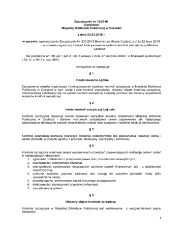 Zarządzenie nr 16/2016 Dyrektora Miejskiej Biblioteki Publicznej w Czeladzi z dnia 23.03.2016 r. w sprawie: wprowadzenia Zarządzenia Nr 231/2015 Burmistrza Miasta Czeladź z dnia 22 lipca 2015 r. w sprawie organizacji i zasad funkcjonowania systemu kontroli zarządczej w Mieście Czeladzi Na podstawie art. 69 ust 1 pkt 2 i pkt 3 ustawy z dnia 27 sierpnia 2009 r. o finansach publicznych ( Dz. U. z 2013 r. poz. 885). zarządzam co następuje: §1 Postanowienia ogólne Zarządzenia określa organizacje i funkcjonowanie systemu kontroli zarządczej w Miejskiej Bibliotece Publicznej w Czeladzi w tym: istotę i cele kontroli zarządczej, obszary objęte kontrolą zarządczą, dokumentację składająca się na system kontroli zarządczej i zasady procesu samooceny wypełnienia kryteriów kontroli zarządczej. §2 Istota kontroli zarządczej i jej cele Kontrola zarządcza obejmuje swoim zakresem wszystkie aspekty działalności Miejskiej Biblioteki Publicznej w Czeladzi i stanowi instrument zarządzania celem zapewnienia jak najlepszego zaspokajania zbiorowych potrzeb mieszkańców miasta oraz sprawnej i rzetelnej obsługi interesantów. §3 Kontrolę zarządczą stanowią wszystkie działania podejmowane dla zapewnienia realizacji celów i zadań jednostki w sposób zgodny z prawem, efektywny, oszczędny i terminowy. §4 Kontrola zarządcza obejmuje zespół systemowych rozwiązań zapewniających realizację celów i zadań w następujących obszarach: 1. zgodność działalności z przepisami prawa oraz procedurami wewnętrznymi, 2. skuteczność i efektywność działania, 3. wiarygodność sprawozdań, dotyczących zarówno kwestii finansowych jak i z działalności merytorycznej, 4. ochronę zasobów poprzez zadbanie aby dostęp do zasobów jednostki miały tylko upoważnione osoby, 5. przestrzeganie i promowanie zasad etycznego postępowania, 6. efektywność i skuteczność przepływu informacji, 7. zarządzanie ryzykiem . §5 Obszary objęte kontrola zarządczą Kontrola zarządcza w Miejskiej Bibliotece Publicznej jest realizowana obszarów: z uwzględnieniem pięciu 1 1) Środowisko wewnętrzne – jest fundamentem dla wszystkich pozostałych elementów systemu kontroli zarządczej i obejmuje działania w zakresie: przestrzegania wartości etycznych, zapewnienia kompetencji zawodowych pracowników, zapewnienie struktury organizacyjnej odpowiadającej celom i zadaniom jednostki, prawidłowe delegowanie uprawnień, 2) Cele i zarządzanie ryzykiem – mają na celu zwiększenie prawdopodobieństwa osiągnięcia celów i realizacji zadań miedzy innymi poprzez sformułowanie przez Dyrektora Misji jednostki, określenie celów i zadań oraz monitorowanie ich realizacji, identyfikację, analizę ryzyka i określenie reakcji na ryzyko. 3) Mechanizmy kontroli- stanowią odpowiedź na konkretne ryzyko poprzez podejmowanie działań w zakresie: dokumentowania systemu kontroli zarządczej, nadzór nad wykonaniem zadań, zapewnienie ciągłości działalności jednostki, zapewnienie właściwej ochrony i wykorzystania zasobów jednostki, wdrożenia szczegółowych mechanizmów kontroli dotyczących operacji gospodarczych w tym finansowych, określenie mechanizmów kontroli zapewniających bezpieczeństwo danych i systemów informatycznych. 4) Informacji i komunikacja- standardy mające zapewnić pracownikom jednostki dostęp do informacji (bieżącej, wewnętrznej w ramach jednostki, zewnętrznej z podmiotami zewnętrznymi) niezbędnych do wykonywania przez nich obowiązków. 5) Monitorowanie i ocena- mają stanowić bieżącą ocenę skuteczności systemu kontroli jego poszczególnych elementów poprzez: monitorowanie systemu kontroli zarządczej, prowadzenie samooceny, działania prowadzone przez służby audytu, uzyskanie corocznej informacji o stanie kontroli zarządczej. §6 Dyrektor ma obowiązek wspierać i promować przestrzegania wartości etycznych, a wszyscy pracownicy niezależnie od zajmowanego stanowiska są zobowiązani do wykonywania powierzonych obowiązków z zachowaniem osobistej i zawodowej uczciwości. W Miejskiej Bibliotece Publicznej w Czeladzi akceptowane są tylko takie zachowania pracowników, które są nienaganne oraz ocenione w powszechnej opinii jako etyczne. §7 Zasady etyki w Miejskiej Bibliotece Publicznej w Czeladzi reguluje Kodeks etyki pracowników. §8 Dyrektor zapewnia swoim pracownikom rozwój kompetencji zawodowych w różnych formach edukacyjnych: studia podyplomowe, szkolenia, kursy i określają to w wewnętrznych procedurach podnoszenia kwalifikacji zawodowych. §9 Każdy pracownik posiada umowę o pracę, precyzyjnie określony zakres obowiązków służbowych w formie pisemnej. Zakresy czynności są aktualizowane wraz ze zmianą stanowiska pracownika, zakresu jego obowiązków w ramach struktury organizacyjnej wynikającej z Regulaminu Organizacyjnego. § 10 Zakres zadań poszczególnych Działów w Miejskiej Bibliotece Publicznej w Czeladzi jest ustalany w Regulaminie Organizacyjnym. 2 § 11 Struktura organizacyjna Miejskiej Biblioteki Publicznej w Czeladzi jest cyklicznie analizowana, powinna być dostosowana do celów i zadań, skonstruowana w sposób pozwalający na realizację zadań i celów jednostki określonych w powszechnie obowiązujących przepisach prawa i aktach prawa miejscowego. § 12 W Miejskiej Bibliotece Publicznej w Czeladzi obowiązują zasady w zakresie delegowania uprawnień dla poszczególnych pracowników. Upoważnienia/ pełnomocnictwa imienne w formie pisemnej wydawane przez Dyrektora są ewidencjonowane w przeznaczonym do tego rejestrze. Uprawnienia deleguje się w zakresie adekwatnym do wagi podejmowanych decyzji, stopnia ich skomplikowania i ryzyka z nim związanego. Przyjęcie delegowanych uprawnień potwierdza się podpisem. § 13 Polityka zarządzania ryzykiem w Miejskiej Bibliotece Publicznej w Czeladzi uregulowana jest odrębnym zarządzeniem. Proces zarządzania ryzykiem powinien być dokumentowany. § 14 System