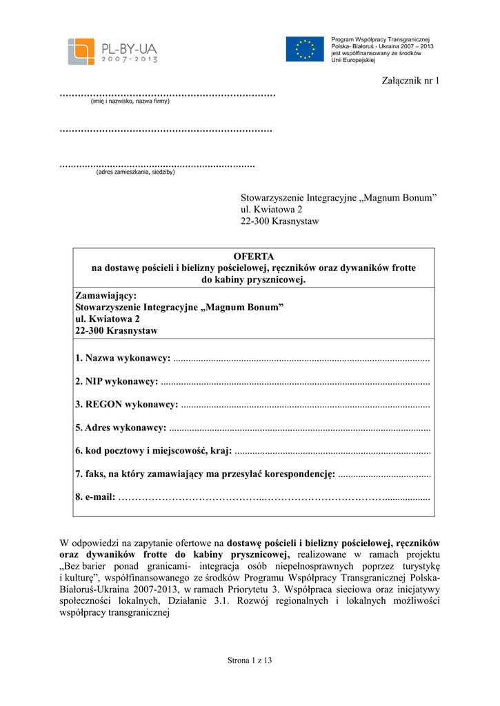 Program Współpracy Transgranicznej Polska- Białoruś - Ukraina 2007 – 2013 jest współfinansowany ze środków Unii Europejskiej Załącznik nr 1 ....................................................................... (imię i nazwisko, nazwa firmy) ...................................................................... ...................................................................... (adres zamieszkania, siedziby) Stowarzyszenie Integracyjne „Magnum Bonum” ul. Kwiatowa 2 22-300 Krasnystaw OFERTA na dostawę pościeli i bielizny pościelowej, ręczników oraz dywaników frotte do kabiny prysznicowej. Zamawiający: Stowarzyszenie Integracyjne „Magnum Bonum” ul. Kwiatowa 2 22-300 Krasnystaw 1. Nazwa wykonawcy: ...................................................................................................... 2. NIP wykonawcy: ........................................................................................................... 3. REGON wykonawcy: ................................................................................................... 5. Adres wykonawcy: ........................................................................................................ 6. kod pocztowy i miejscowość, kraj: .............................................................................. 7. faks, na który zamawiający ma przesyłać korespondencję: ..................................... 8. e-mail: ……………………………………..……………………………….................. W odpowiedzi na zapytanie ofertowe na dostawę pościeli i bielizny pościelowej, ręczników oraz dywaników frotte do kabiny prysznicowej, realizowane w ramach projektu „Bez barier ponad granicami- integracja osób niepełnosprawnych poprzez turystykę i kulturę”, współfinansowanego ze środków Programu Współpracy Transgranicznej PolskaBiałoruś-Ukraina 2007-2013, w ramach Priorytetu 3. Współpraca sieciowa oraz inicjatywy społeczności lokalnych, Działanie 3.1. Rozwój regionalnych i lokalnych możliwości współpracy transgranicznej Strona 1 z 13 Program Współpracy Transgranicznej Polska- Białoruś - Ukraina 2007 – 2013 jest współfinansowany ze środków Unii Europejskiej 1. Oferuję wykonanie zamówienia określonego w zapytaniu ofertowym i wzorze umowy w terminie określonym w zapytaniu ofertowym za łączną cenę brutto…....................................zł, słownie:….......................................................................... ..........................................................................................................zł), na którą składa się: L.p. Przedmiot zamówienia Producent model, nr Ilość katalogowy** 1. Kołdra 52 szt. 2. Poduszka 52 szt. 3. Prześcieradło 104 szt. 4. Poszewka na poduszkę 104 szt. 5. Poszwa na kołdrę 104 szt. 6. Ręcznik 70×140 cm 104 szt. 7. Ręcznik 50×70 cm 104 szt. 8. Dywanik frotte do kabiny prysznicowej 52 szt. Cena netto za 1szt. ** Wartość netto** VAT** Łączna cena brutto** Razem ** wypełnia wykonawca 2. Oświadczam/y, że zapoznałam/łem/liśmy się z niniejszym zapytaniem i nie wnoszę/simy zastrzeżeń oraz uzyskałam/em/liśmy konieczne informacje do przygotowania oferty. ……………………………………………… podpis osoby/osób uprawnionej/ych do reprezentowania wykonawcy Strona 2 z 13 Program Współpracy Transgranicznej Polska- Białoruś - Ukraina 2007 – 2013 jest współfinansowany ze środków Unii Europejskiej Załącznik nr 2 …………………………………………. (miejscowość i data) ……………………………….. (Imię i nazwisko/Nazwa Oferenta) Oświadczenie o spełnieniu warunków udziału w postępowaniu Oświadczam, iż spełniam warunki udziału w postępowaniu określone w Zapytaniu Ofertowym nr 4/PL-BY-UA/2015. 1. Znajduję się w sytuacji ekonomicznej i finansowej zapewniającej wykonanie zamówienia. 2. Brak jest podstaw do wykluczenia tj: W ciągu ostatnich 3 lat przed wszczęciem postępowania nie wyrządziłem szkody, nie wykonując zamówienia lub wykonując je nienależycie. Nie otwarto wobec mnie likwidacji ani nie ogłoszono upadłości. Nie zalegam z uiszczeniem podatków, opłat lub składek na ubezpieczenia społeczne lub zdrowotne Nie zostałem prawomocnie skazany za przestępstwo popełnione w związku z postępowaniem o udzielenie zamówienia, przestępstwo przekupstwa, przestępstwo przeciwko obrotowi gospodarczemu lub inne przestępstwo popełnione w celu osiągnięcia korzyści majątkowych Jako wspólnik spółki jawnej, partner lub członek zarządu spółki partnerskiej; komplementariusz spółki komandytowej oraz spółki komandytowo-akcyjnej; członek organu zarządzającego osoby prawnej nie zostałem prawomocnie skazany za przestępstwo popełnione w związku z postępowaniem o udzielenie zamówienia, przestępstwo przekupstwa, przestępstwo przeciwko obrotowi gospodarczemu lub inne przestępstwo popełnione w celu osiągnięcia korzyści majątkowych. Jako podmiot zbiorowy sąd nie orzekł wobec mnie zakazu ubiegania się o zamówienia, na podstawie przepisów o odpowiedzialności podmiotów zbiorowych za czyny zabronione pod groźbą kary. ……………………………………… Podpis Oferenta Strona 3 z 13 Program Współpracy Transgranicznej Polska- Białoruś - Ukraina 2007 – 2013 jest współfinansowany ze środków Unii Europejskiej Załącznik nr 3 …………………………………………. (miejscowość i data) ……………………………….. (Imię i nazwisko/Nazwa Oferenta) Oświadczenie Oferenta Oświadczam, że posiadam niezbędną wiedzę i doświadczenie oraz dysponuję potencjałem technicznym i osobami zdolnymi do wykonania zamówienia. ……………………………………….. (podpis Oferenta) Strona 4 z 13 Program Współpracy Transgranicznej Polska- Białoruś - Ukraina 2007 – 2013 jest współfinansowany ze środków Unii Euro