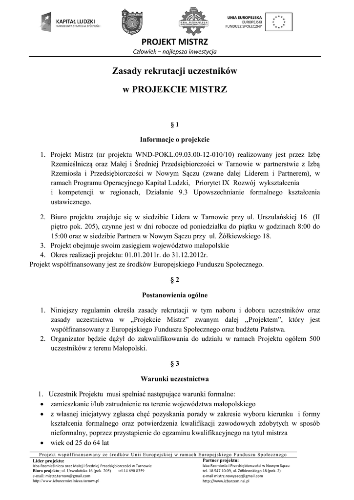PROJEKT MISTRZ Człowiek – najlepsza inwestycja Zasady rekrutacji uczestników w PROJEKCIE MISTRZ §1 Informacje o projekcie 1. Projekt Mistrz (nr projektu WND-POKL.09.03.00-12-010/10) realizowany jest przez Izbę Rzemieślniczą oraz Małej i Średniej Przedsiębiorczości w Tarnowie w partnerstwie z Izbą Rzemiosła i Przedsiębiorczości w Nowym Sączu (zwane dalej Liderem i Partnerem), w ramach Programu Operacyjnego Kapitał Ludzki, Priorytet IX Rozwój wykształcenia i kompetencji w regionach, Działanie 9.3 Upowszechnianie formalnego kształcenia ustawicznego. 2. Biuro projektu znajduje się w siedzibie Lidera w Tarnowie przy ul. Urszulańskiej 16 (II piętro pok. 205), czynne jest w dni robocze od poniedziałku do piątku w godzinach 8:00 do 15:00 oraz w siedzibie Partnera w Nowym Sączu przy ul. Żółkiewskiego 18. 3. Projekt obejmuje swoim zasięgiem województwo małopolskie 4. Okres realizacji projektu: 01.01.2011r. do 31.12.2012r. Projekt współfinansowany jest ze środków Europejskiego Funduszu Społecznego. §2 Postanowienia ogólne 1. Niniejszy regulamin określa zasady rekrutacji w tym naboru i doboru uczestników oraz zasady uczestnictwa w „Projekcie Mistrz” zwanym dalej ,,Projektem”, który jest współfinansowany z Europejskiego Funduszu Społecznego oraz budżetu Państwa. 2. Organizator będzie dążył do zakwalifikowania do udziału w ramach Projektu ogółem 500 uczestników z terenu Małopolski. §3 Warunki uczestnictwa 1. Uczestnik Projektu musi spełniać następujące warunki formalne: zamieszkanie i/lub zatrudnienie na terenie województwa małopolskiego z własnej inicjatywy zgłasza chęć pozyskania porady w zakresie wyboru kierunku i formy kształcenia formalnego oraz potwierdzenia kwalifikacji zawodowych zdobytych w sposób nieformalny, poprzez przystąpienie do egzaminu kwalifikacyjnego na tytuł mistrza wiek od 25 do 64 lat P roj ekt wsp ółfin ans owan y ze środk ów Unii Eu rop ej ski ej w ram ach Eu rop ej ski ego Fundu s zu Sp ołec zn ego Partner projektu: Lider projektu: Izba Rzemieślnicza oraz Małej i Średniej Przedsiębiorczości w Tarnowie Biuro projektu; ul. Urszulańska 16 (pok. 205) tel.14 690 8359 e-mail: [email protected] http://www.izbarzemieslnicza.tarnow.pl Izba Rzemiosła i Przedsiębiorczości w Nowym Sączu tel. 18 547 10 09, ul. Żółkiewskiego 18 (pok. 2) e-mail [email protected] http://www.izbarzem.nsi.pl PROJEKT MISTRZ Człowiek – najlepsza inwestycja 2. Kolejnym kryterium będzie spełnienie warunków zgodnych z Rozporządzeniem MEN z dnia 12.10.2005r. (Dz.U. Nr 215, poz.1820) uprawniających do przystąpienia do egzaminu mistrzowskiego oraz zgodnych z Rozporządzeniem MEN z dnia 03.02.2006r. (Dz.U. Nr 31 poz.216) uprawniających do przystąpienia do egzaminu kwalifikacyjnego na tytuł mistrza. 3. Warunki niezbędne do uzyskania tytułu mistrza i przyjęcia do Projektu. Kandydat powinien spełnić jeden z następujących warunków: posiada tytuł czeladnika lub równorzędny w zawodzie, w którym zdaje egzamin, i po uzyskaniu tytułu zawodowego co najmniej trzyletni staż pracy w tym zawodzie albo łącznie przed i po uzyskaniu tytułu zawodowego co najmniej sześcioletni staż pracy w zawodzie, w którym zdaje egzamin, oraz świadectwo ukończenia szkoły ponadgimnazjalnej albo dotychczasowej szkoły ponadpodstawowej; przez okres co najmniej sześciu lat w ramach samodzielnie prowadzonej działalności gospodarczej wykonywał zawód, w którym zdaje egzamin, i posiada świadectwo ukończenia szkoły ponadgimnazjalnej albo dotychczasowej szkoły ponadpodstawowej; posiada tytuł czeladnika lub równorzędny w zawodzie wchodzącym w zakres zawodu, w którym zdaje egzamin, i po uzyskaniu tytułu zawodowego co najmniej trzyletni staż pracy w zawodzie, w którym zdaje egzamin, oraz świadectwo ukończenia szkoły ponadgimnazjalnej albo dotychczasowej szkoły ponadpodstawowej; posiada tytuł mistrza w zawodzie wchodzącym w zakres zawodu, w którym zdaje egzamin, i po uzyskaniu tytułu mistrza co najmniej roczny staż pracy w zawodzie, w którym zdaje egzamin, oraz świadectwo ukończenia szkoły ponadgimnazjalnej albo dotychczasowej szkoły ponadpodstawowej; posiada świadectwo ukończenia szkoły ponadgimnazjalnej lub dotychczasowej szkoły ponadpodstawowej, dających wykształcenie średnie, w zawodzie wchodzącym w zakres zawodu, w którym zdaje egzamin, i tytuł zawodowy w zawodzie wchodzącym w zakres zawodu, w którym zdaje egzamin, oraz po uzyskaniu tytułu zawodowego co najmniej dwuletni staż pracy w zawodzie, w którym zdaje egzamin; posiada świadectwo ukończenia szkoły ponadgimnazjalnej albo szkoły ponadpodstawowej, dających wykształcenie średnie, oraz dyplom potwierdzający kwalifikacje zawodowe w zawodzie obejmującym zakres zawodu, w którym zdaje egzamin kwalifikacyjny, oraz dwuletni staż pracy w zawodzie, w którym zdaje egzamin kwalifikacyjny (dotyczy jedynie zawodu kucharz małej gastronomii i sprzedawca); posiada dyplom ukończenia szkoły wyższej na kierunku lub w specjalności w zakresie wchodzącym w zakres zawodu, w którym zdaje egzamin, i po uzyskaniu tytułu zawodowego co najmniej roczny staż pracy w zawodzie, w którym zdaje egzamin. P roj ekt wsp ółfin ans owan y ze środk ów Unii Eu rop ej ski ej w ram ach Eu rop ej ski ego Fundu s zu Sp ołec zn ego Partner projektu: Lider projektu: Izba Rzemieślnicza oraz Małej i Średniej Przedsiębiorczości w Tarnowie Biuro projektu; ul. Urszulańska 16 (pok. 205) tel.14 690 8359 e-mail: [email protected] http://www.izbarzemieslnicza.tarnow.pl Izba Rzemiosła i Przedsiębiorczości w Nowym Sączu tel. 18 547 10 09, ul. Żółkiewskiego 18 (pok. 2) e-mail [email protected] http://www.izbarzem.nsi.pl PROJEKT MISTRZ Człowiek – najlepsza inwestycja 4. Dokumenty, które należy złożyć aby przystąpić do egzaminu mistrzowskiego: wniosek o dopuszczenie do egzaminu mistrzowskiego kopie dokumentów potwierdzających spełnienie w/w w
