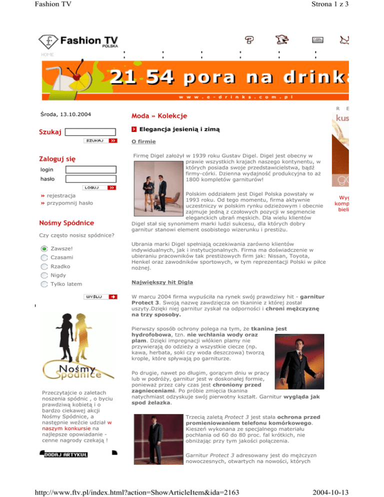 Fashion TV Strona 1 z 3 R Środa, 13.10.2004 Szukaj E Moda » Kolekcje Elegancja jesienią i zimą O firmie Zaloguj się login hasło » rejestracja » przypomnij hasło Nośmy Spódnice Czy często nosisz spódnice? Zawsze! Czasami Rzadko Firmę Digel założył w 1939 roku Gustav Digel. Digel jest obecny w prawie wszystkich krajach naszego kontynentu, w których posiada swoje przedstawicielstwa, bądź firmy-córki. Dzienna wydajność produkcyjna to aż 1800 kompletów garniturów! Polskim oddziałem jest Digel Polska powstały w 1993 roku. Od tego momentu, firma aktywnie uczestniczy w polskim rynku odzieżowym i obecnie zajmuje jedną z czołowych pozycji w segmencie eleganckich ubrań męskich. Dla wielu klientów Digel stał się synonimem marki ludzi sukcesu, dla których dobry garnitur stanowi element osobistego wizerunku i prestiżu. Wyg komp bieli Ubrania marki Digel spełniają oczekiwania zarówno klientów indywidualnych, jak i instytucjonalnych. Firma ma doświadczenie w ubieraniu pracowników tak prestiżowych firm jak: Nissan, Toyota, Henkel oraz zawodników sportowych, w tym reprezentacji Polski w piłce nożnej. Nigdy Tylko latem Największy hit Digla W marcu 2004 firma wypuściła na rynek swój prawdziwy hit - garnitur Protect 3. Swoją nazwę zawdzięcza on tkaninie z której został uszyty.Dzięki niej garnitur zyskał na odporności i chroni mężczyznę na trzy sposoby. Pierwszy sposób ochrony polega na tym, że tkanina jest hydrofobowa, tzn. nie wchłania wody oraz plam. Dzięki impregnacji włókien plamy nie przywierają do odzieży a wszystkie ciecze (np. kawa, herbata, soki czy woda deszczowa) tworzą krople, które spływają po garniturze. Przeczytajcie o zaletach noszenia spódnic , o byciu prawdziwą kobietą i o bardzo ciekawej akcji Nośmy Spódnice, a następnie weźcie udział w naszym konkursie na najlepsze opowiadanie cenne nagrody czekają ! Po drugie, nawet po długim, gorącym dniu w pracy lub w podróży, garnitur jest w doskonałej formie, ponieważ przez cały czas jest chroniony przed zagnieceniami. Po próbie zmięcia tkanina natychmiast odzyskuje swój pierwotny kształt. Garnitur wygląda jak spod żelazka. Trzecią zaletą Protect 3 jest stała ochrona przed promieniowaniem telefonu komórkowego. Kieszeń wykonana ze specjalnego materiału pochłania od 60 do 80 proc. fal krótkich, nie obniżając przy tym jakości połączenia. Garnitur Protect 3 adresowany jest do mężczyzn nowoczesnych, otwartych na nowości, których http://www.ftv.pl/index.html?action=ShowArticleItem&ida=2163 2004-10-13 Fashion TV Jeśli masz ciekawą informację koniecznie nam ją prześlij Strona 2 z 3 żywiołem są częste służbowe podróże, spotkania i biznes lunche. Garnitury są dostępne na polskim rynku w praktycznym systemie Mix, czyli z możliwością oddzielnego zakupu wszystkich jego części: spodni, marynarki i kamizelki. Kolekcja jesienno zimowa W jesienno-zimowej kolekcji firmy Digel modny mężczyzna znajdzie całą paletę jesiennych barw, szeroki wachlarz tkanin. Różnorodność i funkcjonalność oferowanych linii garniturów zaspokoi najbardziej wymagających klientów. Kolekcja jesienno-zimowa zachwyca bogactwem tkanin. Klient może wybierać wśród wysokiej jakości wełen tasmańskich, australijskich, ale także delikatnych wysokogatunkowych mieszanek wełen z jedwabiem, co tworzy efekt lekkiego połysku, który idealnie oddaje elegancję wieczorowego garnituru. Wełna występuje również w towarzystwie kaszmiru, pojawia się w duecie z poliestrem, czasami wzbogaca je jeszcze dodatek elastanu. Tkaniny sygnowane metkami Ermenegildo Zegna, Loro Piana, Gaenslen & Volter, Galtes, Dipray, Zignone, Reda, Marzotto, Lessona, tweedy firmy Harris to tylko niektóre z wielu wysokiej jakości tkanin, z których wykonana jest jesienna kolekcja Digel Manswear. Marynarki mogą być gładkie lub ozdobione różnorodnymi deseniami, począwszy od drobnej jodełki aż po kraty. W fakturze garniturów prym wiodą delikatne, drobne prążki. Występują one w różnorodnej gamie kolorystycznej, która sprawia, że tkanina się mieni np. odcieniami gorzkiej czekolady, złocistego miodu i rdzy. Tkanina występuje też w wersji monochromatycznej o zróżnicowanej lekko strukturze. Dostrzegalny jest modny tenis zarówno o szerokich, wąskich, jak i zmiennych czy podwójnych raportach. Nie można nie wspomnieć o grubym sztruksie, który zdominował linię Casual Life, a w postaci drobnych prążków pojawia się w całej kolekcji. Kolorystyka jesiennej kolekcji nawiązuje do barw tej pory roku - gorzka czekolada, złocisty miodowy brąz, zimny beż, kolory ziemi stają się coraz bardziej popularne i spotykają się z aprobatą klientów. Oczywiście obecna będzie również szeroka gama szlachetnych szarości, klasycznych głębokich granatów i zawsze modnej i aktualnej czerni. Nie zabraknie odcieni zieleni czy antracytu. Jesienny dżentelmen ubrany w markę Digel przyciągnie uwagę nie tylko wysmakowaną elegancją, ale również indywidualizmem, ponieważ dzięki bogactwu kolekcji, kolorów, tkanin może wybrać taki model, który najlepiej odzwierciedli jego osobowość. Dla początkujących menedżerów Digel przygotował garnitur Kopenhagen wykonany z mieszanki wiskozy i poliestru lub z wysokiej jakości poliestru. Oferta jest bardzo szeroka, każda bowiem linia proponuje kilka modeli garniturów, marynarek, spodni, kurtek. Jesienne propozycje firmy Digel to pełna oferta dla wymagających klientów, którzy mogą wybierać między tweedami, wełnami, sztruksem, aksamitem i wieloma innymi tkaninami. Mogą ubierać się w barwy jesieni, począwszy od głębokiego kasztana po złocisty miód i rdzawy brąz, od butelkowej zieleni po antracyt, granat i klasyczną czerń. Mogą http://www.ftv.pl/index.html?action=ShowArticleItem&ida=2163 2004-10-13 Fashion TV Strona 3 z 3 się oddać trendowi casual lub też założyć wykwintny garnitur. Firma Digel ofer