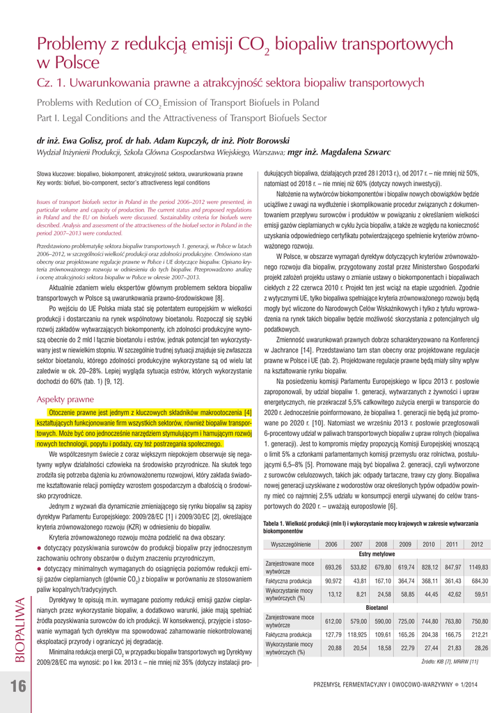 Problemy z redukcją emisji CO2 biopaliw transportowych w Polsce Cz. 1. Uwarunkowania prawne a atrakcyjność sektora biopaliw transportowych Problems with Redution of CO2 Emission of Transport Biofuels in Poland Part I. Legal Conditions and the Attractiveness of Transport Biofuels Sector dr inż. Ewa Golisz, prof. dr hab. Adam Kupczyk, dr inż. Piotr Borowski Wydział Inżynierii Produkcji, Szkoła Główna Gospodarstwa Wiejskiego, Warszawa; mgr inż. Magdalena Szwarc Słowa kluczowe: biopaliwo, biokomponent, atrakcyjność sektora, uwarunkowania prawne Key words: biofuel, bio-component, sector’s attractiveness legal conditions Issues of transport biofuels sector in Poland in the period 2006–2012 were presented, in particular volume and capacity of production. The current status and proposed regulations in Poland and the EU on biofuels were discussed. Sustainability criteria for biofuels were described. Analysis and assessment of the attractiveness of the biofuel sector in Poland in the period 2007–2013 were conducted. Przedstawiono problematykę sektora biopaliw transportowych 1. generacji, w Polsce w latach 2006–2012, w szczególności wielkość produkcji oraz zdolności produkcyjne. Omówiono stan obecny oraz projektowane regulacje prawne w Polsce i UE dotyczące biopaliw. Opisano kryteria zrównoważonego rozwoju w odniesieniu do tych biopaliw. Przeprowadzono analizę i ocenę atrakcyjności sektora biopaliw w Polsce w okresie 2007–2013. Aktualnie zdaniem wielu ekspertów głównym problemem sektora biopaliw transportowych w Polsce są uwarunkowania prawno-środowiskowe [8]. Po wejściu do UE Polska miała stać się potentatem europejskim w wielkości produkcji i dostarczaniu na rynek wspólnotowy bioetanolu. Rozpoczął się szybki rozwój zakładów wytwarzających biokomponenty, ich zdolności produkcyjne wynoszą obecnie do 2 mld l łącznie bioetanolu i estrów, jednak potencjał ten wykorzystywany jest w niewielkim stopniu. W szczególnie trudnej sytuacji znajduje się zwłaszcza sektor bioetanolu, którego zdolności produkcyjne wykorzystane są od wielu lat zaledwie w ok. 20–28%. Lepiej wygląda sytuacja estrów, których wykorzystanie dochodzi do 60% (tab. 1) [9, 12]. biopaliwa Aspekty prawne 16 Otoczenie prawne jest jednym z kluczowych składników makrootoczenia [4] kształtujących funkcjonowanie firm wszystkich sektorów, również biopaliw transportowych. Może być ono jednocześnie narzędziem stymulującym i hamującym rozwój nowych technologii, popytu i podaży, czy też postrzegania społecznego. We współczesnym świecie z coraz większym niepokojem obserwuje się negatywny wpływ działalności człowieka na środowisko przyrodnicze. Na skutek tego zrodziła się potrzeba dążenia ku zrównoważonemu rozwojowi, który zakłada świadome kształtowanie relacji pomiędzy wzrostem gospodarczym a dbałością o środowisko przyrodnicze. Jednym z wyzwań dla dynamicznie zmieniającego się rynku biopaliw są zapisy dyrektyw Parlamentu Europejskiego: 2009/28/EC [1] i 2009/30/EC [2], określające kryteria zrównoważonego rozwoju (KZR) w odniesieniu do biopaliw. Kryteria zrównoważonego rozwoju można podzielić na dwa obszary: zz dotyczący pozyskiwania surowców do produkcji biopaliw przy jednoczesnym zachowaniu ochrony obszarów o dużym znaczeniu przyrodniczym, zz dotyczący minimalnych wymaganych do osiągnięcia poziomów redukcji emisji gazów cieplarnianych (głównie CO2) z biopaliw w porównaniu ze stosowaniem paliw kopalnych/tradycyjnych. Dyrektywy te opisują m.in. wymagane poziomy redukcji emisji gazów cieplarnianych przez wykorzystanie biopaliw, a dodatkowo warunki, jakie mają spełniać źródła pozyskiwania surowców do ich produkcji. W konsekwencji, przyjęcie i stosowanie wymagań tych dyrektyw ma spowodować zahamowanie niekontrolowanej eksploatacji przyrody i ograniczyć jej degradację. Minimalna redukcja energii CO2 w przypadku biopaliw transportowych wg Dyrektywy 2009/28/EC ma wynosić: po I kw. 2013 r. – nie mniej niż 35% (dotyczy instalacji pro- dukujących biopaliwa, działających przed 28 I 2013 r.), od 2017 r. – nie mniej niż 50%, natomiast od 2018 r. – nie mniej niż 60% (dotyczy nowych inwestycji). Nałożenie na wytwórców biokomponentów i biopaliw nowych obowiązków będzie uciążliwe z uwagi na wydłużenie i skomplikowanie procedur związanych z dokumentowaniem przepływu surowców i produktów w powiązaniu z określaniem wielkości emisji gazów cieplarnianych w cyklu życia biopaliw, a także ze względu na konieczność uzyskania odpowiedniego certyfikatu potwierdzającego spełnienie kryteriów zrównoważonego rozwoju. W Polsce, w obszarze wymagań dyrektyw dotyczących kryteriów zrównoważonego rozwoju dla biopaliw, przygotowany został przez Ministerstwo Gospodarki projekt założeń projektu ustawy o zmianie ustawy o biokomponentach i biopaliwach ciekłych z 22 czerwca 2010 r. Projekt ten jest wciąż na etapie uzgodnień. Zgodnie z wytycznymi UE, tylko biopaliwa spełniające kryteria zrównoważonego rozwoju będą mogły być wliczone do Narodowych Celów Wskaźnikowych i tylko z tytułu wprowadzenia na rynek takich biopaliw będzie możliwość skorzystania z potencjalnych ulg podatkowych. Zmienność uwarunkowań prawnych dobrze scharakteryzowano na Konferencji w Jachrance [14]. Przedstawiano tam stan obecny oraz projektowane regulacje prawne w Polsce i UE (tab. 2). Projektowane regulacje prawne będą miały silny wpływ na kształtowanie rynku biopaliw. Na posiedzeniu komisji Parlamentu Europejskiego w lipcu 2013 r. posłowie zaproponowali, by udział biopaliw 1. generacji, wytwarzanych z żywności i upraw energetycznych, nie przekraczał 5,5% całkowitego zużycia energii w transporcie do 2020 r. Jednocześnie poinformowano, że biopaliwa 1. generacji nie będą już promowane po 2020 r. [10]. Natomiast we wrześniu 2013 r. posłowie przegłosowali 6-procentowy udział w paliwach t