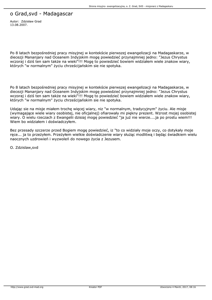 Strona misyjno- ewangelizacyjna, o. Z. Grad, SVD - misjonarz z Madagaskaru o Grad,svd - Madagascar Autor: Zdzisław Grad 13.08.2007. Po 8 latach bezpośredniej pracy misyjnej w kontekście pierwszej ewangelizacji na Madagaskarze, w diecezji Mananjary nad Oceanem Indyjskim mogę powiedzieć przynajmniej jedno: "Jezus Chrystus wczoraj i dziś ten sam także na wieki"!!! Mogę to powiedzieć bowiem widziałem wiele znakow wiary, których "w normalnym" życiu chrześcijańskim sie nie spotyka. Po 8 latach bezpośredniej pracy misyjnej w kontekście pierwszej ewangelizacji na Madagaskarze, w diecezji Mananjary nad Oceanem Indyjskim mogę powiedzieć przynajmniej jedno: "Jezus Chrystus wczoraj i dziś ten sam także na wieki"!!! Mogę to powiedzieć bowiem widziałem wiele znakow wiary, których "w normalnym" życiu chrześcijańskim sie nie spotyka. Udając sie na misje miałem trochę więcej wiary, niz "w normalnym, tradycyjnym" życiu. Ale misje (wymagające wiele wiary osobistej, nie oficjalnej) ofiarowały mi piękny prezent. Wzrost mojej osobistej wiary. O wielu rzeczach z Ewangelii dzisiaj mogę powiedzieć "ja już nie wierze....ja po prostu wiem!!! Wiem bo widziałem i doświadczyłem. Bez przesady szczerze przed Bogiem mogę powiedzieć, iz "to co widziały moje oczy, co dotykały moje ręce... ja to przeżyłem. Przeżyłem wielkie doświadczenie wiary służąc modlitwą i będąc świadkiem wielu naocznych uzdrowień i wyzwoleń do nowego życia z Jezusem. O. Zdzislaw,svd http://www.grad.svd-mad.org Kreator PDF Utworzono 4 March, 2017, 08:16