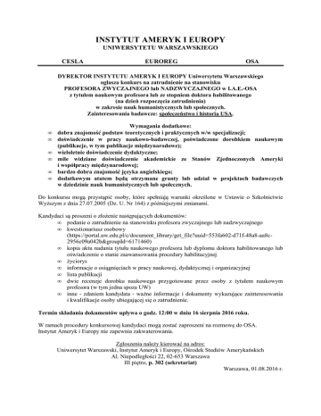 INSTYTUT AMERYK I EUROPY UNIWERSYTETU WARSZAWSKIEGO CESLA EUROREG OSA DYREKTOR INSTYTUTU AMERYK I EUROPY Uniwersytetu Warszawskiego ogłasza konkurs na zatrudnienie na stanowisku PROFESORA ZWYCZAJNEGO lub NADZWYCZAJNEGO w I.A.E.-OSA z tytułem naukowym profesora lub ze stopniem doktora habilitowanego (na dzień rozpoczęcia zatrudnienia) w zakresie nauk humanistycznych lub społecznych. Zainteresowania badawcze: społeczeństwo i historia USA. • • • • • • Wymagania dodatkowe: dobra znajomość podstaw teoretycznych i praktycznych w/w specjalizacji; doświadczenie w pracy naukowo-badawczej, poświadczone dorobkiem naukowym (publikacje, w tym publikacje międzynarodowe); wieloletnie doświadczenie dydaktyczne; mile widziane doświadczenie akademickie ze Stanów Zjednoczonych Ameryki i współpracy międzynarodowej; bardzo dobra znajomość języka angielskiego; dodatkowym atutem będą otrzymane granty lub udział w projektach badawczych w dziedzinie nauk humanistycznych lub społecznych. Do konkursu mogą przystąpić osoby, które spełniają warunki określone w Ustawie o Szkolnictwie Wyższym z dnia 27.07.2005 (Dz. U. Nr 164) z późniejszymi zmianami. Kandydaci są proszeni o złożenie następujących dokumentów: • podanie o zatrudnienie na stanowisku profesora zwyczajnego lub nadzwyczajnego • kwestionariusz osobowy (https://portal.uw.edu.pl/c/document_library/get_file?uuid=553fa602-d71f-48a8-aa8c2956c09a042b&groupId=6171460) • kopia aktu nadania tytułu naukowego profesora lub dyplomu doktora habilitowanego lub oświadczenie o stanie zaawansowania procedury habilitacyjnej • życiorys • informacje o osiągnięciach w pracy naukowej, dydaktycznej i organizacyjnej • lista publikacji • dwie recenzje dorobku naukowego przygotowane przez osoby z tytułem naukowym profesora (w tym jedna spoza UW) • inne - zdaniem kandydata - ważne informacje i dokumenty wykazujące zainteresowania i kwalifikacje osoby ubiegającej się o zatrudnienie. Termin składania dokumentów upływa o godz. 12:00 w dniu 16 sierpnia 2016 roku. W ramach procedury konkursowej kandydaci mogą zostać zaproszeni na rozmowę do OSA. Instytut Ameryk i Europy nie zapewnia zakwaterowania. Zgłoszenia należy kierować na adres: Uniwersytet Warszawski, Instytut Ameryk i Europy, Ośrodek Studiów Amerykańskich Al. Niepodległości 22, 02-653 Warszawa III piętro, p. 302 (sekretariat) Warszawa, 01.08.2016 r.