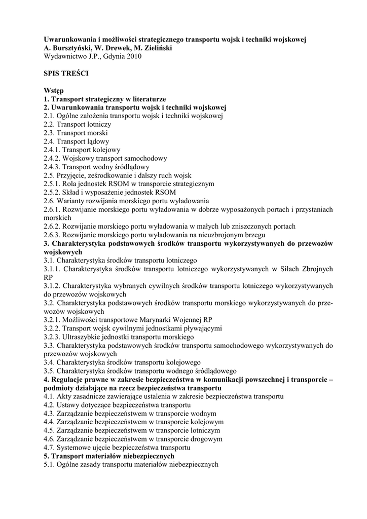 Uwarunkowania i moŜliwości strategicznego transportu wojsk i techniki wojskowej A. Bursztyński, W. Drewek, M. Zieliński Wydawnictwo J.P., Gdynia 2010 SPIS TREŚCI Wstęp 1. Transport strategiczny w literaturze 2. Uwarunkowania transportu wojsk i techniki wojskowej 2.1. Ogólne załoŜenia transportu wojsk i techniki wojskowej 2.2. Transport lotniczy 2.3. Transport morski 2.4. Transport lądowy 2.4.1. Transport kolejowy 2.4.2. Wojskowy transport samochodowy 2.4.3. Transport wodny śródlądowy 2.5. Przyjęcie, ześrodkowanie i dalszy ruch wojsk 2.5.1. Rola jednostek RSOM w transporcie strategicznym 2.5.2. Skład i wyposaŜenie jednostek RSOM 2.6. Warianty rozwijania morskiego portu wyładowania 2.6.1. Rozwijanie morskiego portu wyładowania w dobrze wyposaŜonych portach i przystaniach morskich 2.6.2. Rozwijanie morskiego portu wyładowania w małych lub zniszczonych portach 2.6.3. Rozwijanie morskiego portu wyładowania na nieuzbrojonym brzegu 3. Charakterystyka podstawowych środków transportu wykorzystywanych do przewozów wojskowych 3.1. Charakterystyka środków transportu lotniczego 3.1.1. Charakterystyka środków transportu lotniczego wykorzystywanych w Siłach Zbrojnych RP 3.1.2. Charakterystyka wybranych cywilnych środków transportu lotniczego wykorzystywanych do przewozów wojskowych 3.2. Charakterystyka podstawowych środków transportu morskiego wykorzystywanych do przewozów wojskowych 3.2.1. MoŜliwości transportowe Marynarki Wojennej RP 3.2.2. Transport wojsk cywilnymi jednostkami pływającymi 3.2.3. Ultraszybkie jednostki transportu morskiego 3.3. Charakterystyka podstawowych środków transportu samochodowego wykorzystywanych do przewozów wojskowych 3.4. Charakterystyka środków transportu kolejowego 3.5. Charakterystyka środków transportu wodnego śródlądowego 4. Regulacje prawne w zakresie bezpieczeństwa w komunikacji powszechnej i transporcie – podmioty działające na rzecz bezpieczeństwa transportu 4.1. Akty zasadnicze zawierające ustalenia w zakresie bezpieczeństwa transportu 4.2. Ustawy dotyczące bezpieczeństwa transportu 4.3. Zarządzanie bezpieczeństwem w transporcie wodnym 4.4. Zarządzanie bezpieczeństwem w transporcie kolejowym 4.5. Zarządzanie bezpieczeństwem w transporcie lotniczym 4.6. Zarządzanie bezpieczeństwem w transporcie drogowym 4.7. Systemowe ujęcie bezpieczeństwa transportu 5. Transport materiałów niebezpiecznych 5.1. Ogólne zasady transportu materiałów niebezpiecznych 5.2. Przewóz materiałów niebezpiecznych transportem drogowym 5.2.1. Struktura przepisów ADR 5.2.2. Klasyfikacja i oznaczenie materiałów niebezpiecznych wg. ADR 5.2.3. Zakres obowiązków podczas przewozu materiałów niebezpiecznych transportem drogowym 5.2.4. Doradca do spraw bezpieczeństwa w przewozie towarów niebezpiecznych transportem drogowym 5.2.5. Szkolenie osób zaangaŜowanych w przewóz materiałów niebezpiecznych transportem drogowym 5.2.6. Oznakowanie i wyposaŜenie pojazdu (jednostki transportowej) 5.2.7. Wymagania dotyczące konstrukcji pojazdów 5.2.8. Transport drogowy materiałów niebezpiecznych w Siłach Zbrojnych RP 5.3. Przewóz materiałów niebezpiecznych transportem kolejowym 5.3.1. Struktura i zakres stosowania przepisów RID 5.3.2. Oznaczenia RID 5.3.3. Wymagania dotyczące taboru kolejowego 5.3.4. Doradca do spraw bezpieczeństwa w przewozie towarów niebezpiecznych transportem kolejowym 5.3.5. Przewozy kolejowo – drogowe 5.3.6. Przewozy kolejowo – morskie 5.3.7. Transport koleją materiałów niebezpiecznych w Siłach Zbrojnych RP 5.4. Przewóz materiałów niebezpiecznych transportem morskim 5.4.1. Struktura przepisów IMDG 5.4.2. Kontrola i dobór środka transportowego do ładunku niebezpiecznego wobec obowiązujących przepisów 5.4.3. Klasyfikacja ładunków niebezpiecznych w transporcie morskim 5.4.4. Doradca do spraw bezpieczeństwa w przewozie towarów niebezpiecznych transportem morskim 5.4.5. Transport morski materiałów niebezpiecznych w Siłach Zbrojnych RP 5.5. Przewóz łdunków niebezpiecznych transportem powietrznym 5.5.1. Klasyfikacja ładunków niebezpiecznych w transporcie powietrznym 5.5.2. Opakowania i oznakowania materiałów niebezpiecznych w transporcie powietrznym 5.5.3. Przewóz ładunków niebezpiecznych transportem powietrznym w Siłach Zbrojnych RP 5.6. Transport ładunków niebezpiecznych Ŝeglugą śródlądową 5.6.1. Wymagania dotyczące statków przewoŜących materiały niebezpieczne w Ŝegludze śródlądowej 5.6.2. Załadunek, wyładunek oraz przewóz materiałów niebezpiecznych jednostkami Ŝeglugi śródlądowej 5.6.3. Szkolenie i egzaminowanie ekspertów ADN 6. Kalkulacja czasu i kosztów transportu wojskowego 6.1. Struktura modułu kalkulacji czasu i kosztów transportu 6.2. Procedura przerzutu transportem morskim 6.2.1. Procedura przerzutu wojskowym transportem morskim 6.2.2. Procedura przerzutu statkami cywilnymi 6.3. Procedura przerzutu transportem lotniczym 6.4. Procedura przerzutu transportem samochodowym 6.5. Procedura przerzutu transportem kolejowym Literatura Wykaz tabel Wykaz rysunków Załącznik 1. Klasyfikacja i oznakowanie materiałów niebezpiecznych