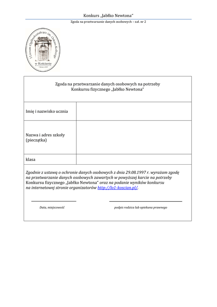 Konkurs „Jabłko Newtona“ Zgoda na przetwarzanie danych osobowych – zał. nr 2 Zgoda na przetwarzanie danych osobowych na potrzeby Konkursu fizycznego „Jabłko Newtona“ Imię i nazwisko ucznia Nazwa i adres szkoły (pieczątka) klasa Zgodnie z ustawą o ochronie danych osobowych z dnia 29.08.1997 r. wyrażam zgodę na przetwarzanie danych osobowych zawartych w powyższej karcie na potrzeby Konkursu fizycznego „Jabłko Newtona“ oraz na podanie wyników konkursu na internetowej stronie organizatorów http://lo1-koscian.pl/. Data, miejscowość podpis rodzica lub opiekuna prawnego