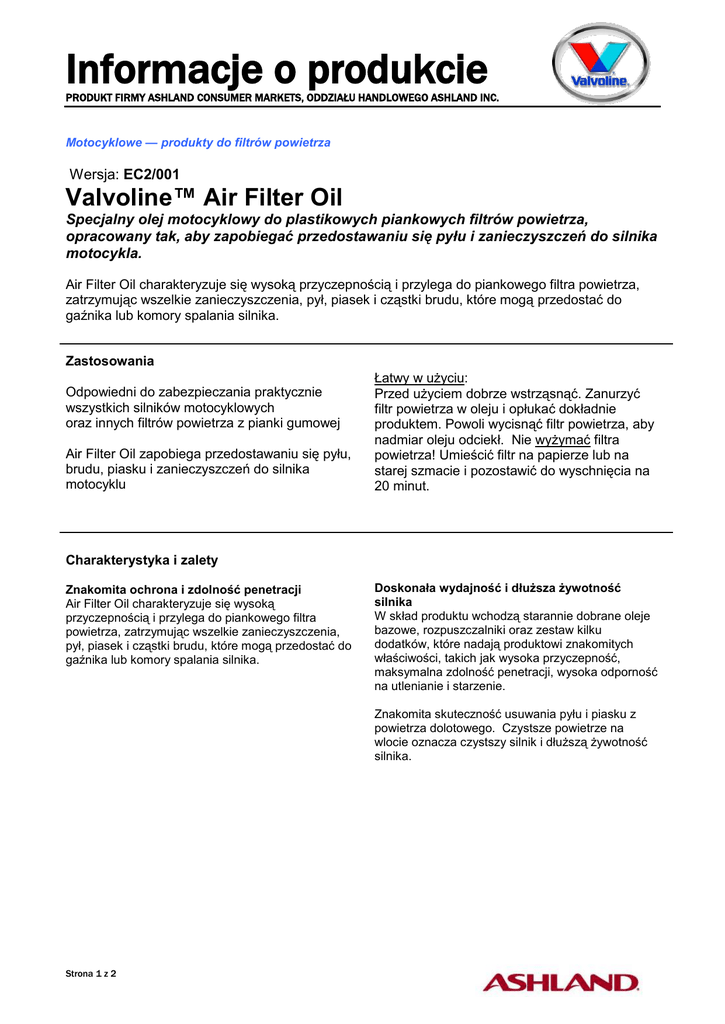 Informacje o produkcie PRODUKT FIRMY ASHLAND CONSUMER MARKETS, ODDZIAŁU HANDLOWEGO ASHLAND INC. Motocyklowe — produkty do filtrów powietrza Wersja: EC2/001 Valvoline™ Air Filter Oil Specjalny olej motocyklowy do plastikowych piankowych filtrów powietrza, opracowany tak, aby zapobiegać przedostawaniu się pyłu i zanieczyszczeń do silnika motocykla. Air Filter Oil charakteryzuje się wysoką przyczepnością i przylega do piankowego filtra powietrza, zatrzymując wszelkie zanieczyszczenia, pył, piasek i cząstki brudu, które mogą przedostać do gaźnika lub komory spalania silnika. Zastosowania Odpowiedni do zabezpieczania praktycznie wszystkich silników motocyklowych oraz innych filtrów powietrza z pianki gumowej Air Filter Oil zapobiega przedostawaniu się pyłu, brudu, piasku i zanieczyszczeń do silnika motocyklu Łatwy w użyciu: Przed użyciem dobrze wstrząsnąć. Zanurzyć filtr powietrza w oleju i opłukać dokładnie produktem. Powoli wycisnąć filtr powietrza, aby nadmiar oleju odciekł. Nie wyżymać filtra powietrza! Umieścić filtr na papierze lub na starej szmacie i pozostawić do wyschnięcia na 20 minut. Charakterystyka i zalety Znakomita ochrona i zdolność penetracji Air Filter Oil charakteryzuje się wysoką przyczepnością i przylega do piankowego filtra powietrza, zatrzymując wszelkie zanieczyszczenia, pył, piasek i cząstki brudu, które mogą przedostać do gaźnika lub komory spalania silnika. Doskonała wydajność i dłuższa żywotność silnika W skład produktu wchodzą starannie dobrane oleje bazowe, rozpuszczalniki oraz zestaw kilku dodatków, które nadają produktowi znakomitych właściwości, takich jak wysoka przyczepność, maksymalna zdolność penetracji, wysoka odporność na utlenianie i starzenie. Znakomita skuteczność usuwania pyłu i piasku z powietrza dolotowego. Czystsze powietrze na wlocie oznacza czystszy silnik i dłuższą żywotność silnika. Strona 1 z 2 Informacje o produkcie PRODUKT FIRMY ASHLAND CONSUMER MARKETS, ODDZIAŁU HANDLOWEGO ASHLAND INC. Bezpieczeństwo Informacje na temat wpływu produktu na zdrowie i bezpieczeństwo, należy zapoznać się z Kartą charakterystyki. Kartę charakterystyki (MSDS) można uzyskać na życzenie od lokalnego dystrybutora lub pobrać ją z witryny pod adresem http://msds.ashland.com Ochrona środowiska Zużyty olej należy oddawać do odpowiedniego punktu zbiórki. Nie spuszczać do ścieków, gleby lub cieków wodnych. Charakterystyczne właściwości Charakterystyka typowych właściwości jest oparta na aktualnie produkowanym preparacie. W przyszłości produkcja będzie zgodna ze specyfikacjami Valvoline, natomiast mogą wystąpić zmiany tej charakterystyki. Air Filter Oil Kolor Temperatura wrzenia, ºC Ciężar właściwy w temperaturze 15.6°C. ASTM D-4052 Temperatura zapłonu, COC, ºC. ASTM D-92 People Who Know Use Valvoline™ Działając w ponad 100 krajach na całym świecie, firma Valvoline to wiodący sprzedawca, dystrybutor i producent wysokiej jakości produktów i usług samochodowych i przemysłowych. Do produktów tej firmy należą smary samochodowe, m. in. MaxLife™ — pierwszy olej silnikowy o formule przeznaczonej specjalnie do pojazdów o wyższym przebiegu; płyny przekładniowe, oleje przekładniowe, smary hydrauliczne, chemikalia motoryzacyjne, produkty specjalne; smary oraz produkty do układu chłodzenia. Aby uzyskać więcej informacji na temat produktów i usług firmy Valvoline, odwiedź www.valvolineeurope.com Autor: AdG Zastępuje - 313/02 Niebieski 65-70 0.785 Ciecz palna Niniejsze informacje dotyczą wyłącznie produktów wytwarzanych w następujących lokalizacjach: Europa *Znak towarowy będący własnością osoby trzeciej ™ Znak towarowy Ashland lub przedsiębiorstw zależnych, zarejestrowany w różnych krajach © 2012, Ashland Uważa się, że wszelkie informacje oraz dane przedstawione w niniejszym dokumencie są dokładne i wiarygodne, ale nie mogą być traktowane jako gwarancja, gwarancja wyraźna lub dorozumiana, gwarancja przydatności handlowej lub przydatności do określonego celu, lub reprezentacja, wyraźna lub dorozumiana, za którą Ashland Inc. i jej spółki zależne ponoszą odpowiedzialność prawną. *Znak towarowy będący własnością osoby trzeciej ™ Znak towarowy Ashland lub przedsiębiorstw zależnych, zarejestrowany w różnych krajach © 2010, Ashland Strona 2 z 2