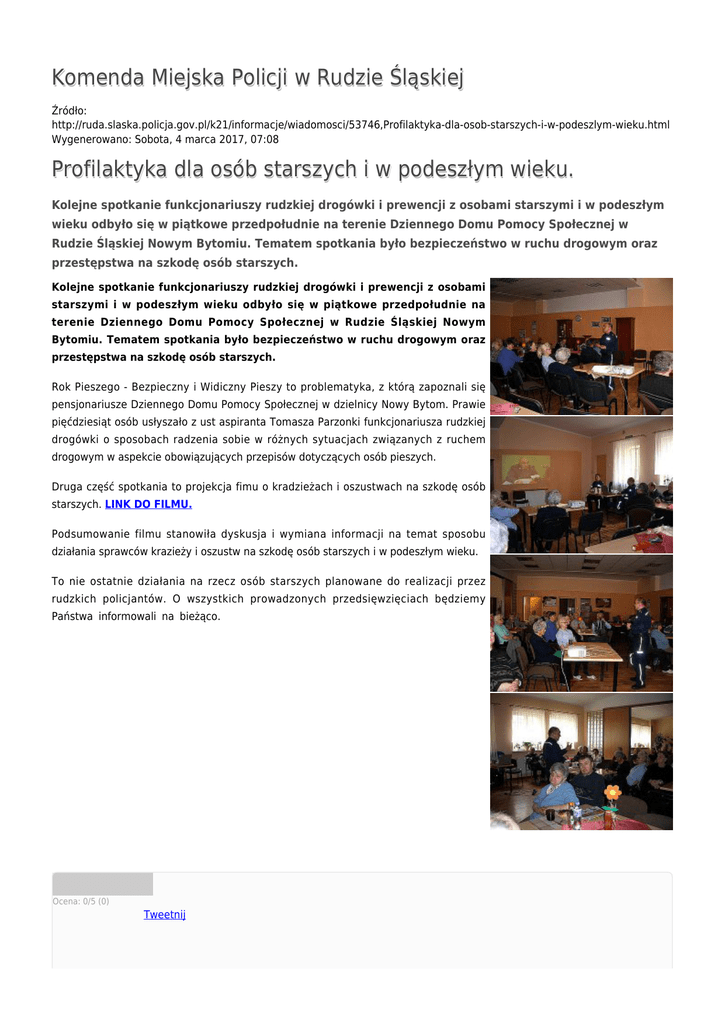 Komenda Miejska Policji w Rudzie Śląskiej Źródło: http://ruda.slaska.policja.gov.pl/k21/informacje/wiadomosci/53746,Profilaktyka-dla-osob-starszych-i-w-podeszlym-wieku.html Wygenerowano: Sobota, 4 marca 2017, 07:08 Profilaktyka dla osób starszych i w podeszłym wieku. Kolejne spotkanie funkcjonariuszy rudzkiej drogówki i prewencji z osobami starszymi i w podeszłym wieku odbyło się w piątkowe przedpołudnie na terenie Dziennego Domu Pomocy Społecznej w Rudzie Śląskiej Nowym Bytomiu. Tematem spotkania było bezpieczeństwo w ruchu drogowym oraz przestępstwa na szkodę osób starszych. Kolejne spotkanie funkcjonariuszy rudzkiej drogówki i prewencji z osobami starszymi i w podeszłym wieku odbyło się w piątkowe przedpołudnie na terenie Dziennego Domu Pomocy Społecznej w Rudzie Śląskiej Nowym Bytomiu. Tematem spotkania było bezpieczeństwo w ruchu drogowym oraz przestępstwa na szkodę osób starszych. Rok Pieszego - Bezpieczny i Widiczny Pieszy to problematyka, z którą zapoznali się pensjonariusze Dziennego Domu Pomocy Społecznej w dzielnicy Nowy Bytom. Prawie pięćdziesiąt osób usłyszało z ust aspiranta Tomasza Parzonki funkcjonariusza rudzkiej drogówki o sposobach radzenia sobie w różnych sytuacjach związanych z ruchem drogowym w aspekcie obowiązujących przepisów dotyczących osób pieszych. Druga część spotkania to projekcja fimu o kradzieżach i oszustwach na szkodę osób starszych. LINK DO FILMU. Podsumowanie filmu stanowiła dyskusja i wymiana informacji na temat sposobu działania sprawców krazieży i oszustw na szkodę osób starszych i w podeszłym wieku. To nie ostatnie działania na rzecz osób starszych planowane do realizacji przez rudzkich policjantów. O wszystkich prowadzonych przedsięwzięciach będziemy Państwa informowali na bieżąco. Ocena: 0/5 (0) Tweetnij