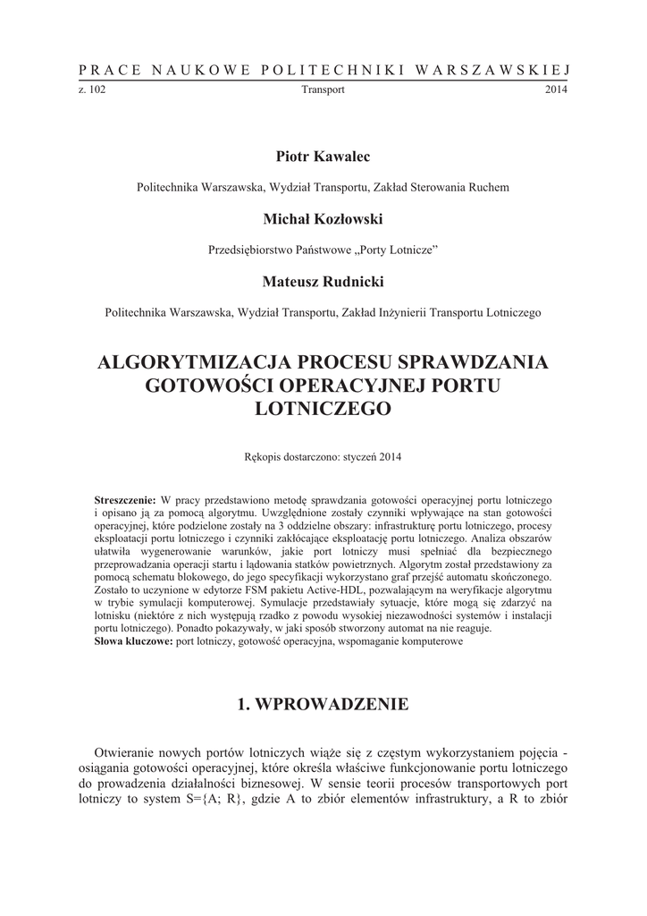 KozIowski M., Malarski M.: „Wyznaczanie zdatnoTci operacyjnej portu lotniczego”, Prace naukowe