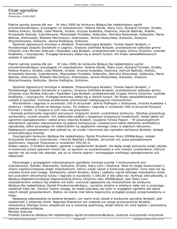 Gmina Chojnów - Strona główna Finał ogrodów 28.09.2006. Zmieniony 19.06.2007. Piękne ogrody szansą dla wsi W roku 2006 do konkursu “Na najładniejszy ogród przydomowy” przystąpiło 14 mieszkańców: Helena Górak, Stary Łom, Ryszard Furman, Groble, Helena Piskorz, Groble, Lidia Mielnik, Groble, Urszula Kudelska, Osetnica, Henryk Baliński, Rokitki, Krzysztofa Giersok, Czernikowice, Mieczysław Przykład, Gołaczów, Henryka Równanek, Gołaczów, Maria Balicka, Dobroszów, Elżbieta Marciniszyn, Dobroszów, Janina Moszyńska, Goliszów, Grażyna Wojciechowska, Goliszów, Janina Podhajna, Goliszów. Spośród zgłoszonych Komisja w składzie: Przewodnicząca – Teresa Hapon – z Powiatowego Zespołu Doradców w Legnicy, Grażyna Zielińska – przedstawiciel sołtysów gminy Chojnów oraz Monika Sobczak i Radosław Lipa – przedstawiciele Urzędu Gminy Chojnów, wybrała finalistów, i zwycięzców. Przegląd terenowy odbył się w dwóch turach. Do finału zakwalifikowanych zostało 6 ogrodów. Piękne ogrody szansą dla wsi W roku 2006 do konkursu “Na najładniejszy ogród przydomowy” przystąpiło 14 mieszkańców: Helena Górak, Stary Łom, Ryszard Furman, Groble, Helena Piskorz, Groble, Lidia Mielnik, Groble, Urszula Kudelska, Osetnica, Henryk Baliński, Rokitki, Krzysztofa Giersok, Czernikowice, Mieczysław Przykład, Gołaczów, Henryka Równanek, Gołaczów, Maria Balicka, Dobroszów, Elżbieta Marciniszyn, Dobroszów, Janina Moszyńska, Goliszów, Grażyna Wojciechowska, Goliszów, Janina Podhajna, Goliszów. Spośród zgłoszonych Komisja w składzie: Przewodnicząca – Teresa Hapon – z Powiatowego Zespołu Doradców w Legnicy, Grażyna Zielińska – przedstawiciel sołtysów gminy Chojnów oraz Monika Sobczak i Radosław Lipa – przedstawiciele Urzędu Gminy Chojnów, wybrała finalistów, i zwycięzców. Przegląd terenowy odbył się w dwóch turach. Do finału zakwalifikowanych zostało 6 ogrodów. Komisja postanowiła uhonorować następujących mieszkańców: Wyróżnienia i nagrody w wysokości 100 zł otrzymali: Janina Podhajna z Goliszowa, Urszula Kudelska z Osetnicy i Helena Górak ze Starego Łomu. III miejsce i nagrodę w wysokości 300 zł otrzymał Ryszard Furman z Grobli. II miejsca w tym roku nie przyznano. - Komisja postanowiła nagrodzić pierwszym miejscem dwóch uczestników konkursu. Obydwa prezentują wyrównany, wysoki poziom. Ich właściciele zadbali o bogactwo kompozycji kwiatowych, widać także ich ogromne zaangażowanie i wkład pracy własnej – wyjaśnia Teresa Hapon. - W poszczególnych elementach ogrodów zaaranżowane są piękne kompozycje, umieszczono także elementy architektury ogrodowej, które pozwalają ich właścicielom na spędzenie wolnego czasu w pięknym otoczeniu. Najlepszym uzasadnieniem jest jednak to, że uroda i harmonia obu ogrodów zachwyca – dodaje przewodnicząca Komisji. Zwycięzcami konkursu „Na najładniejszy Ogród Przydomowy Roku 2006” zostali: Krzysztofa Giersok z Czernikowic i Henryk Baliński z Rokitek. otrzymali oni, poza pamiątkowymi dyplomami, nagrody finansowe w wysokości 450,00 zł. Dodać należy, iż finaliści – zgodnie z regulaminem – nie będą mogli ponownie wziąć udziału w konkursie przed upływem trzech lat, co pozwoli na wystartowanie w nim nowym uczestnikom, których ogrody nie są może tak okazałe, ale za to równie piękne i wymagające wielkiego zaangażowania uch właścicieli. Równolegle z przeglądem indywidualnych ogródków komisja oceniła 7 konkursowych wsi: Czernikowice, Rokitki, Dobroszów, Goliszów, Groble, Stary Łom i Osetnica. Wsie te mogły konkurować o miano najestyczniejszej dzięki mieszkańcom, którzy wzięli udział w konkursie ogrodów. Inne wsie nie są niestety brane pod uwagę. Zachęcamy zatem – ładny i zadbany ogród jednego mieszkańca może być powodem otrzymania tytułu i nagrody w wysokości 1.000,00 zł dla całej wsi. Komisja zdecydowała, iż „Najestetyczniejszą miejscowością Gminy Chojnów roku 2006” jest Stary Łom. Uzasadnieniem wyboru tej właśnie wsi było: coroczne zgłaszanie się mieszkańców do konkursu „Na najładniejszy Ogród Przydomowy”, wyraźna zmiana w estetyce całej wsi w przeciągu ostatnich kilku lat. Zwrócić należy uwagę, że widać poprawę nie tylko w wyglądzie ogrodów ale także całych obejść gospodarskich. Wpływ na ocenę miał także tegoroczny przegląd posesji przeprowadzony w maju. Najlepszą odpowiedzią na pytanie – czy warto brać udział w konkursie ogrodów – jest wiadomość z ostatniej chwili. Nagroda finansowa wsi znalazła już swoje przeznaczenie – mieszkańcy Starego Łomu zaopatrzyli się w kosiarkę spalinową, dzięki której ich wieś będzie z pewnością jeszcze estetyczniejsza. Monika Sobczak Finaliści konkursu „Na najładniejszy ogród przydomowy” podczas uroczystości wręczenia http://gmina-chojnow.pl/www Kreator PDF Utworzono 4 March, 2017, 07:16 Gmina Chojnów - Strona główna nagród. Sołtys Starego Łomu Stanisław Gruszecki odebrał nagrodę z rąk Przewodniczącego Rady Gminy Krzysztofa Sowińskiego. http://gmina-chojnow.pl/www Kreator PDF Utworzono 4 March, 2017, 07:16