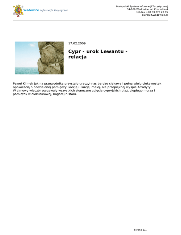 Małopolski System Informacji Turystycznej 34-100 Wadowice, ul. Kościelna 4 tel./fax +48 33 873 23 65 [email protected] 17.02.2009 Cypr - urok Lewantu relacja Paweł Klimek jak na przewodnika przystało uraczył nas bardzo ciekawą i pełną wielu ciekawostek opowieścią o podzielonej pomiędzy Grecję i Turcję małej, ale przepięknej wyspie Afrodyty. W zimowy wieczór ogrzewały wszystkich słoneczne zdjęcia cypryjskich plaż, ciepłego morza i pamiątek wielokuturowej, bogatej historii. Strona 1/1 Powered by TCPDF (www.tcpdf.org)