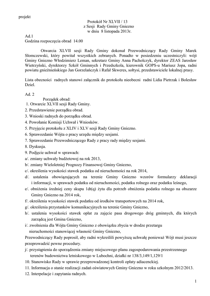 1 projekt Protokół Nr XLVII / 13 z Sesji Rady Gminy Gniezno w dniu