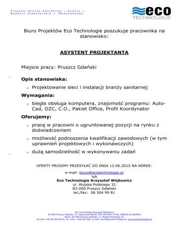 Projekty Branży Sanitarnej • Audyty • Nadzory Inwestorskie • Wykonawstwo Biuro Projektów Eco Technologie poszukuje pracownika na stanowisko: ASYSTENT PROJEKTANTA Miejsce pracy: Pruszcz Gdański Opis stanowiska: • Projektowanie sieci i instalacji branży sanitarnej Wymagania: • biegła obsługa komputera, znajomość programu: AutoCad, OZC, C.O., Pakiet Office, Profil Koordynator Oferujemy: • pracę w pracowni o ugruntowanej pozycji na rynku z doświadczeniem • możliwość podnoszenia kwalifikacji zawodowych (w tym uprawnień projektowych i wykonawczych) • dużą samodzielność w wykonywaniu zadań OFERTY PROSIMY PRZESYŁAĆ DO DNIA 12.06.2015 NA ADRES: e-mail: [email protected] lub Eco Technologie Krzysztof Wójtowicz ul. Wojska Polskiego 32 83-000 Pruszcz Gdański tel./fax: 58 304 99 81 Eco Technologie Krzysztof Wójtowicz 83-000 Pruszcz Gdański, ul. Cyprysowa 5B/20, NIP 253-003-74-66, REGON 221029509 Biuro: 83-000 Pruszcz Gdański, ul. Wojska Polskiego 32 tel./fax:+48 58 304 99 81, tel. kom.: 505 051 002, e-mail: [email protected], www.ecotechnologie.pl