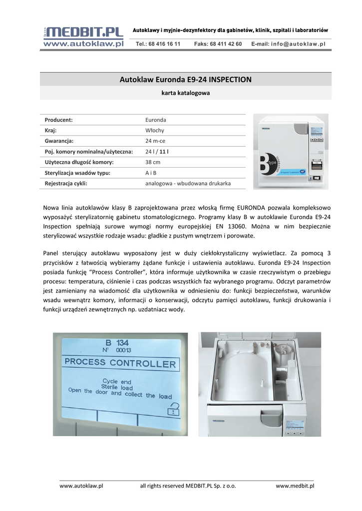 Autoklawy i myjnie-dezynfektory dla gabinetów, klinik, szpitali i laboratoriów Tel.: 68 416 16 11 Faks: 68 411 42 60 E-mail: i n f o @ a u t o k l aw . p l Autoklaw Euronda E9-24 INSPECTION karta katalogowa Producent: Euronda Kraj: Włochy Gwarancja: 24 m-ce Poj. komory nominalna/użyteczna: 24 l / 11 l Użyteczna długość komory: 38 cm Sterylizacja wsadów typu: AiB Rejestracja cykli: analogowa - wbudowana drukarka Nowa linia autoklawów klasy B zaprojektowana przez włoską firmę EURONDA pozwala kompleksowo wyposażyć sterylizatornię gabinetu stomatologicznego. Programy klasy B w autoklawie Euronda E9-24 Inspection spełniają surowe wymogi normy europejskiej EN 13060. Można w nim bezpiecznie sterylizować wszystkie rodzaje wsadu: gładkie z pustym wnętrzem i porowate. Panel sterujący autoklawu wyposażony jest w duży ciekłokrystaliczny wyświetlacz. Za pomocą 3 przycisków z łatwością wybieramy żądane funkcje i ustawienia autoklawu. Euronda E9-24 Inspection posiada funkcję “Process Controller”, która informuje użytkownika w czasie rzeczywistym o przebiegu procesu: temperatura, ciśnienie i czas podczas wszystkich faz wybranego programu. Odczyt parametrów jest zamieniany na wiadomość dla użytkownika w odniesieniu do: funkcji bezpieczeństwa, warunków wsadu wewnątrz komory, informacji o konserwacji, odczytu pamięci autoklawu, funkcji drukowania i funkcji urządzeń zewnętrznych np. uzdatniacz wody. www.autoklaw.pl all rights reserved MEDBIT.PL Sp. z o.o. www.medbit.pl Autoklawy i myjnie-dezynfektory dla gabinetów, klinik, szpitali i laboratoriów Tel.: 68 416 16 11 Faks: 68 411 42 60 E-mail: i n f o @ a u t o k l aw . p l Pamięć autoklawu pozwala na zapis ostatnich 40 cykli, których rezultaty można odczytać (wydrukować) według kolejności lub wybierając np. te, które zakończyły się powodzeniem lub te, które zostały przerwane. Wyniki można również uzyskać z drukarki zewnętrznej lub innego podłączonego nośnika pamięci zewnętrznej, która zapisuje dane z 3000 cykli. Panel sterujący w standardzie wyposażony jest w zintegrowaną drukarkę. Charakterystyka techniczna: • • • • • • • • • • • • w pełni mikroprocesorowe sterowanie zapewniające stałą kontrolę parametrów sterylizacji i precyzyjne zarządzanie wszystkimi funkcjami autoklawu, próżnia frakcyjna zapewniająca dobrą penetrację wnętrza końcówek i turbin, system suszenia próżniowego zapewniający doskonały efekt suszenia z użyciem filtru bakteriologicznego, zewnętrzna wytwornica pary – dzięki temu w bardzo krótkim czasie wytwarzana jest para o wysokim nasyceniu , przez co cykl staje się krótszy, w celu wydłużenia żywotności pompy próżniowej zainstalowano specjalny separator, aby wyeliminować dostanie się wody do pompy, filtr zanieczyszczeń wewnątrz wytwornicy i kotła, system Process Controller - informowanie użytkownika w czasie rzeczywistym o przebiegu procesu: temperatura, ciśnienie i czasu podczas wszystkich faz wybranego programu zgodnie z wymaganiami nowej normy EN 13060 - system kontroli poprawności procesu, elektro-magnetyczny zamek drzwi, zabezpieczający przed przypadkowym otworzeniem drzwi komory, Pokrywę zbiorników na wodę można łatwo zdemontować i wyczyścić zbiornik wody czystej i zużytej, pamięć ostatnich 40 cykli lub zewnętrzny E-memory system zapisuje 3000 cykli, cykle testowe: Vacum Test, Helix Test, B&D Test, wyposażony w cztery tacki o wym. 380 mm x 180 mm (24l) Wyposażenie standardowe: • Stelaż na tace • Perforowane aluminiowe tace – 4 szt. • Uchwyt do tac • Drukarka wbudowana www.autoklaw.pl all rights reserved MEDBIT.PL Sp. z o.o. www.medbit.pl Autoklawy i myjnie-dezynfektory dla gabinetów, klinik, szpitali i laboratoriów Tel.: 68 416 16 11 Faks: 68 411 42 60 E-mail: i n f o @ a u t o k l aw . p l Dane techniczne: Producent: Euronda Kraj: Włochy Normy: PN:EN 13060:2005 Zgłoszenie do UDT: tak Gwarancja: 24 miesięcy Język obsługi: polski Rejestracja cykli: drukarka w standardzie Cykl dla opak. 134 Co + suszenie: 67 min Cykl dla opak. 121Co + suszenie: 77 min Cykl szybki dla nieopak. bez suszenia: 28 min Sterylizacja wsadów typu: AiB Wymiary komory: 25x44 cm Wymiary tacki: 18x38 cm Nominalna pojemność komory: 24 l Użyteczna pojemność komory: 11 l Pojemność zbiornika na wodę: 4l Wymiary urządzenia (d/s/w): 61 cm/45 cm/47 cm Waga: 44 kg Zasilanie: 230 V Pobór mocy: 2300 W Głośność pracy: < 50 db Zapraszamy na naszą stronę internetową. Znajdziecie tam Państwo informacje o innych produktach oraz wiele materiałów video i porównań. www.autoklaw.pl www.autoklaw.pl all rights reserved MEDBIT.PL Sp. z o.o. www.medbit.pl