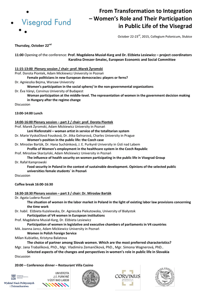 From Transformation to Integration – Women’s Role and Their Participation in Public Life of the Visegrad rd October 22-23 , 2015, Collegium Polonicum, Słubice Thursday, October 22nd 11:00 Opening of the conference: Prof. Magdalena Musiał-Karg and Dr. Elżbieta Lesiewicz – project coordinators Karolina Dreszer-Smalec, European Economic and Social Committee 11:15-13:00 Plenary session / chair: prof. Marek Żyromski Prof. Dorota Piontek, Adam Mickiewicz University in Poznań Female politicians in new European democracies: players or ferns? Dr. Agnieszka Bejma, Warsaw University Women’s participation in the social sphere/ in the non-governmental organizations Dr. Éva Ványi, Corvinus University of Budapest Woman participation at the middle-level. The representation of women in the government decision making in Hungary after the regime change Discussion 13:00-14:00 Lunch 14:00-16:00 Plenary session – part 2 / chair: prof. Dorota Piontek Prof. Marek Żyromski, Adam Mickiewicz University in Poznań Leni Riefenstahl – woman artist in service of the totalitarian system Dr. Marie Vyskočilová Fousková, Dr. Jitka Gelnarová, Charles University in Prague Women’s position in the public life: the Czech case Dr. Miroslav Barták, Dr. Hana Suchánková, J. E. Purkyně University in Ústí nad Labem Profile of Women’s employment in the healthcare system in the Czech Republic Prof. Mirosław Skarżyński, Adam Mickiewicz University in Poznań The influence of health security on women participating in the public life in Visegrad Group Dr. Rafał Kamprowski Food security in Poland in the context of sustainable development. Opinions of the selected public universities female students` in Poznań Discussion Coffee break 16:00-16:30 16:30-18:30 Plenary session – part 3 / chair: Dr. Miroslav Barták Dr. Agata Ludera-Ruszel The situation of women in the labor market in Poland in the light of existing labor law provisions concerning the time work Dr. habil. Elżbieta Kużelewska, Dr. Agnieszka Piekutowska, University of Białystok Participation of V4 women in European institutions Prof. Magdalena Musiał-Karg, Dr. Elżbieta Lesiewicz Participation of women in legislative and executive chambers of parliaments in V4 countries MA. Joanna Jancz, Adam Mickiewicz University in Poznań Women in Polish Foreign Service Milan Kubiatko, Kristyna Balatova The choice of partner among Slovak women. Which are the most preferred characteristics? Mgr. Jana Trabalíková, PhD., Mgr. Vladimíra Zemančíková, PhD., Mgr. Simona Wagnerová, PhD.. Selected aspects of the changes and perspectives in women’s role in public life in Slovakia Discussion 20:00 – Conference dinner – Restaurant Villa Casino 16:30-18:30 Session / chair: Dr. Elżbieta Lesiewicz Dr. Natalia Klejdysz, Adam Mickiewicz University in Poznań The phenomenon of the Congress of Women - determinants and consequences Dr. Marcin Rachwał, Adam Mickiewicz University in Poznań The participation of women in the process of recruitment of political elites in Poland. Experience years 2010-2015 Dr Maciej Magiera, Adam Mickiewicz University in Poznań Safety culture in the face of women's participation - danger parities Dr. Alina Balczyńska-Kosman, Adam Mickiewicz University in Poznań The activity of women in the media – experiences of the Visegrad Group Prof. Anita Adamczyk, Adam Mickiewicz University in Poznań Romni in V4 countries Dr. Natasza Lubik-Reczek, Adam Mickiewicz University in Poznań Mentoring for women as a tool of professional activity Friday, October 23rd 10:00-12:00 Plenary session – part 5 / chair: prof. Magdalena Musiał-Karg Dr. Beata Pająk-Patkowska, Adam Mickiewicz University in Poznań Gender and political activity – expalation of the relationship Dr. Krzysztof Koźbiał, Państwowa Wyższa Szkoła Zawodowa im. rtm. W. Pileckiego w Oświęcimiu Participation of women in national political bodies of the the Visegrad Group counties. Dr. Marcin Łukaszewski, Adam Mickiewicz University in Poznań Women's place in the leadership of political parties of the Visegrad Group Dr. Miroslav Barták, J. E. Purkyně University in Ústí nad Labem State of the art in the field of women's participation in public life in the Czech Republic Prof. Tadeusz Wallas, Dean of the Faculty of Political Science and Journalism AMU Determinants of the evolution of women's voting rights in European countries Concluding remarks 12:30 Lunch Registered participants: Karolina Dreszer-Smalec, Foundation for the Collegium Polonicum, Polish Federation of NGOs, ESEC Dr. Mikołaj Tomaszyk, Adam Mickiewicz University in Poznań Dr. Agnieszka Bielawska, Adam Mickiewicz University in Poznań Dr. Mariusz Ruszel, University of Rzeszow MA. Anna Wiącek, Collegium Polonicum