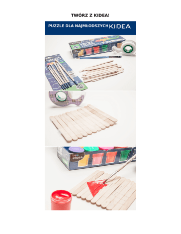 TWÓRZ Z KIDEA! PUZZLE DLA NAJMŁODSZYCH Potrzebne: -farby KIDEA -pędzle KIDEA -ołówek KIDEA -taśma klejąca -patyczki drewniane Macie młodsze rodzeństwo albo malutkiego sąsiada czy sąsiadkę, a może szykują się urodziny młodszej kuzynki lub kuzyna? Mamy dla was idealny pomysł na prezent i co najważniejsze możecie go zrobić SAMI! Do tego projektu potrzebne Wam będą drewniane patyczki, które na początku pracy należy ułożyć w rządku lub kwadracie i skleić taśmą klejącą z jednej strony tak, aby nie mogły się przesuwać. Jak przewrócicie patyczki na drugą stronę, będziecie mogli swobodnie malować, bez obawy, że Wam się rozsuną. Pomyślcie o osobie, dla której robicie puzzle i o tym jaki obrazek mógłby jej się spodobać. Kaczuszka, drzewko a może samochód? Po skończeniu obrazka trzeba poczekać, aż farba wyschnie, odkleić taśmę od spodu i pomieszać patyczki. Wystarczy jeszcze poprosić mamę o ładne pudełko do zapakowania prezentu i gotowe!