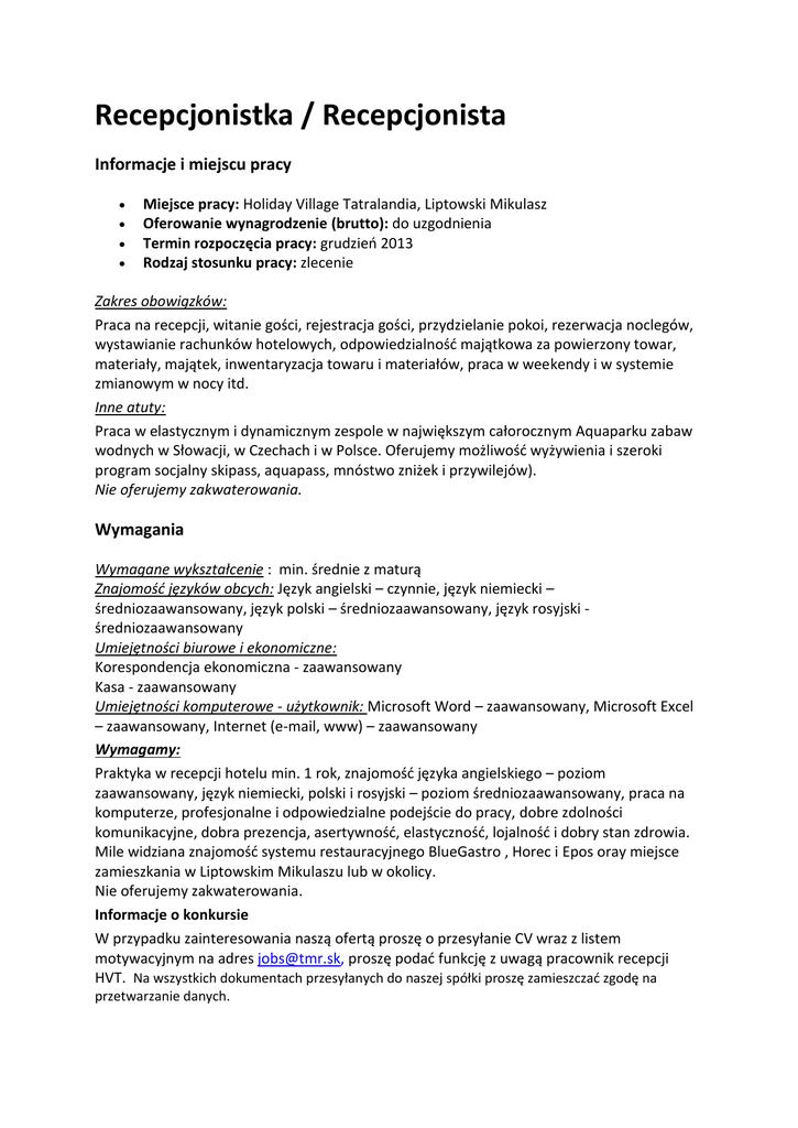Recepcjonistka / Recepcjonista Informacje i miejscu pracy Miejsce pracy: Holiday Village Tatralandia, Liptowski Mikulasz Oferowanie wynagrodzenie (brutto): do uzgodnienia Termin rozpoczęcia pracy: grudzień 2013 Rodzaj stosunku pracy: zlecenie Zakres obowiązków: Praca na recepcji, witanie gości, rejestracja gości, przydzielanie pokoi, rezerwacja noclegów, wystawianie rachunków hotelowych, odpowiedzialność majątkowa za powierzony towar, materiały, majątek, inwentaryzacja towaru i materiałów, praca w weekendy i w systemie zmianowym w nocy itd. Inne atuty: Praca w elastycznym i dynamicznym zespole w największym całorocznym Aquaparku zabaw wodnych w Słowacji, w Czechach i w Polsce. Oferujemy możliwość wyżywienia i szeroki program socjalny skipass, aquapass, mnóstwo zniżek i przywilejów). Nie oferujemy zakwaterowania. Wymagania Wymagane wykształcenie : min. średnie z maturą Znajomość języków obcych: Język angielski – czynnie, język niemiecki – średniozaawansowany, język polski – średniozaawansowany, język rosyjski średniozaawansowany Umiejętności biurowe i ekonomiczne: Korespondencja ekonomiczna - zaawansowany Kasa - zaawansowany Umiejętności komputerowe - użytkownik: Microsoft Word – zaawansowany, Microsoft Excel – zaawansowany, Internet (e-mail, www) – zaawansowany Wymagamy: Praktyka w recepcji hotelu min. 1 rok, znajomość języka angielskiego – poziom zaawansowany, język niemiecki, polski i rosyjski – poziom średniozaawansowany, praca na komputerze, profesjonalne i odpowiedzialne podejście do pracy, dobre zdolności komunikacyjne, dobra prezencja, asertywność, elastyczność, lojalność i dobry stan zdrowia. Mile widziana znajomość systemu restauracyjnego BlueGastro , Horec i Epos oray miejsce zamieszkania w Liptowskim Mikulaszu lub w okolicy. Nie oferujemy zakwaterowania. Informacje o konkursie W przypadku zainteresowania naszą ofertą proszę o przesyłanie CV wraz z listem motywacyjnym na adres [email protected], proszę podać funkcję z uwagą pracownik recepcji HVT. Na wszystkich dokumentach przesyłanych do naszej spółki proszę zamieszczać zgodę na przetwarzanie danych. W przypadku dużego zainteresowania nie będziemy mogli odpowiedzieć wszystkim kandydatom. Skontaktujemy się tylko z wybranymi kandydatami w celu zaproszenia na rozmowę. Dziękujemy z wyrozumiałość. Kontakt : Magdaléna Kudelová Tel.: +421 445591656 E-mail: [email protected]