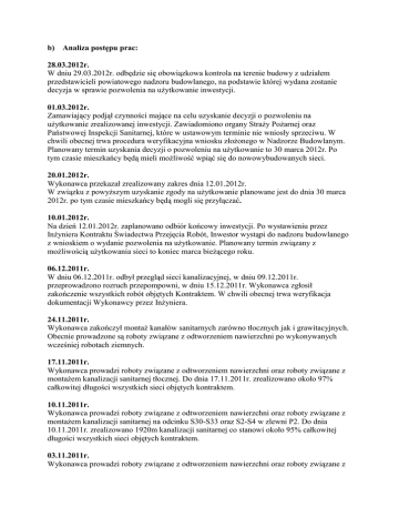 b) Analiza postępu prac: 28.03.2012r. W dniu 29.03.2012r. odbędzie się obowiązkowa kontrola na terenie budowy z udziałem przedstawicieli powiatowego nadzoru budowlanego, na podstawie której wydana zostanie decyzja w sprawie pozwolenia na użytkowanie inwestycji. 01.03.2012r. Zamawiający podjął czynności mające na celu uzyskanie decyzji o pozwoleniu na użytkowanie zrealizowanej inwestycji. Zawiadomiono organy Straży Pożarnej oraz Państwowej Inspekcji Sanitarnej, które w ustawowym terminie nie wniosły sprzeciwu. W chwili obecnej trwa procedura weryfikacyjna wniosku złożonego w Nadzorze Budowlanym. Planowany termin uzyskania decyzji o pozwoleniu na użytkowanie to 30 marca 2012r. Po tym czasie mieszkańcy będą mieli możliwość wpiąć się do nowowybudowanych sieci. 20.01.2012r. Wykonawca przekazał zrealizowany zakres dnia 12.01.2012r. W związku z powyższym uzyskanie zgody na użytkowanie planowane jest do dnia 30 marca 2012r. po tym czasie mieszkańcy będą mogli się przyłączać. 10.01.2012r. Na dzień 12.01.2012r. zaplanowano odbiór końcowy inwestycji. Po wystawieniu przez Inżyniera Kontraktu Świadectwa Przejęcia Robót, Inwestor wystąpi do nadzoru budowlanego z wnioskiem o wydanie pozwolenia na użytkowanie. Planowany termin związany z możliwością użytkowania sieci to koniec marca bieżącego roku. 06.12.2011r. W dniu 06.12.2011r. odbył przegląd sieci kanalizacyjnej, w dniu 09.12.2011r. przeprowadzono rozruch przepompowni, w dniu 15.12.2011r. Wykonawca zgłosił zakończenie wszystkich robót objętych Kontraktem. W chwili obecnej trwa weryfikacja dokumentacji Wykonawcy przez Inżyniera. 24.11.2011r. Wykonawca zakończył montaż kanałów sanitarnych zarówno tłocznych jak i grawitacyjnych. Obecnie prowadzone są roboty związane z odtworzeniem nawierzchni po wykonywanych wcześniej robotach ziemnych. 17.11.2011r. Wykonawca prowadzi roboty związane z odtworzeniem nawierzchni oraz roboty związane z montażem kanalizacji sanitarnej tłocznej. Do dnia 17.11.2011r. zrealizowano około 97% całkowitej długości wszystkich sieci objętych kontraktem. 10.11.2011r. Wykonawca prowadzi roboty związane z odtworzeniem nawierzchni oraz roboty związane z montażem kanalizacji sanitarnej na odcinku S30-S33 oraz S2-S4 w zlewni P2. Do dnia 10.11.2011r. zrealizowano 1920m kanalizacji sanitarnej co stanowi około 95% całkowitej długości wszystkich sieci objętych kontraktem. 03.11.2011r. Wykonawca prowadzi roboty związane z odtworzeniem nawierzchni oraz roboty związane z montażem kanalizacji sanitarnej na odcinku S14-S16. Do dnia 03.11.2011r. zrealizowano 1800m kanalizacji sanitarnej co stanowi około 90% całkowitej długości wszystkich sieci objętych kontraktem. 27.10.2011r. Wykonawca prowadzi roboty związane z odtworzeniem nawierzchni bitumicznych. Do dnia 27.10.2011r. zrealizowano 1580 co stanowi około 85% całkowitej długości wszystkich sieci objętych kontraktem. 20.10.2011r. Wykonawca w dalszym ciągu prowadzi roboty wykończeniowe przy przepompowniach ścieków. Do dnia 20.10.2011r. zrealizowano 1550 co stanowi około 84% całkowitej długości wszystkich sieci objętych kontraktem. 13.10.2011r. Wykonawca prowadzi roboty wykończeniowe przy przepompowniach ścieków. Zamontowano armaturę w przepompowniach P1 i P3. W przyszłym tygodniu Wykonawca planuje przystąpić do odtworzenia nawierzchni drogowych począwszy od zlewni P2. Do dnia 13.10.2011r. zrealizowano około 83% całkowitej długości wszystkich sieci objętych kontraktem. 06.10.2011r. Prowadzone są roboty w zlewniach P2 oraz P1. Wykonano Do dnia 06.10.2011r. ułożono około 1670 m sieci kanalizacji sanitarnej co stanowi około 83% całkowitej długości wszystkich sieci objętych kontraktem. 29.09.2011r. Prowadzone są roboty w zlewniach P2 oraz P1. Wykonano Do dnia 29.09.2011r. ułożono około 1340 m sieci kanalizacji sanitarnej co stanowi około 66% całkowitej długości wszystkich sieci objętych kontraktem. 22.09.2011r. Prowadzone są roboty w zlewniach P2 oraz P1. Wykonano m.in. przewierty pod drogą powiatową oraz część kanałów bocznych. Ułożono około 1260 m sieci kanalizacji sanitarnej co stanowi około 63% całkowitej długości wszystkich sieci objętych kontraktem. 16.09.2011r. W dalszym ciągu wykonywane są odcinki w zlewni P2 oraz P1. Ułożono około 1160 m sieci kanalizacji sanitarnej co stanowi około 58% całkowitej długości wszystkich sieci objętych kontraktem. 24.08.2011r. W chwili obecnej wykonywane są odcinki w zlewni P2 oraz P1. Wykonano kanalizację sanitarną grawitacyjną w zlewni P3. Zrealizowano około 35% całkowitej długości wszystkich sieci objętych kontraktem. 17.08.2011r. Wykonawca nadal prowadzi prace związane z ułożeniem sieci kanalizacyjne m.in w ul. Zwierzyniec Duży 28.07.2011r. W chwili obecnej wykonywane są przeciski pod drogą powiatową Zwierzyniec Duży oraz montaż kanałów zbiorczych w zlewni przepompowni P3 oraz w zlewni przepompowni P2. Zrealizowano ok. 350m sieci kanalizacji sanitarnej grawitacyjnej wraz z odrzutami co stanowi około 17% całkowitej długości wszystkich sieci objętych kontraktem. 21.07.2011r. Aktualnie wykonywane są przeciski pod drogą powiatową Zwierzyniec Duży. Zrealizowano ok. 170m sieci kanalizacji sanitarnej grawitacyjnej wraz z odrzutami co stanowi około 8% całkowitej długości wszystkich sieci objętych kontraktem 14.07.2011r. Wykonywane są przeciski pod drogą powiatową Zwierzyniec Duży. Zrealizowano ok. 140m sieci kanalizacji sanitarnej grawitacyjnej wraz z odrzutami. stan na 07.07.2011r. Wykonano ok. 80m sieci kanalizacji sanitarnej grawitacyjnej stan na 30.06.2011r. Wykonano ok. 80m sieci kanalizacji sanitarnej grawitacyjnej. stan na 09.06.2011 r. Wykonawca realizuje roboty przy ul. Zwierzyniec Duży w rejonie nowoprojektowanej przepompowni P3. Wykonano ok. 80m sieci kanalizacji sanitarnej grawitacyjnej. Maj 2011 r. W chwili obecnej realizowane są roboty związane z