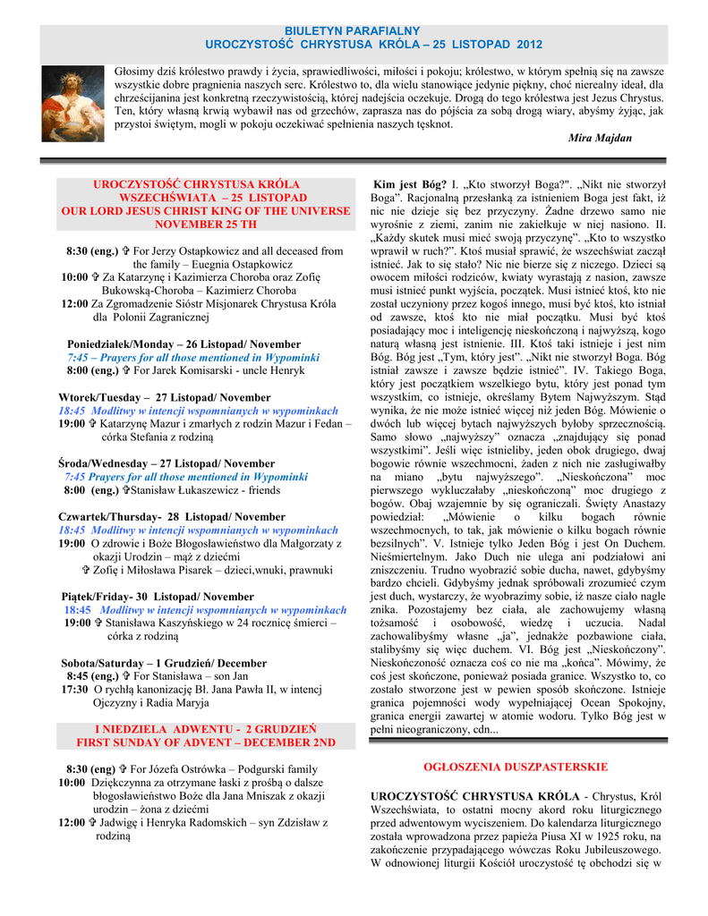BIULETYN PARAFIALNY UROCZYSTOŚĆ CHRYSTUSA KRÓLA – 25 LISTOPAD 2012 Głosimy dziś królestwo prawdy i życia, sprawiedliwości, miłości i pokoju; królestwo, w którym spełnią się na zawsze wszystkie dobre pragnienia naszych serc. Królestwo to, dla wielu stanowiące jedynie piękny, choć nierealny ideał, dla chrześcijanina jest konkretną rzeczywistością, której nadejścia oczekuje. Drogą do tego królestwa jest Jezus Chrystus. Ten, który własną krwią wybawił nas od grzechów, zaprasza nas do pójścia za sobą drogą wiary, abyśmy żyjąc, jak przystoi świętym, mogli w pokoju oczekiwać spełnienia naszych tęsknot. Mira Majdan UROCZYSTOŚĆ CHRYSTUSA KRÓLA WSZECHŚWIATA – 25 LISTOPAD OUR LORD JESUS CHRIST KING OF THE UNIVERSE NOVEMBER 25 TH 8:30 (eng.) For Jerzy Ostapkowicz and all deceased from the family – Euegnia Ostapkowicz 10:00 Za Katarzynę i Kazimierza Choroba oraz Zofię Bukowską-Choroba – Kazimierz Choroba 12:00 Za Zgromadzenie Sióstr Misjonarek Chrystusa Króla dla Polonii Zagranicznej Poniedziałek/Monday – 26 Listopad/ November 7:45 – Prayers for all those mentioned in Wypominki 8:00 (eng.) For Jarek Komisarski - uncle Henryk Wtorek/Tuesday – 27 Listopad/ November 18:45 Modlitwy w intencji wspomnianych w wypominkach 19:00 Katarzynę Mazur i zmarłych z rodzin Mazur i Fedan – córka Stefania z rodziną Środa/Wednesday – 27 Listopad/ November 7:45 Prayers for all those mentioned in Wypominki 8:00 (eng.) Stanisław Łukaszewicz - friends Czwartek/Thursday- 28 Listopad/ November 18:45 Modlitwy w intencji wspomnianych w wypominkach 19:00 O zdrowie i Boże Błogosławieństwo dla Małgorzaty z okazji Urodzin – mąż z dziećmi Zofię i Miłosława Pisarek – dzieci,wnuki, prawnuki Piątek/Friday- 30 Listopad/ November 18:45 Modlitwy w intencji wspomnianych w wypominkach 19:00 Stanisława Kaszyńskiego w 24 rocznicę śmierci – córka z rodziną Sobota/Saturday – 1 Grudzień/ December 8:45 (eng.) For Stanisława – son Jan 17:30 O rychłą kanonizację Bł. Jana Pawła II, w intencj Ojczyzny i Radia Maryja I NIEDZIELA ADWENTU - 2 GRUDZIEŃ FIRST SUNDAY OF ADVENT – DECEMBER 2ND 8:30 (eng) For Józefa Ostrówka – Podgurski family 10:00 Dziękczynna za otrzymane łaski z prośbą o dalsze błogosławieństwo Boże dla Jana Mniszak z okazji urodzin – żona z dziećmi 12:00 Jadwigę i Henryka Radomskich – syn Zdzisław z rodziną Kim jest Bóg? I. „Kto stworzył Boga?". „Nikt nie stworzył Boga”. Racjonalną przesłanką za istnieniem Boga jest fakt, iż nic nie dzieje się bez przyczyny. Żadne drzewo samo nie wyrośnie z ziemi, zanim nie zakiełkuje w niej nasiono. II. „Każdy skutek musi mieć swoją przyczynę”. „Kto to wszystko wprawił w ruch?”. Ktoś musiał sprawić, że wszechświat zaczął istnieć. Jak to się stało? Nic nie bierze się z niczego. Dzieci są owocem miłości rodziców, kwiaty wyrastają z nasion, zawsze musi istnieć punkt wyjścia, początek. Musi istnieć ktoś, kto nie został uczyniony przez kogoś innego, musi być ktoś, kto istniał od zawsze, ktoś kto nie miał początku. Musi być ktoś posiadający moc i inteligencję nieskończoną i najwyższą, kogo naturą własną jest istnienie. III. Ktoś taki istnieje i jest nim Bóg. Bóg jest „Tym, który jest”. „Nikt nie stworzył Boga. Bóg istniał zawsze i zawsze będzie istnieć”. IV. Takiego Boga, który jest początkiem wszelkiego bytu, który jest ponad tym wszystkim, co istnieje, określamy Bytem Najwyższym. Stąd wynika, że nie może istnieć więcej niż jeden Bóg. Mówienie o dwóch lub więcej bytach najwyższych byłoby sprzecznością. Samo słowo „najwyższy” oznacza „znajdujący się ponad wszystkimi”. Jeśli więc istnieliby, jeden obok drugiego, dwaj bogowie równie wszechmocni, żaden z nich nie zasługiwałby na miano „bytu najwyższego”. „Nieskończona” moc pierwszego wykluczałaby „nieskończoną” moc drugiego z bogów. Obaj wzajemnie by się ograniczali. Święty Anastazy powiedział: „Mówienie o kilku bogach równie wszechmocnych, to tak, jak mówienie o kilku bogach równie bezsilnych”. V. Istnieje tylko Jeden Bóg i jest On Duchem. Nieśmiertelnym. Jako Duch nie ulega ani podziałowi ani zniszczeniu. Trudno wyobrazić sobie ducha, nawet, gdybyśmy bardzo chcieli. Gdybyśmy jednak spróbowali zrozumieć czym jest duch, wystarczy, że wyobrazimy sobie, iż nasze ciało nagle znika. Pozostajemy bez ciała, ale zachowujemy własną tożsamość i osobowość, wiedzę i uczucia. Nadal zachowalibyśmy własne „ja”, jednakże pozbawione ciała, stalibyśmy się więc duchem. VI. Bóg jest „Nieskończony”. Nieskończoność oznacza coś co nie ma „końca”. Mówimy, że coś jest skończone, ponieważ posiada granice. Wszystko to, co zostało stworzone jest w pewien sposób skończone. Istnieje granica pojemności wody wypełniającej Ocean Spokojny, granica energii zawartej w atomie wodoru. Tylko Bóg jest w pełni nieograniczony, cdn... OGŁOSZENIA DUSZPASTERSKIE UROCZYSTOŚĆ CHRYSTUSA KRÓLA - Chrystus, Król Wszechświata, to ostatni mocny akord roku liturgicznego przed adwentowym wyciszeniem. Do kalendarza liturgicznego została wprowadzona przez papieża Piusa XI w 1925 roku, na zakończenie przypadającego wówczas Roku Jubileuszowego. W odnowionej liturgii Kościół uroczystość tę obchodzi się w ostatnią niedzielę roku kościelnego. „Czy Ty jesteś królem?” – zapytał Piłat Chrystusa. – „Tak, jestem królem”. Ale zaraz dodał: – „Królestwo Moje nie jest z tego świata”. Pomyślmy jeszcze raz i odpowiedzmy sobie na pytanie: Czy rzeczywiście Chrystus jest jedynym Królem i Panem mojego życia? Dzisiejsza uroczystość Chrystusa Króla kończy rok liturgiczny SIOSTRY MISJONARKI CHRYSTUSA KRÓLA - w Niedzielę Chrystusa Króla swoje Patronalne Święto obchodzą Siostry Misjonarki Chrystusa Króla dla Polonii Zagranicznej, posł