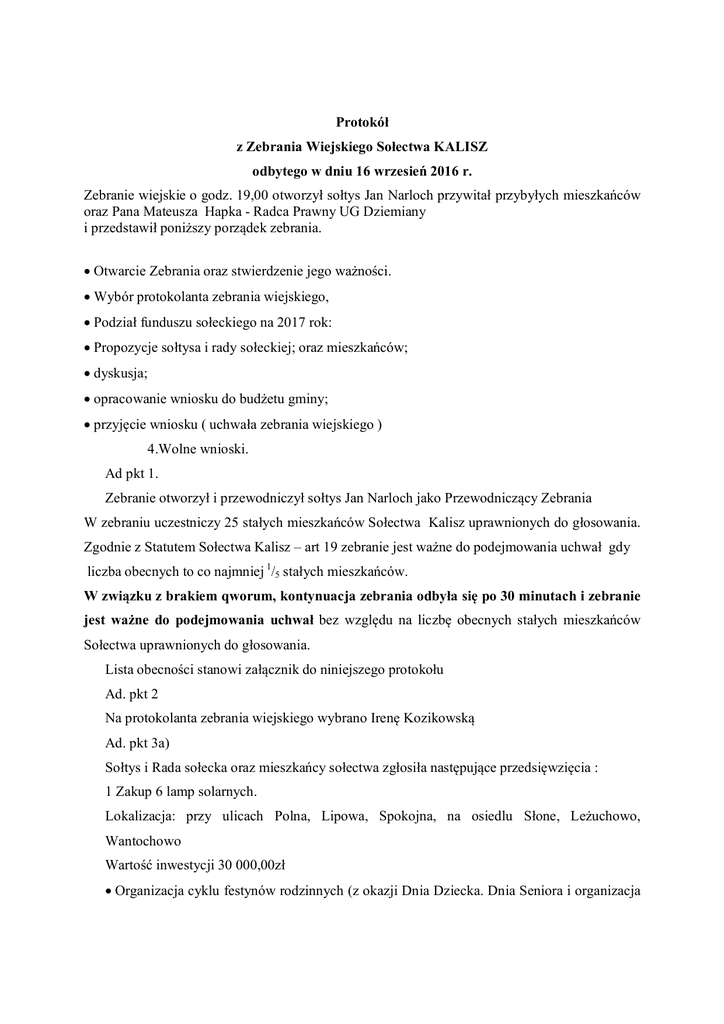 Protokół z Zebrania Wiejskiego Sołectwa Kalisz
