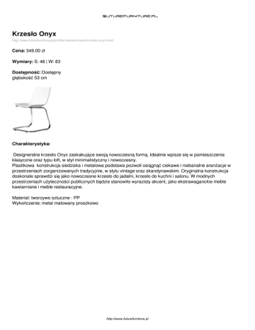 Krzesło Onyx http://www.futurefurniture.pl/pl/offer/meble/krzesla/krzeslo-onyx.html/ Cena: 349.00 zł Wymiary: S: 48 | W: 83 Dostępność: Dostępny głębokość 53 cm Charakterystyka: Designerskie krzesło Onyx zaskakujące swoją nowoczesną formą. Idealnie wpisze się w pomieszczenia klasyczne oraz typu loft, w styl minimalistyczny i nowoczesny. Plastikowa konstrukcja siedziska i metalowa podstawa pozwoli osiągnąć ciekawe i niebanalne aranżacje w przestrzeniach zorganizowanych tradycyjnie, w stylu vintage oraz skandynawskim. Oryginalna konstrukcja doskonale sprawdzi się jako nowoczesne krzesło do jadalni, krzesło do kuchni i salonu. W modnych przestrzeniach użyteczności publicznych będzie stanowiło wyrazisty akcent, jako ekstrawaganckie meble kawiarniane i meble restauracyjne. Materiał: tworzywo sztuczne - PP Wykończenie: metal malowany proszkowo http://www.futurefurniture.pl Dostępne wersje produktu: nazwa produktu Krzesło Onyx warianty kolor biały cena 349.00zł dostępne Dostępny Krzesło Onyx kolor czarny 349.00zł Dostępny http://www.futurefurniture.pl Zdjęcia produktu: http://www.futurefurniture.pl Powered by TCPDF (www.tcpdf.org)