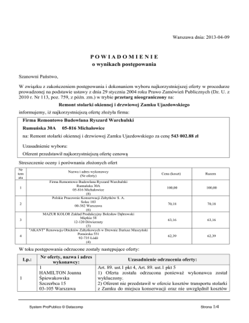 Warszawa dnia: 2013-04-09 POWIAD O M I E N I E o wynikach postępowania Szanowni Państwo, W związku z zakończeniem postępowania i dokonaniem wyboru najkorzystniejszej oferty w procedurze prowadzonej na podstawie ustawy z dnia 29 stycznia 2004 roku Prawo Zamówień Publicznych (Dz. U. z 2010 r. Nr 113, poz. 759, z późn. zm.) w trybie przetarg nieograniczony na: Remont stolarki okiennej i drzwiowej Zamku Ujazdowskiego informujemy, iż najkorzystniejszą ofertę złożyła firma: Firma Remontowo Budowlana Ryszard Warchulski Rumuńska 30A 05-816 Michałowice na: Remont stolarki okiennej i drzwiowej Zamku Ujazdowskiego za cenę 543 002.88 zł Uzasadnienie wyboru: Oferent przedstawił najkorzystniejszą ofertę cenową Streszczenie oceny i porównania złożonych ofert Nr tem atu 1 2 3 4 Nazwa i adres wykonawcy (Nr oferty) Firma Remontowo Budowlana Ryszard Warchulski Rumuńska 30A 05-816 Michałowice (8) Polskie Pracownie Konserwacji Zabytków S. A. Solec 103 00-382 Warszawa (6) MAZUR KOLOR Zakład Produkcyjny Bolesław Dąbrowski Miętkie 58 12-120 Dźwierzuty (3) "AKANT" Renowacja Obiektów Zabytkowych w Drewnie Dariusz Muszyński Pomorska 551 92-735 Łódź (4) Cena (koszt) Razem 100,00 100,00 70,18 70,18 63,16 63,16 62,39 62,39 W toku postępowania odrzucone zostały następujące oferty: Lp.: 1 Nr oferty, nazwa i adres wykonawcy: 1 HAMILTON Joanna Śpiewakowska Szczerbca 15 03-105 Warszawa System ProPublico © Datacomp Uzasadnienie odrzucenia oferty: Art. 89. ust.1 pkt 4, Art. 89. ust.1 pkt 5 1) Oferta została odrzucona ponieważ wykonawca został wykluczony. 2) Oferent nie przedstawił w ofercie kosztów transportu stolarki z Zamku do miejsca konserwacji oraz nie uwzględnił kosztów Strona 1/4 2 3 4 5 2 GOREK RESTAURO Sp. z o.o. Spółka Komandytowa Ruskowy Bród 79A 03-289 Warszawa 5 CONSENSUSBUDOWNICTWO Sp. z o.o. Pory 78 02-757 Warszawa 7 "CANDLE"s.s Pracownia Konserwacji Zabytków metaloplastyki i oświetlenia Artystycznego Sienkiewicza 4 05-091 Ząbki 9 Przedsiębiorstwo Wielobranżowe ANPOL Andrzej Polański Sapiehy 5 /5 37-630 Oleszyce jej załadunku i magazynowania. Na podstawie przedstawionych przez Oferenta stawkach do kosztorysowania koszty transportu powinny wynosić około 80 tyś zł. Najniższe koszty transportu zaoferowane w przetargu to 45tyś zł. Średnie koszty transportu na podstawie dziewięciu ofert to 66tyś zł. W wyjaśnieniach co do sposobu kalkulacji kosztów Oferent stwierdził że koszty transportu ukryte zostały w kosztach materiałów oraz w zysku . Jednakże omawiana oferta przedstawia koszty materiałów na kwotę 85tyś zł a zysk na poziomie 24tyś zł co przy założeniu że koszty transportu będą nawet niższe od przedstawionej średniej czyni ofertę niewiarygodną. Art. 89. ust.1 pkt 6 Sposób obliczenia ceny oferty jest odmienny od tego, który został ustanowiony przez zamawiającego w SIWZ.. W druku oferty Oferent powinien był wypełniając kosztorys przedstawić cenę z narzutami. Z rozpatrzenia tylko koszty robocizny, gdzie na podstawie podanych przez Oferenta stawek do kosztorysowania najłatwiej można zweryfikować ofertę, wynika że we wszystkie (z małym wyjątkiem) rubryki zostały wpisane koszty bezpośrednie. Co za tym idzie cena końcowa nie zawiera kosztów z narzutami. Popełniona omyłka nie należy do kategorii omyłek, o których mowa w przepisie art. 87 ust. 2 pkt 1 i 2 Pzp. Ewentualne poprawienie omyłek spowoduje, że dojdzie w konsekwencji do poprawienia ceny oferty. Biorąc pod uwagę wysokość nieuwzględnionych w ofercie czynników cenotwórczych ( Kp= 75% i Zysk= 16%) poprawiona cena różnić sie będzie znacznie co w konsekwencji doprowadzi do istotnych zmian w treści oferty. Art. 89. ust.1 pkt 5 Oferta została odrzucona wykluczony ponieważ wykonawca został Art. 89. ust.1 pkt 5 Oferta została odrzucona wykluczony ponieważ wykonawca został Art. 89. ust.1 pkt 5 Oferta została odrzucona wykluczony ponieważ wykonawca został Zamawiający wykluczył z postępowania: System ProPublico © Datacomp Strona 2/4 Lp.: 1 Nazwa i adres wykonawcy: "CANDLE"s.s Pracownia Konserwacji Zabytków metaloplastyki i oświetlenia Artystycznego Sienkiewicza 4 05-091 Ząbki Uzasadnienie wykluczenia wykonawcy: Art. 24 ust. 2 pkt 4 Nie spełniono warunku dokumentu: Wykaz robót Nr1 Uzasadnienie : Z przedstawionych przez Oferenta referencji dotyczących prac w obiektach o charakterze zabytkowym nie wynika, że prace dotyczyły konserwacji stolarki okiennej bądź drzwiowej czyli prac odpowiadających charakterem robotom stanowiącym przedmiot zamówienia. Art. 24 ust. 2 pkt 4 2 Nie złożono dokumentu: Wykaz robót Nr1 Uzasadnienie : Oferent nie złożył wykazu robót. Nie spełniono warunku dokumentu: Wykaz robót Nr2 Uzasadnienie : W złożonym wykazie przedstawione są dwa zadania inwestycyjne. Zadanie pierwsze -Szpital Tworkowski CONSENSUSBUDOWNICTWO Sp. z udokumentowane jest referencjami które mówią wyłącznie o robotach ogólnobudowlanych polegających na modernizacji o.o. obiektu. Pory 78 Zadanie drugie - Remont Katedry Warszawa budynek Pałacu 02-757 Warszawa Biskupiego udokumentowany jest referencjami które mówią o wykonywaniu robót ogólnobudowlanych w tym o wymianie stolarki drzwiowej i okiennej. Tak więc w obu przypadkach nie udokumentowano, że oferent wykonywał konserwacje stolarki okiennej i drzwiowej. Art. 24 ust. 2 pkt 4 3 Nie spełniono warunku dokumentu: Wykaz osób Uzasadnienie : Według wymagań Zamawiającego osoba kierująca pracami powinna posiadać uprawnienia do kierowania robotami budowlanymi przy zabytkach nieruchomych uzyskane na podstawie przepisów wcześniej obowiązujących, zgodnie z § 13 Rozporządzenia Ministra Kultury z dnia 9 czerwca 2004 r. w HAMILTON Joanna sprawie prowadzenia prac konserwatorskich, restauratorskich, robót budowlanych, badań konserwatorskich i Śpiewakowska architektonicznych, a także innych działań przy zabytku Szczerbca 15 wpisanym do rejestru zabytk