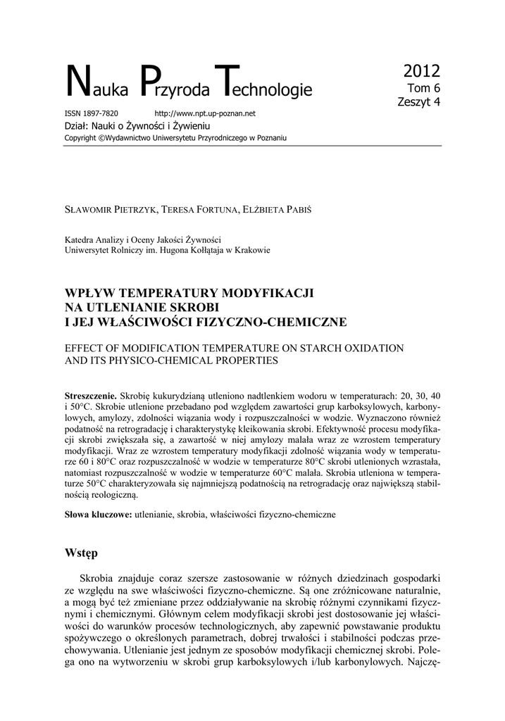 Nauka Przyroda Technologie ISSN 1897-7820 http://www.npt.up-poznan.net 2012 Tom 6 Zeszyt 4 Dział: Nauki o Żywności i Żywieniu Copyright ©Wydawnictwo Uniwersytetu Przyrodniczego w Poznaniu SŁAWOMIR PIETRZYK, TERESA FORTUNA, ELŻBIETA PABIŚ Katedra Analizy i Oceny Jakości Żywności Uniwersytet Rolniczy im. Hugona Kołłątaja w Krakowie WPŁYW TEMPERATURY MODYFIKACJI NA UTLENIANIE SKROBI I JEJ WŁAŚCIWOŚCI FIZYCZNO-CHEMICZNE EFFECT OF MODIFICATION TEMPERATURE ON STARCH OXIDATION AND ITS PHYSICO-CHEMICAL PROPERTIES Streszczenie. Skrobię kukurydzianą utleniono nadtlenkiem wodoru w temperaturach: 20, 30, 40 i 50°C. Skrobie utlenione przebadano pod względem zawartości grup karboksylowych, karbonylowych, amylozy, zdolności wiązania wody i rozpuszczalności w wodzie. Wyznaczono również podatność na retrogradację i charakterystykę kleikowania skrobi. Efektywność procesu modyfikacji skrobi zwiększała się, a zawartość w niej amylozy malała wraz ze wzrostem temperatury modyfikacji. Wraz ze wzrostem temperatury modyfikacji zdolność wiązania wody w temperaturze 60 i 80°C oraz rozpuszczalność w wodzie w temperaturze 80°C skrobi utlenionych wzrastała, natomiast rozpuszczalność w wodzie w temperaturze 60°C malała. Skrobia utleniona w temperaturze 50°C charakteryzowała się najmniejszą podatnością na retrogradację oraz największą stabilnością reologiczną. Słowa kluczowe: utlenianie, skrobia, właściwości fizyczno-chemiczne Wstęp Skrobia znajduje coraz szersze zastosowanie w różnych dziedzinach gospodarki ze względu na swe właściwości fizyczno-chemiczne. Są one zróżnicowane naturalnie, a mogą być też zmieniane przez oddziaływanie na skrobię różnymi czynnikami fizycznymi i chemicznymi. Głównym celem modyfikacji skrobi jest dostosowanie jej właściwości do warunków procesów technologicznych, aby zapewnić powstawanie produktu spożywczego o określonych parametrach, dobrej trwałości i stabilności podczas przechowywania. Utlenianie jest jednym ze sposobów modyfikacji chemicznej skrobi. Polega ono na wytworzeniu w skrobi grup karboksylowych i/lub karbonylowych. Najczę- 2 Pietrzyk S., Fortuna T., Pabiś E., 2012. Wpływ temperatury modyfikacji na utlenianie skrobi i jej właściwości fizyczno-chemiczne. Nauka Przyr. Technol. 6, 4, #65. ściej stosowanymi utleniaczami są: chlorany, jodany, nadtlenki i kwasy organiczne (WURZBURG 1988, TOMASIK 2002). Kleiki skrobiowe przygotowane ze skrobi utlenionych charakteryzują się dużą stabilnością, słabszą tendencją do retrogradacji i synerezy. W przemyśle spożywczym skrobie utlenione są podstawowym składnikiem budyniów, kisieli, sosów i zup w proszku. Ponadto skrobie utlenione znalazły zastosowanie jako kleje i substancje do tworzenia powłok w przemyśle papierniczym i włókienniczym (MĘŻYŃSKI i SZYMANKIEWICZ 1988, NADISON 1995, LESZCZYŃSKI 2006). Obecnie do produkcji żywności dopuszcza się stosowanie jedynie skrobi utlenionej chloranem(I) sodu (E 1404) (ROZPORZĄDZENIE... 2010). Jednak prowadzone są badania nad zastosowaniem innych środków utleniających, a także innych warunków przeprowadzania modyfikacji, co ma przyczynić się do produkcji żywności o lepszych właściwościach funkcjonalnych oraz sensorycznych. Celem pracy było określenie wpływu temperatury procesu utleniania skrobi na efektywność modyfikacji i na zmiany właściwości fizyczno-chemicznych uzyskanych modyfikatów. Materiał i metody Skrobię kukurydzianą (Cargill, Kąty Wrocławskie, Polska) poddano procesowi utleniania nadtlenkiem wodoru w obecności jonów Cu(II) (w postaci CuSO4 · 5H2O) o stężeniu 0,1 g w 100 g s.s. skrobi zgodnie z metodą, którą podali PAROVUORI i IN. (1995). Proces utleniania prowadzono oddzielnie w temperaturach 20, 30, 40 i 50°C. Sporządzono 42-procentową zawiesinę wodną skrobi, którą ogrzewano 15 min, następnie do mieszaniny reakcyjnej dodawano kroplami 30-procentowy roztwór H2O2 (cz.d.a., Lach-Ner, Czechy) tak, aby jego końcowe stężenie wynosiło 2 g w 100 g s.s. skrobi. Mieszaninę termostatowano jeszcze przez 60 min, przemywano, suszono, rozdrabniano i przesiewano. W skrobiach wyjściowych i utlenionych oznaczono zawartość: grup karboksylowych (PN-EN ISO 11214 2001), grup karbonylowych (WHISTLER i IN. 1967), amylozy metodą spektrofotometryczną z jodem (MORRISON i LAIGNELET 1983), zdolność wiązania wody i rozpuszczalność w wodzie w temperaturze 60°C i 80°C zmodyfikowaną metodą Leacha (RICHTER i IN. 1968). Ponadto wyznaczono charakterystykę kleikowania wodnych dyspersji skrobiowych w wiskozymetrze rotacyjnym Rheotest 2 przy stężeniu 7,2 g w 100 g. Próbkę ogrzewano przy ciągłym mieszaniu z szybkością 27 obr/min od temperatury 50°C do 96°C, następnie przetrzymywano w tej temperaturze przez 20 min, z kolei chłodzono do temperatury 50°C i przetrzymywano przez 10 min. Programowany wzrost i spadek temperatury wynosił 1,5°C/min. Wartości lepkości i temperatury odczytywano w następujących punktach charakterystyki kleikowania: temperatura kleikowania (Tk), maksimum lepkości (max), temperatura przy maksimum lepkości (Tmax), lepkość w temperaturze 96°C (96°C), lepkość po 20 min. ogrzewania w temperaturze 96°C (96°C/20), lepkość po ochłodzeniu w temperaturze 50°C (50°C), lepkość po 10 min przetrzymywania w temperaturze 50°C (50°C/10) (WINKLER i IN. 1971). Wyznaczono również podatność na retrogradację 2-procentowych kleików skrobiowych metodą turbidymetryczną (JACOBSON i IN. 1997). Kleiki skrobiowe przetrzymywano w temperaturze 3 Pietrzyk S., Fortuna T., Pabiś E., 2012. Wpływ temperatury modyfikacji na utlenianie skrobi i jej właściwości fizyczno-chemiczne. Nauka Przyr. Technol. 6, 4, #65. 8°C przez 21 dni. Kolejnych pomiarów turbidancji dokonano w 1., 3., 5., 7., 10., 14. i 21. dniu przechowywania. Wszystkie analizy wykonano w trzech powtórzeniach. W celu określenia istotności r