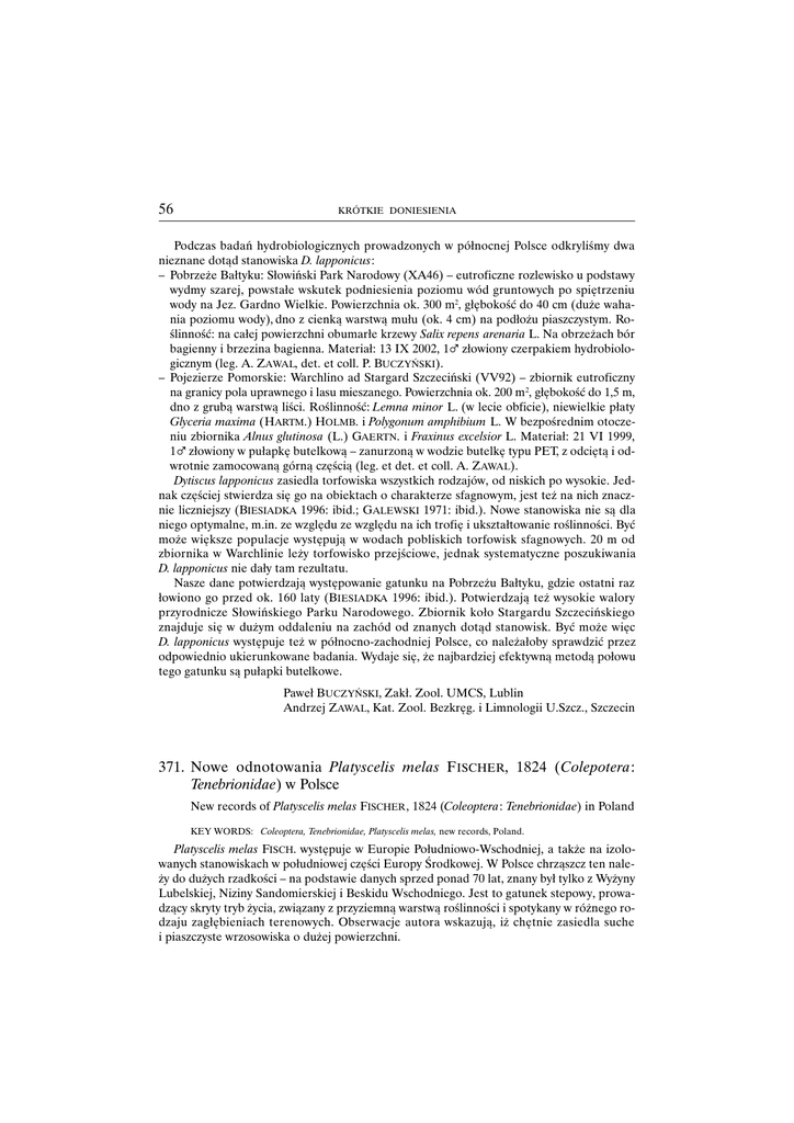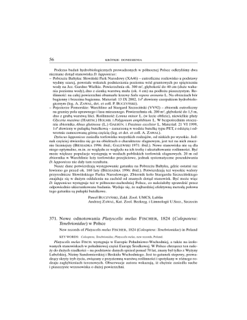 56 KRÓTKIE DONIESIENIA Podczas badań hydrobiologicznych prowadzonych w północnej Polsce odkryliśmy dwa nieznane dotąd stanowiska D. lapponicus: – Pobrzeże Bałtyku: Słowiński Park Narodowy (XA46) – eutroficzne rozlewisko u podstawy wydmy szarej, powstałe wskutek podniesienia poziomu wód gruntowych po spiętrzeniu wody na Jez. Gardno Wielkie. Powierzchnia ok. 300 m2, głębokość do 40 cm (duże wahania poziomu wody), dno z cienką warstwą mułu (ok. 4 cm) na podłożu piaszczystym. Roślinność: na całej powierzchni obumarłe krzewy Salix repens arenaria L. Na obrzeżach bór bagienny i brzezina bagienna. Materiał: 13 IX 2002, 1% złowiony czerpakiem hydrobiologicznym (leg. A. ZAWAL, det. et coll. P. BUCZYŃSKI). – Pojezierze Pomorskie: Warchlino ad Stargard Szczeciński (VV92) – zbiornik eutroficzny na granicy pola uprawnego i lasu mieszanego. Powierzchnia ok. 200 m 2, głębokość do 1,5 m, dno z grubą warstwą liści. Roślinność: Lemna minor L. (w lecie obficie), niewielkie płaty Glyceria maxima (HARTM.) HOLMB. i Polygonum amphibium L. W bezpośrednim otoczeniu zbiornika Alnus glutinosa (L.) GAERTN. i Fraxinus excelsior L. Materiał: 21 VI 1999, 1% złowiony w pułapkę butelkową – zanurzoną w wodzie butelkę typu PET, z odciętą i odwrotnie zamocowaną górną częścią (leg. et det. et coll. A. ZAWAL). Dytiscus lapponicus zasiedla torfowiska wszystkich rodzajów, od niskich po wysokie. Jednak częściej stwierdza się go na obiektach o charakterze sfagnowym, jest też na nich znacznie liczniejszy (BIESIADKA 1996: ibid.; GALEWSKI 1971: ibid.). Nowe stanowiska nie są dla niego optymalne, m.in. ze względu ze względu na ich trofię i ukształtowanie roślinności. Być może większe populacje występują w wodach pobliskich torfowisk sfagnowych. 20 m od zbiornika w Warchlinie leży torfowisko przejściowe, jednak systematyczne poszukiwania D. lapponicus nie dały tam rezultatu. Nasze dane potwierdzają występowanie gatunku na Pobrzeżu Bałtyku, gdzie ostatni raz łowiono go przed ok. 160 laty (B IESIADKA 1996: ibid.). Potwierdzają też wysokie walory przyrodnicze Słowińskiego Parku Narodowego. Zbiornik koło Stargardu Szczecińskiego znajduje się w dużym oddaleniu na zachód od znanych dotąd stanowisk. Być może więc D. lapponicus występuje też w północno-zachodniej Polsce, co należałoby sprawdzić przez odpowiednio ukierunkowane badania. Wydaje się, że najbardziej efektywną metodą połowu tego gatunku są pułapki butelkowe. Paweł B UCZYŃSKI, Zakł. Zool. UMCS, Lublin Andrzej ZAWAL, Kat. Zool. Bezkręg. i Limnologii U.Szcz., Szczecin 371. Nowe odnotowania Platyscelis melas F ISCHER, 1824 (Colepotera: Tenebrionidae) w Polsce New records of Platyscelis melas FISCHER , 1824 (Coleoptera: Tenebrionidae) in Poland KEY WORDS: Coleoptera, Tenebrionidae, Platyscelis melas, new records, Poland. Platyscelis melas FISCH. występuje w Europie Południowo-Wschodniej, a także na izolowanych stanowiskach w południowej części Europy Środkowej. W Polsce chrząszcz ten należy do dużych rzadkości – na podstawie danych sprzed ponad 70 lat, znany był tylko z Wyżyny Lubelskiej, Niziny Sandomierskiej i Beskidu Wschodniego. Jest to gatunek stepowy, prowadzący skryty tryb życia, związany z przyziemną warstwą roślinności i spotykany w różnego rodzaju zagłębieniach terenowych. Obserwacje autora wskazują, iż chętnie zasiedla suche i piaszczyste wrzosowiska o dużej powierzchni. WIAD. ENTOMOL., 23 (1): POZNAŃ 2004 57 Współczesne występowanie tego gatunku stwierdzono na dwóch stanowiskach: – Nizina Sandomierska: Antoniów (UTM: EB62), jednoroczna uprawa sosnowa, 9 V 2001, 1 ex., w dołku pułapkowym na Hylobius abietis (L.), leg. R. CIEŚLAK. – Wyżyna Lubelska: Radomyśl nad Sanem (EB71), wrzosowisko, 18 V 2003, 5exx., na dnie wykopanego dołu; 8 VI 2003, 2 exx., w głębokich koleinach piaszczystej drogi przecinającej wrzosowisko, leg. R. CIEŚLAK. Rafał CIEŚLAK , Tarnobrzeg 372. Nowe stanowiska niektórych, krajowych gatunków chrząszczy z rodziny goleńczykowatych (Coleoptera: Eucnemidae) New records of some species of the family Eucnemidae (Coleoptera) from Poland KEY WORDS: Coleoptera, Eucnemidae, Microrhagus, Hylis, Isorhipis, faunistic records, Poland. Poniższe gatunki i stanowiska wyszczególnione zostały w oparciu o materiały znajdujące się w zbiorze Katedry Ochrony Lasu i Ekologii SGGW i w zbiorach autorów. Nazwy krain, z których poszczególne gatunki nie były wcześniej wykazywane wyróżniono gwiazdką [*]. Microrhagus emyi (ROUGET, 1855) – Podlasie*: Czarna Białostocka (FE51), rezerwat „Jesionowe Góry”, w żółtą miskę zawieszoną 0,5 m nad ziemią, pod jesionem Fraxinus sp., 17 VIII 2002, 2 exx., 12 VII 2003, 5 exx., leg. J. SAWONIEWICZ. Gatunek znany z Polski jak dotąd tylko z Puszczy Białowieskiej (BYK 2001: [W:] Próba szacunkowej waloryzacji lasów Puszczy Białowieskiej metodą zooindykacyjną. Wyd. SGGW, Warszawa: 333-367), na podstawie jednego okazu zebranego w roku 2000. Microrhagus lepidus (ROSENHAUER , 1847) – Pojezierze Mazurskie*: Pasłęk (DE18), rezerwat „Dęby w Krukach Pasłęckich”, w pułapkę przegrodową zawieszoną przed dziuplą na dębie Quercus sp., 1–30 VI 2002, 1 ex., leg. S. BYK. Microrhagus pygmaeus (F ABRICIUS, 1792) – Pojezierze Mazurskie: Pasłęk (DE18), rezerwat „Dęby w Krukach Pasłęckich”, w pułapkę przegrodową zawieszoną przed dziuplą na grabie Carpinus betulus L., 1–30 VI 2002, 1 ex., leg. S. Byk. – Pojezierze Mazurskie: Gładysze ad Młynary (DF20), w pułapki przegrodowe zawieszone przed dziuplami na dębie Quercus sp. i kasztanowcu Aesculus hippocastanum L., 1–30 VI 2003, 2 exx., leg. S. BYK. – Podlasie*: Czarna Białostocka (FE51), rezerwat „Jesionowe Góry”, pod jesionem Fraxinus sp., 12 VII 2003, 4 exx., leg. J. SAWONIEWICZ. Hylis olexai (PALM, 1955) – Pojezierze Mazurskie*: Pasłęk (DE18), rezerwat „D