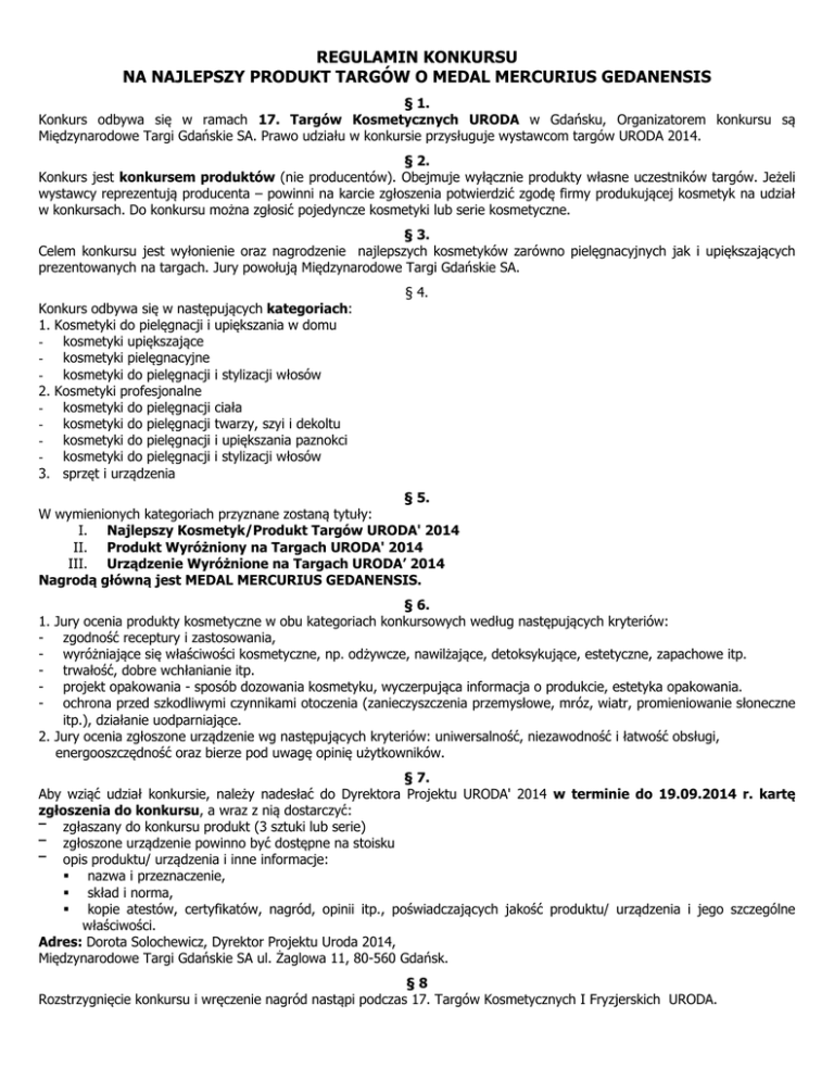 REGULAMIN KONKURSU NA NAJLEPSZY PRODUKT TARGÓW O MEDAL MERCURIUS GEDANENSIS § 1. Konkurs odbywa się w ramach 17. Targów Kosmetycznych URODA w Gdańsku, Organizatorem konkursu są Międzynarodowe Targi Gdańskie SA. Prawo udziału w konkursie przysługuje wystawcom targów URODA 2014. § 2. Konkurs jest konkursem produktów (nie producentów). Obejmuje wyłącznie produkty własne uczestników targów. Jeżeli wystawcy reprezentują producenta – powinni na karcie zgłoszenia potwierdzić zgodę firmy produkującej kosmetyk na udział w konkursach. Do konkursu można zgłosić pojedyncze kosmetyki lub serie kosmetyczne. § 3. Celem konkursu jest wyłonienie oraz nagrodzenie najlepszych kosmetyków zarówno pielęgnacyjnych jak i upiększających prezentowanych na targach. Jury powołują Międzynarodowe Targi Gdańskie SA. Konkurs odbywa się w następujących kategoriach: 1. Kosmetyki do pielęgnacji i upiększania w domu - kosmetyki upiększające - kosmetyki pielęgnacyjne - kosmetyki do pielęgnacji i stylizacji włosów 2. Kosmetyki profesjonalne - kosmetyki do pielęgnacji ciała - kosmetyki do pielęgnacji twarzy, szyi i dekoltu - kosmetyki do pielęgnacji i upiększania paznokci - kosmetyki do pielęgnacji i stylizacji włosów 3. sprzęt i urządzenia § 4. § 5. W wymienionych kategoriach przyznane zostaną tytuły: I. Najlepszy Kosmetyk/Produkt Targów URODA' 2014 II. Produkt Wyróżniony na Targach URODA' 2014 III. Urządzenie Wyróżnione na Targach URODA’ 2014 Nagrodą główną jest MEDAL MERCURIUS GEDANENSIS. § 6. Jury ocenia produkty kosmetyczne w obu kategoriach konkursowych według następujących kryteriów: zgodność receptury i zastosowania, wyróżniające się właściwości kosmetyczne, np. odżywcze, nawilżające, detoksykujące, estetyczne, zapachowe itp. trwałość, dobre wchłanianie itp. projekt opakowania - sposób dozowania kosmetyku, wyczerpująca informacja o produkcie, estetyka opakowania. ochrona przed szkodliwymi czynnikami otoczenia (zanieczyszczenia przemysłowe, mróz, wiatr, promieniowanie słoneczne itp.), działanie uodparniające. 2. Jury ocenia zgłoszone urządzenie wg następujących kryteriów: uniwersalność, niezawodność i łatwość obsługi, energooszczędność oraz bierze pod uwagę opinię użytkowników. 1. - § 7. Aby wziąć udział konkursie, należy nadesłać do Dyrektora Projektu URODA' 2014 w terminie do 19.09.2014 r. kartę zgłoszenia do konkursu, a wraz z nią dostarczyć: – zgłaszany do konkursu produkt (3 sztuki lub serie) – zgłoszone urządzenie powinno być dostępne na stoisku – opis produktu/ urządzenia i inne informacje: nazwa i przeznaczenie, skład i norma, kopie atestów, certyfikatów, nagród, opinii itp., poświadczających jakość produktu/ urządzenia i jego szczególne właściwości. Adres: Dorota Solochewicz, Dyrektor Projektu Uroda 2014, Międzynarodowe Targi Gdańskie SA ul. Żaglowa 11, 80-560 Gdańsk. §8 Rozstrzygnięcie konkursu i wręczenie nagród nastąpi podczas 17. Targów Kosmetycznych I Fryzjerskich URODA.