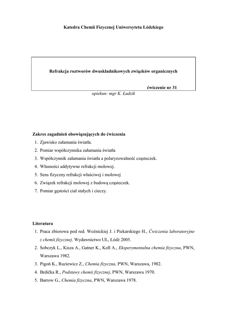 Katedra Chemii Fizycznej Uniwersytetu Łódzkiego Refrakcja roztworów dwuskładnikowych związków organicznych ćwiczenie nr 31 opiekun: mgr K. Łudzik Zakres zagadnień obowiązujących do ćwiczenia 1. Zjawisko załamania światła. 2. Pomiar współczynnika załamania światła 3. Współczynnik załamania światła a polaryzowalność cząsteczek. 4. Własności addytywne refrakcji molowej. 5. Sens fizyczny refrakcji właściwej i molowej 6. Związek refrakcji molowej z budową cząsteczek. 7. Pomiar gęstości ciał stałych i cieczy. Literatura 1. Praca zbiorowa pod red. Woźnickiej J. i Piekarskiego H., Ćwiczenia laboratoryjne z chemii fizycznej, Wydawnictwo UŁ, Łódź 2005. 2. Sobczyk L., Kisza A., Gatner K., Koll A., Eksperymentalna chemia fizyczna, PWN, Warszawa 1982. 3. Pigoń K., Ruziewicz Z., Chemia fizyczna, PWN, Warszawa, 1982. 4. Brdička R., Podstawy chemii fizycznej, PWN, Warszawa 1970. 5. Barrow G., Chemia fizyczna, PWN, Warszawa 1978. Celem ćwiczenia jest wyznaczenie refrakcji molowych poszczególnych substancji organicznych i ich mieszanin dwuskładnikowych o stałym stosunku molowym na podstawie pomiarów współczynnika załamania światła oraz gęstości badanych związków organicznych. Uzyskane dane pozwalają określić skład molowy i wagowy badanych mieszanin. Układ pomiarowy Do pomiaru współczynnika załamania światła substancji stosowany jest refraktometr Abbego, zaś do pomiaru gęstości – piknometr. Zasada działania refraktometru oparta jest na pomiarze kąta granicznego Ogólny schemat przyrządu przedstawiono na rysunku 1. Rys. 1. Refraktometr Abbego Zasada działania refraktometru Cienką warstwę badanej cieczy umieszcza się pomiędzy dwoma pryzmatami wykonanymi ze szkła charakteryzującego się dużym współczynnikiem załamania światła. Odbite od zwierciadła promienie padają na pierwszy pryzmat, załamują się w nim i pod różnymi kątami padają na badaną substancję. Pryzmat ten pełni rolę pryzmatu oświetlającego. Do drugiego pryzmatu – załamującego, przechodzi tylko część promieniowania. Jest on częściowo oświetlony promieniami padającymi pod 2 kątem mniejszym lub równym kątowi granicznemu. Wszystkie promienie, które padają pod kątem większym niż graniczny zostają całkowicie odbite i nie przedostają się do drugiego pryzmatu. Promień zaznaczony na rysunku 1 linią ciągłą jest promieniem granicznym. Po opuszczeniu pryzmatu załamującego, promienie trafiają do lunetki. W okularze lunetki umieszczone są skrzyżowane pod kątem prostym „nici pajęcze”. Położenie zespołu pryzmatów względem lunetki zmienia się w taki sposób, aby pole widoczne w okularze było podzielone na część jasną i ciemną. Granicę obu pól ustawia się dokładnie na skrzyżowaniu nici pajęczych. Obrót pryzmatów jest zsynchronizowany ze skalą przyrządu, na której odczytuje się wprost wartości współczynnika załamania światła badanej cieczy. Refraktometr zaopatrzony jest w lupę, co pozwala na odczyt współ-czynnika załamania światła n z dokładnością ±2 10-4. Zastosowanie w pomiarach światła białego, zamiast monochromatycznego, powoduje zabarwienie i rozmycie granicy obu pól, a tym samym obniżenie dokładności pomiaru. Pewne skompensowanie zjawiska jest możliwe dzięki wbudowaniu w przyrząd zespołu pryzmatów Amiciego, które odchylają silnie wszystkie promienie o długościach fal innych, niż żółta linia światła sodowego. Podczas pomiaru wskazane jest utrzymywanie stałej temperatury cieczy wprowadzonej między płaszczyzny pryzmatów. W tym celu są one obudowane osłoną metaliczną, przez którą może przepływać strumień wody z ultratermostatu. Pomiar współczynnika załamania światła - przy użyciu pipety automatycznej nanieść substancję na pryzmat refraktometru - lusterkiem oświetlić skalę przyrządu tak aby w okularze były wyraźnie widoczne dwie krzyżujące się linie oraz skala wartości współczynnika załamania światła - pokrętłem znajdującym się z prawej strony okularu należy tak ustawić pryzmaty refraktometru, aby w okularze otrzymać ostrą granicę między polami jasnym i ciemnym - przy pomocy pokrętła znajdującego się z lewej strony okularu ustawić granice pól dokładnie w punkcie krzyżowania się linii - ze skali znajdującej się po lewej stronie odczytać wartość współczynnika załamania światła n z dokładnością ±2 10-4 Uwaga. Jeżeli nie można uzyskać wyraźnej granicy pól jasnego i ciemnego, oznacza to, że ciecz w pryzmacie odparowała lub spłynęła. Należy ją ponownie nanieść na pryzmat. 3 Odczynniki chemiczne i sprzęt laboratoryjny: metanol, etanol, dioksan, toluen oraz ich mieszaniny o stałym stosunku molowym: metanol – dioksan, metanol – toluen, etanol – dioksan, etanol – toluen, piknometr, pipeta, suszarka. Wykonanie ćwiczenia i przedstawienie wyników pomiarów 1. Pusty, suchy piknometr zważyć na wadze analitycznej z dokładnością ±0,0002 g i zanotować jego masę mp. 2. Zważyć piknometr napełniony badaną cieczą. Nadmiar cieczy wypełniającej kapilarę w korku piknometru usunąć bibułą. Pomiary wykonać kolejno dla czterech wymienionych w tabeli wyników substancji oraz dla czterech ich mieszanin. Uwaga: Piknometr przed napełnieniem badaną cieczą powinien być starannie wysuszony suszarką. Przed każdorazowym pobraniem cieczy, końcówka pipety automatycznej również powinna być wysuszona suszarką. 3. Na końcu zważyć piknometr napełniony wodą destylowaną mp+w. 4. Przy użyciu refraktometru Abbego zmierzyć współczynniki załamania światła czterech substancji czystych ns i czterech mieszanin n1,2 w temperaturze pomiaru t. 5. Uzyskane wyniki zamieścić w poniższej tabeli. Tabela wyników pomiarów Masa pustego piknometru mp [g] = Temperatura otoczenia t [ C] = składnik Masa Współczynnik piknometru załamania z badaną światła cieczą ns, i n1,2 [g] m