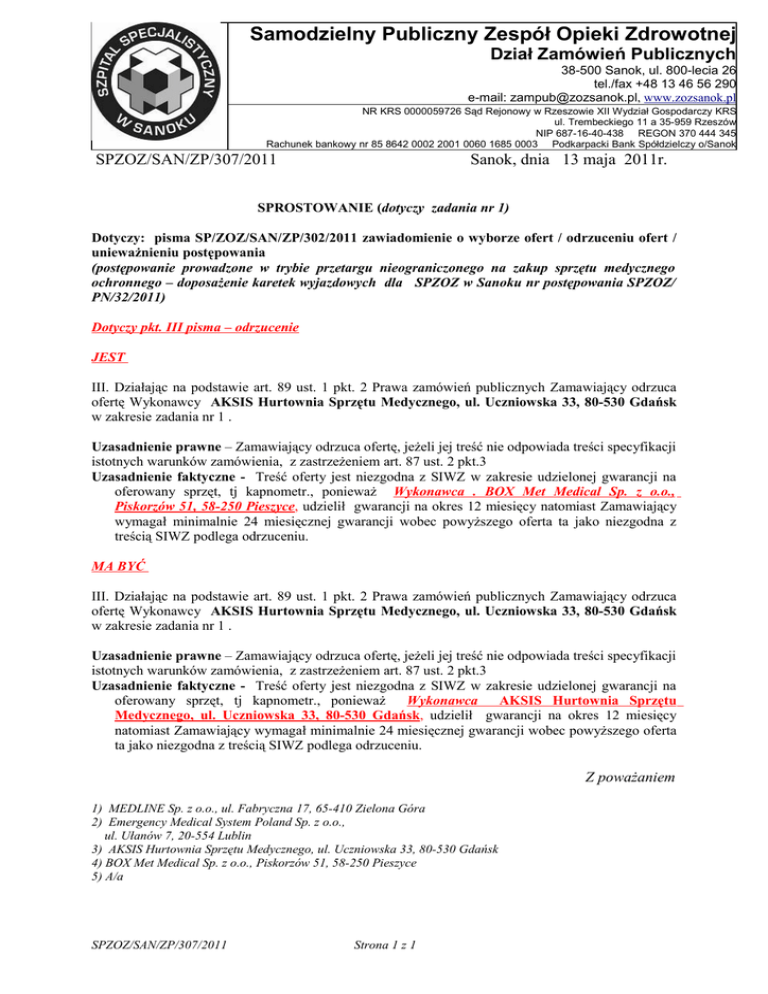 Samodzielny Publiczny Zespół Opieki Zdrowotnej Dział Zamówień Publicznych 38-500 Sanok, ul. 800-lecia 26 tel./fax +48 13 46 56 290 e-mail: [email protected], www.zozsanok.pl NR KRS 0000059726 Sąd Rejonowy w Rzeszowie XII Wydział Gospodarczy KRS ul. Trembeckiego 11 a 35-959 Rzeszów NIP 687-16-40-438 REGON 370 444 345 Rachunek bankowy nr 85 8642 0002 2001 0060 1685 0003 Podkarpacki Bank Spółdzielczy o/Sanok SPZOZ/SAN/ZP/307/2011 Sanok, dnia 13 maja 2011r. SPROSTOWANIE (dotyczy zadania nr 1) Dotyczy: pisma SP/ZOZ/SAN/ZP/302/2011 zawiadomienie o wyborze ofert / odrzuceniu ofert / unieważnieniu postępowania (postępowanie prowadzone w trybie przetargu nieograniczonego na zakup sprzętu medycznego ochronnego – doposażenie karetek wyjazdowych dla SPZOZ w Sanoku nr postępowania SPZOZ/ PN/32/2011) Dotyczy pkt. III pisma – odrzucenie JEST III. Działając na podstawie art. 89 ust. 1 pkt. 2 Prawa zamówień publicznych Zamawiający odrzuca ofertę Wykonawcy AKSIS Hurtownia Sprzętu Medycznego, ul. Uczniowska 33, 80-530 Gdańsk w zakresie zadania nr 1 . Uzasadnienie prawne – Zamawiający odrzuca ofertę, jeżeli jej treść nie odpowiada treści specyfikacji istotnych warunków zamówienia, z zastrzeżeniem art. 87 ust. 2 pkt.3 Uzasadnienie faktyczne - Treść oferty jest niezgodna z SIWZ w zakresie udzielonej gwarancji na oferowany sprzęt, tj kapnometr., ponieważ Wykonawca . BOX Met Medical Sp. z o.o., Piskorzów 51, 58-250 Pieszyce, udzielił gwarancji na okres 12 miesięcy natomiast Zamawiający wymagał minimalnie 24 miesięcznej gwarancji wobec powyższego oferta ta jako niezgodna z treścią SIWZ podlega odrzuceniu. MA BYĆ III. Działając na podstawie art. 89 ust. 1 pkt. 2 Prawa zamówień publicznych Zamawiający odrzuca ofertę Wykonawcy AKSIS Hurtownia Sprzętu Medycznego, ul. Uczniowska 33, 80-530 Gdańsk w zakresie zadania nr 1 . Uzasadnienie prawne – Zamawiający odrzuca ofertę, jeżeli jej treść nie odpowiada treści specyfikacji istotnych warunków zamówienia, z zastrzeżeniem art. 87 ust. 2 pkt.3 Uzasadnienie faktyczne - Treść oferty jest niezgodna z SIWZ w zakresie udzielonej gwarancji na oferowany sprzęt, tj kapnometr., ponieważ Wykonawca AKSIS Hurtownia Sprzętu Medycznego, ul. Uczniowska 33, 80-530 Gdańsk, udzielił gwarancji na okres 12 miesięcy natomiast Zamawiający wymagał minimalnie 24 miesięcznej gwarancji wobec powyższego oferta ta jako niezgodna z treścią SIWZ podlega odrzuceniu. Z poważaniem 1) MEDLINE Sp. z o.o., ul. Fabryczna 17, 65-410 Zielona Góra 2) Emergency Medical System Poland Sp. z o.o., ul. Ułanów 7, 20-554 Lublin 3) AKSIS Hurtownia Sprzętu Medycznego, ul. Uczniowska 33, 80-530 Gdańsk 4) BOX Met Medical Sp. z o.o., Piskorzów 51, 58-250 Pieszyce 5) A/a SPZOZ/SAN/ZP/307/2011 Strona 1 z 1