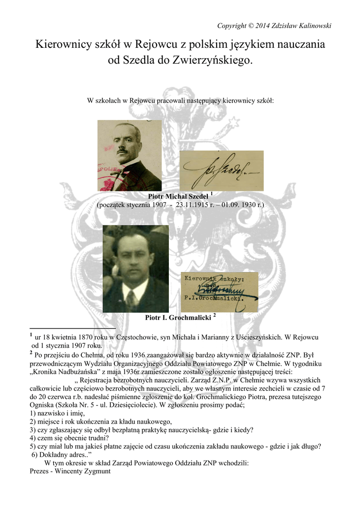 Copyright © 2014 Zdzisław Kalinowski Kierownicy szkół w Rejowcu z polskim językiem nauczania od Szedla do Zwierzyńskiego. W szkołach w Rejowcu pracowali następujący kierownicy szkół: Piotr Michał Szedel 1 (początek stycznia 1907 - 23.11.1915 r. – 01.09. 1930 r.) Piotr I. Grochmalicki 2 ur 18 kwietnia 1870 roku w Częstochowie, syn Michała i Marianny z Uścieszyńskich. W Rejowcu od 1 stycznia 1907 roku. 2 Po przejściu do Chełma, od roku 1936 zaangażował się bardzo aktywnie w działalność ZNP. Był przewodniczącym Wydziału Organizacyjnego Oddziału Powiatowego ZNP w Chełmie. W tygodniku „Kronika Nadbużańska” z maja 1936r zamieszczone zostało ogłoszenie następującej treści: „ Rejestracja bezrobotnych nauczycieli. Zarząd Z.N.P. w Chełmie wzywa wszystkich całkowicie lub częściowo bezrobotnych nauczycieli, aby we własnym interesie zechcieli w czasie od 7 do 20 czerwca r.b. nadesłać piśmienne zgłoszenie do kol. Grochmalickiego Piotra, prezesa tutejszego Ogniska (Szkoła Nr. 5 - ul. Dziesięciolecie). W zgłoszeniu prosimy podać; 1) nazwisko i imię, 2) miejsce i rok ukończenia za kładu naukowego, 3) czy zgłaszający się odbył bezpłatną praktykę nauczycielską- gdzie i kiedy? 4) czem się obecnie trudni? 5) czy miał lub ma jakieś płatne zajęcie od czasu ukończenia zakładu naukowego - gdzie i jak długo? 6) Dokładny adres..” W tym okresie w skład Zarząd Powiatowego Oddziału ZNP wchodzili: Prezes - Wincenty Zygmunt 1 Copyright © 2014 Zdzisław Kalinowski Przewodniczący Wydz. Organ. - Piotr Grochmalicki Przewodniczący Wydz. Pedagog. - Stanisława Osińska Przewodniczący Pracy Społecz. - Kazimierz Sowa Przewodniczący Wydz. Finansowego - Władysław Kalita Komisja Kontrolująca - Kruczek, Luszawski, Drewnowski Prezes Sądu Organizacyjnego - Jan Szybowicz Delegat na Sesję Organizacyjną Zjazdu Delegatów - Władysław Głowacki, Fidam Franecki. Współorganizator wiecu nauczycielskiego 13 października 1937 roku w obronie ZG ZNP, Urząd Wojewódzki w dniu 12 października uzyskał informację, że na 13 października 1937 roku zapowiedziane zostało w Chełmie publiczne zgromadzenie na placu przed pomnikiem poległych o wyzwolenie Ojczyzny. J. Kusz ( też były nauczyciel w Rejowcu) opisał to w następujący sposób: (…) „Panowie Wincenty Zygmunt i Piotr Grochmalicki udali się do starostwa o wyrażenie zgody na zgromadzenie publiczne przedstawiając stosowny program wiecu. Zastępca starosty zabronił urządzania jakichkolwiek manifestacji publicznych a nawet składania wieńców pod pomnikiem Józefa Piłsudskiego. W tej sytuacji manifestację zorganizowano w kinie „Apollo”. Przewodniczący W. Zygmunt i P. Grochmalicki podkreślali znaczenie pracy zawodowej i społecznej nauczycieli, ich cierpliwość w stosunkach do polityki rządu – przejawiający się w prześladowaniu nauczycielskich władz ZNP i szkalowania nauczycieli. Zebrani uchwalili rezolucję protestacyjną wysłana do Prezydenta Marszałka Rydza-Śmigłego i innych”. Po jego zawieszeniu przez premiera Sławoja-Składkowskiego. Kierował szkołą powszechną im. Króla Kazimierza Wielkiego w Chełmie w okresie od 30.06.1932 do 31.08.1938 roku. Poza tymi suchymi faktami nic więcej o nim nie wiemy (jedynie tylko jego podpisy zachowały się w dokumentacji szkolnej). Rozpłynął się jak gdyby we mgle minionego czasu. Brakuje podstawowych danych osobowych, przebiegu pracy zawodowej. W zachowanej kronice Szkoły Powszechnej nr.5 przy ul. Sportowej w Białej Podlaskiej, której kierownikiem szkoły w latach 1937 – 1939 był Piotr Grochmalicki. Istnieje po wrześniu 1939 roku następująca: (…) „Z powodu nieobecności kierownika szkoły Piotra Grochmalickiego stanowisko to obejmuje kierownik szkoły nr. 3 Stanisław Dmiski” Prawdopodobnie miał być w czasie okupacji niemieckiej aresztowany i osadzony w obozie zagłady w Sachsenhausen. Po wyzwoleniu obozu w 1945 roku powrócił do Chełma. Poszukiwania prowadziliśmy w archiwach: Związku Nauczycielstwa Polskiego Zarząd Okręgu Lubelskiego ul Akademicka 4, Związku Nauczycielstwa Polskiego Zarząd Oddziału w Chełmie i Krasnymstawie, Biurze Informacji i Poszukiwań PCK w Warszawie ul. Mokotowska 14, które niewiele wniosły do sprawy. Natomiast zapytania kierowane do Kuratorium Oświaty w Kielcach, Inspektorat Oświaty w Sandomierzu, Archiwum Państwowe w Lublinie Oddział Chełmie, Archiwum Państwowe w Lublinie oraz Archiwum Państwowym w Kielcach oddział w Sandomierzu ul. Żydowska 4, Archiwum Państwowe w Kielcach ul Warszawska 17 przyniosły cząstkowe wiadomości o jego powojennych losach. W Archiwum Państwowym w Kielcach w zespole akt Kuratorium Okręgu Szkolnego w Kielcach z lat 1945 - 1950 sygn. 157 i 158 - wykazy imienne obsady etatów urzędników i niższych funkcjonariuszy w Inspektoratach Szkolnych Kuratorium w Kielcach (tabelaryczne) znajdują się zapisy, że Piotr Grochmalicki urodzony w 1901 roku, posiadający 6 grupę uposażenia zatrudniony był w powiecie sandomierskim, jako podinspektor szkolny. W powyższych wykazach nie zawarto innych dodatkowych informacji. Udało się jedynie ustalić, że mieszkał w Rzeszowie. W Archiwum Państwowym w Rzeszowie w zasobie, teczce WKKP w Rzeszowie sygnatura 58/1246/0/687, 7595 znajduje się uchwała Wojewódzkiej Komisji Kontroli Partyjnej w Rzeszowie z 1950 roku, w, której możemy wyczytać, że Piotr Grochmalicki był synem Franciszka, ur. dnia 25 VI 1901 roku w Błażowej, pochodzenia chłopskiego, członek PPR. Od 1947 roku Kierownik Wydziału Oświaty Wojewódzkiej Rady Narodowej w Rzeszowie. Przez WKKP został obwiniony za intrygi i zaniedbania w pracy. Więcej na jego temat w zasobie – aktach WRN w Rzeszowie oraz teczce osobowej / zespół nr. 1246 syg. 4092 /. Po wojnie pracując w województwie rzeszowskim opublikował artykuły w tamtejszej prasie. Wojewódzka i Miejska Biblioteka Publiczna w Rzeszowie W opracowaniu zat